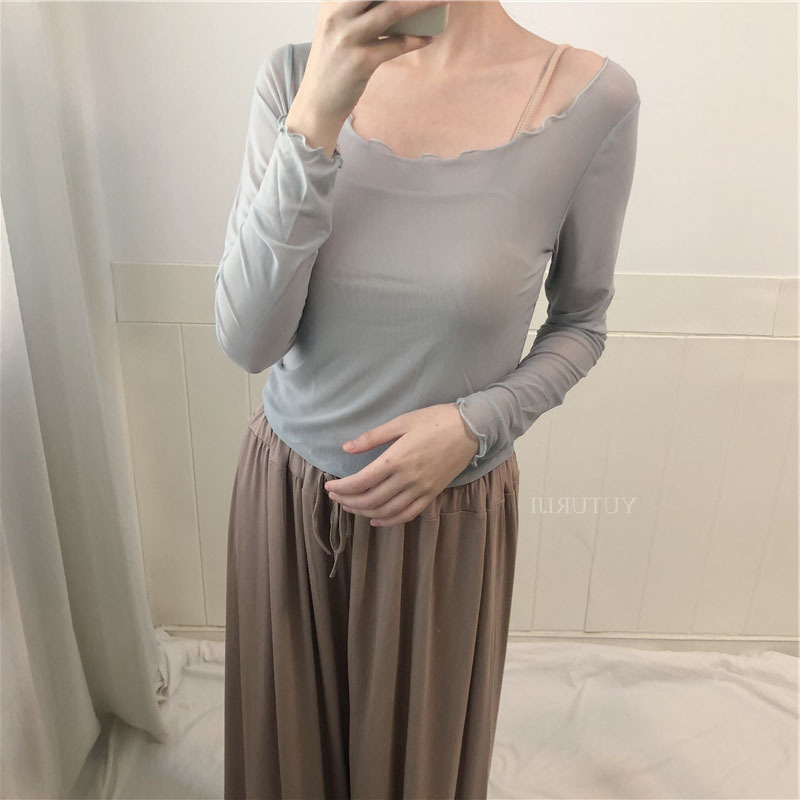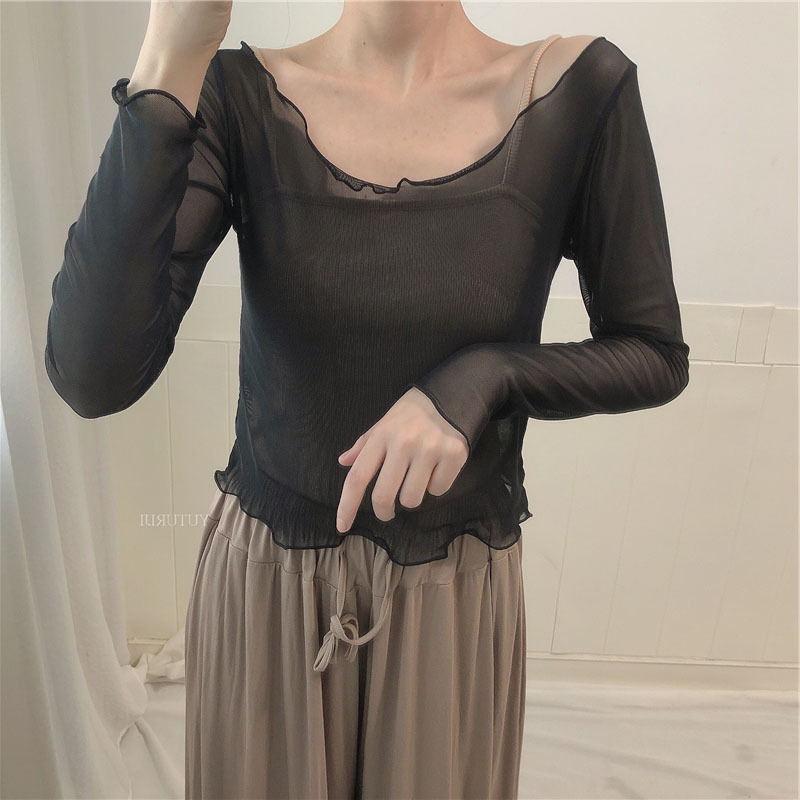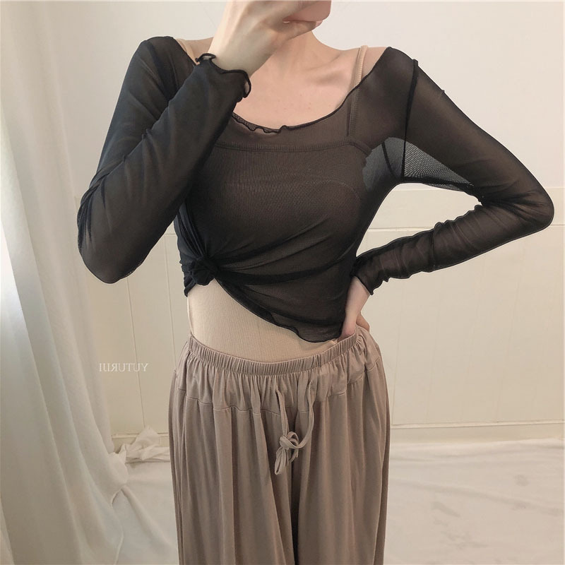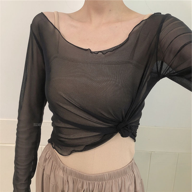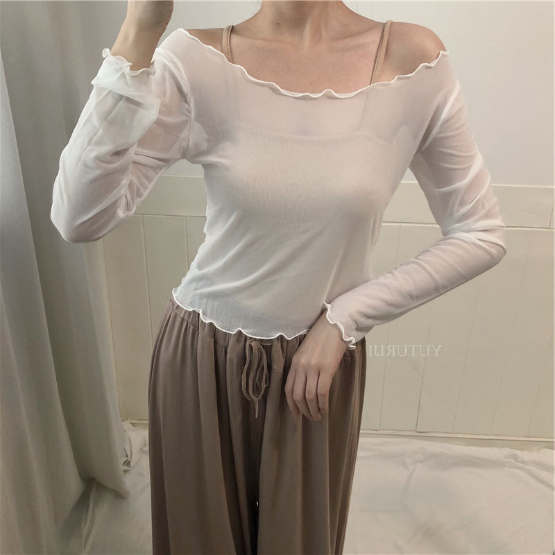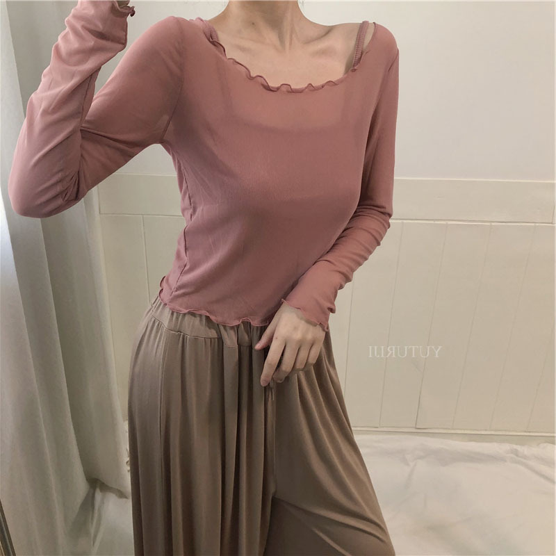 낮은 칼라 메쉬베이스 셔츠 여성의 봄과 가을 큰 목 얇은 셔츠 참조 긴 소매 클래식 댄스 레이스 탑