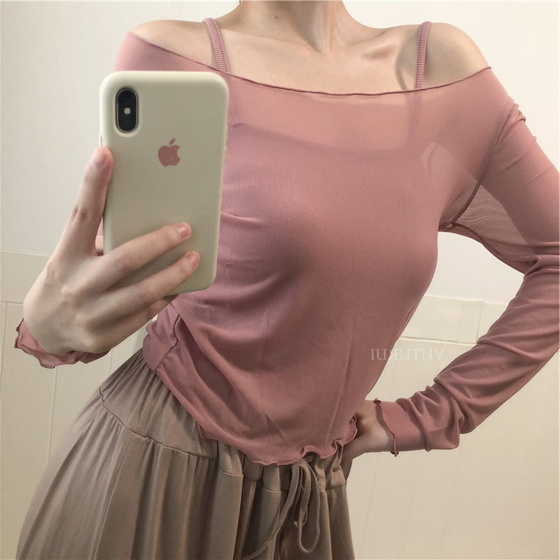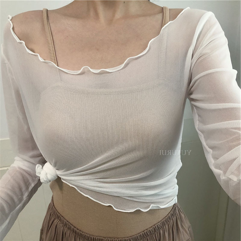 낮은 칼라 메쉬베이스 셔츠 여성의 봄과 가을 큰 목 얇은 셔츠 참조 긴 소매 클래식 댄스 레이스 탑스토어 가기
