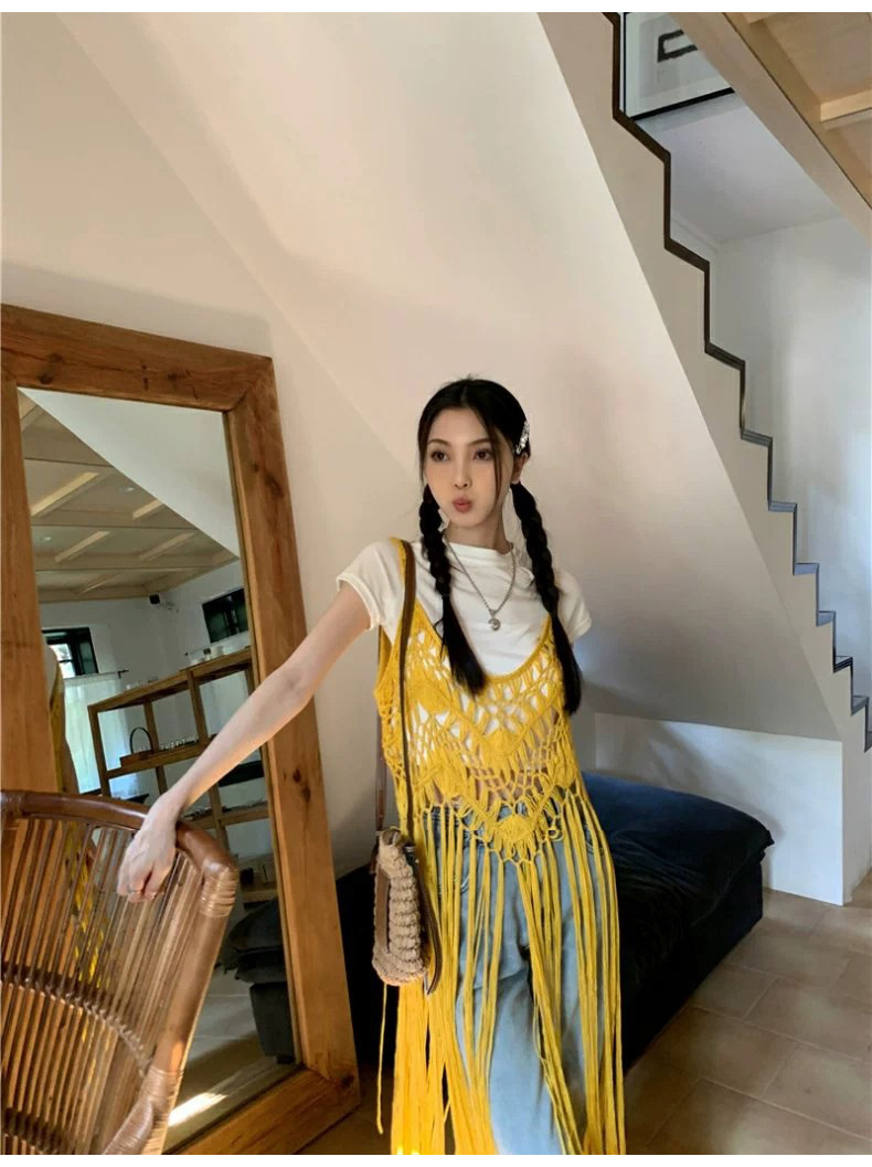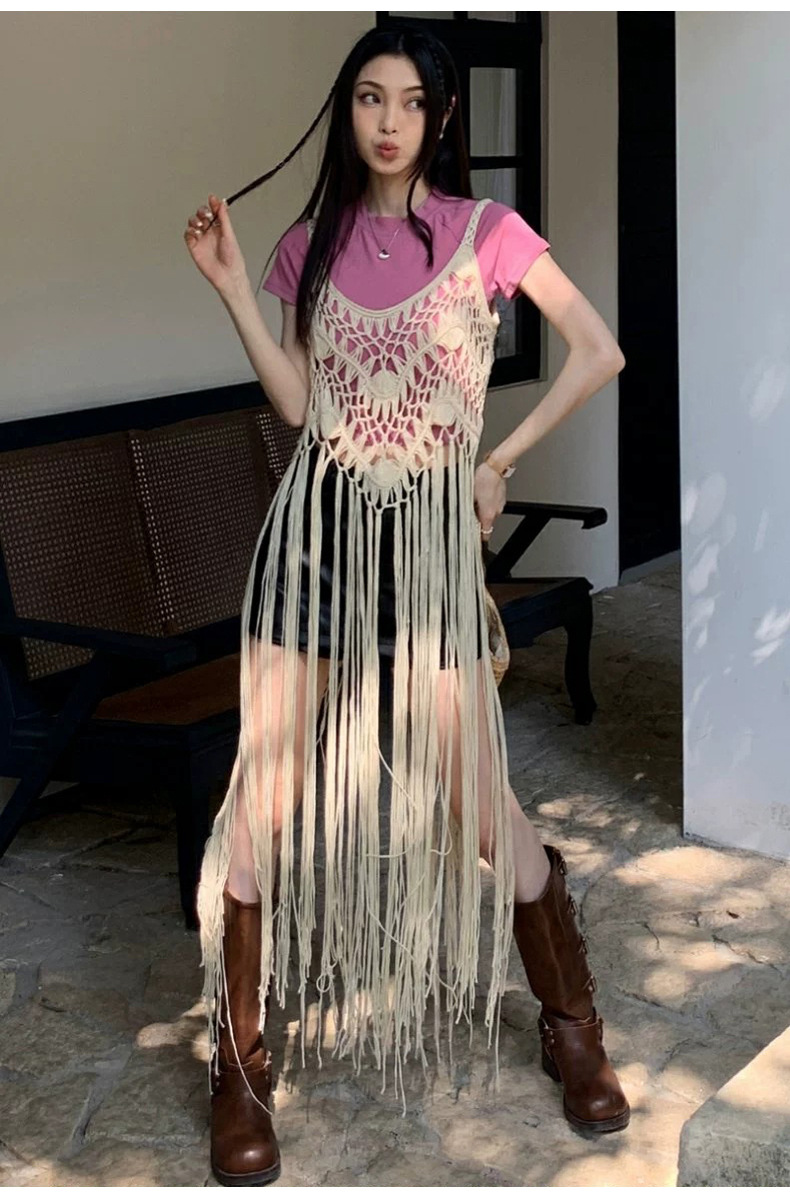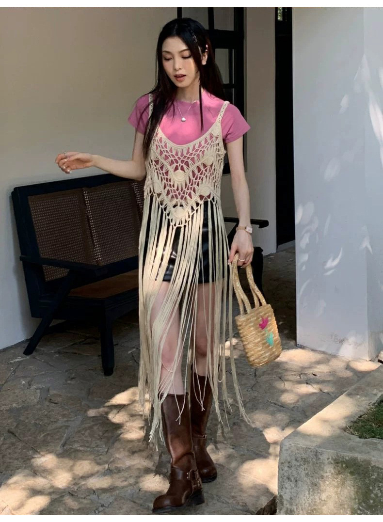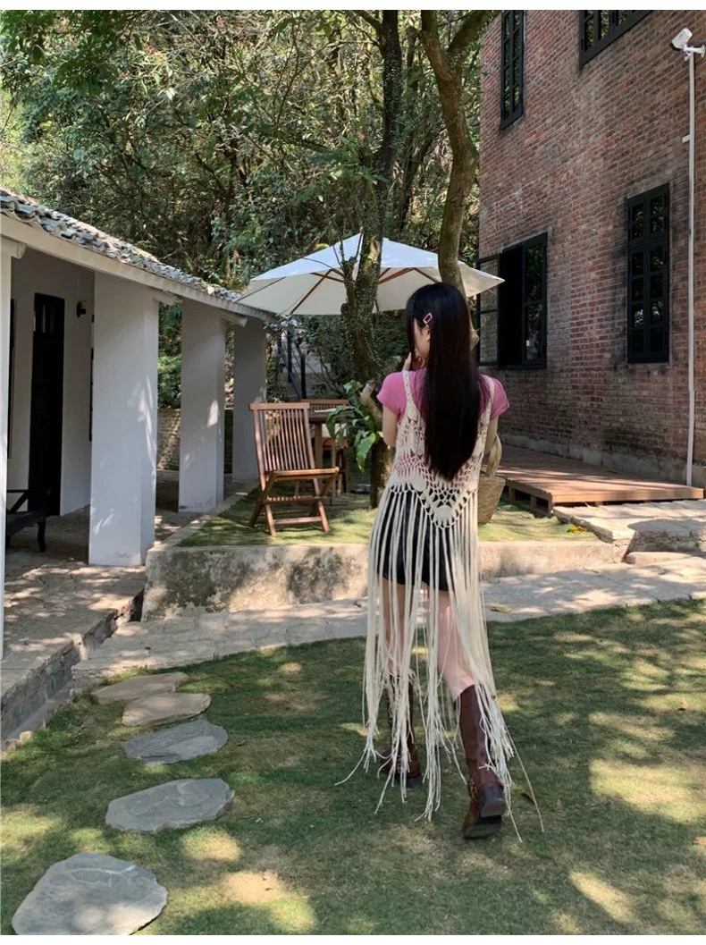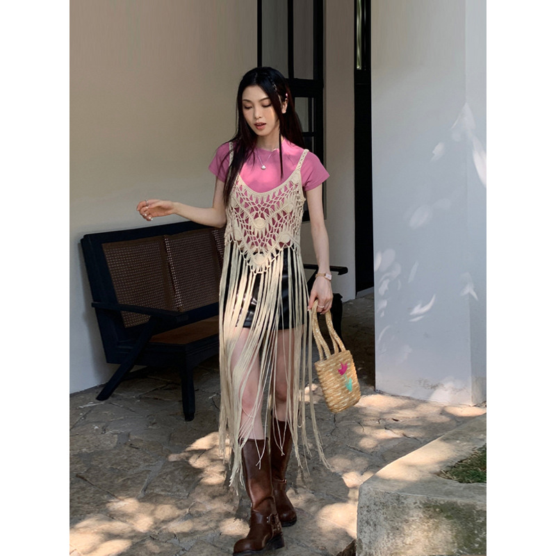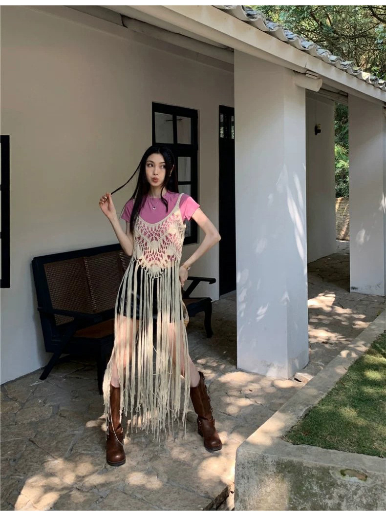 봄 2025 새로운 패션 디자인 센스 수제 크로 셰 티드 술 보헤미안 스타일 슬링 외부 셔츠 원피스 여성스토어 가기