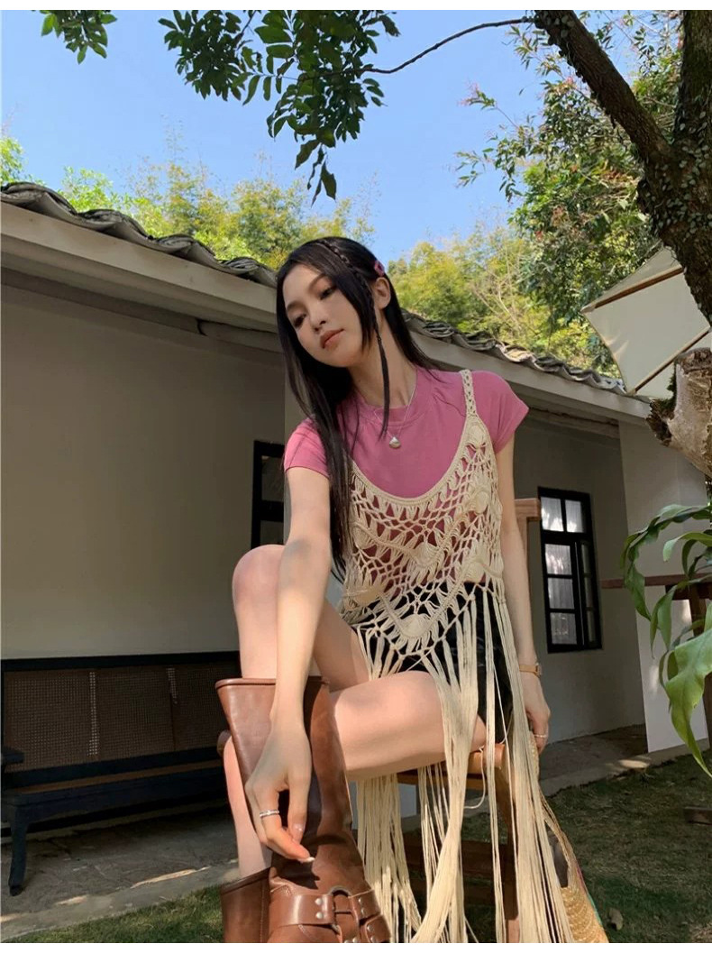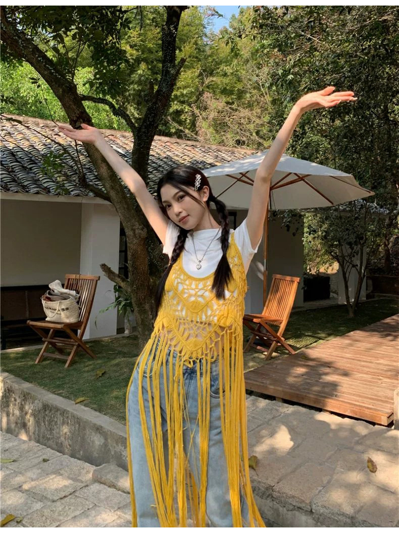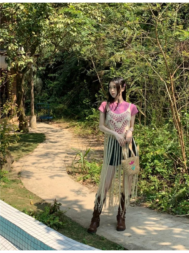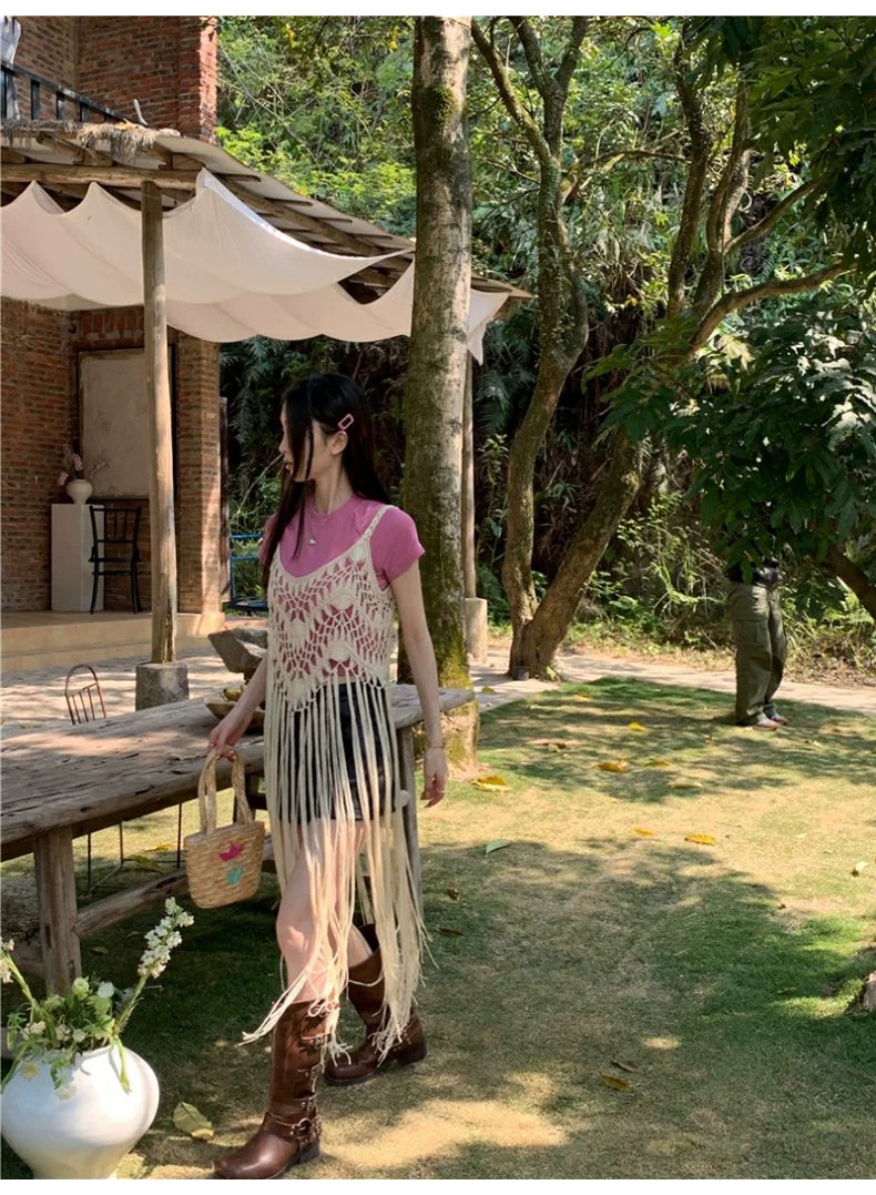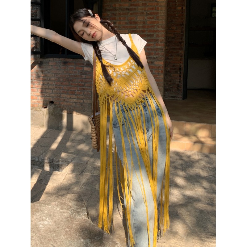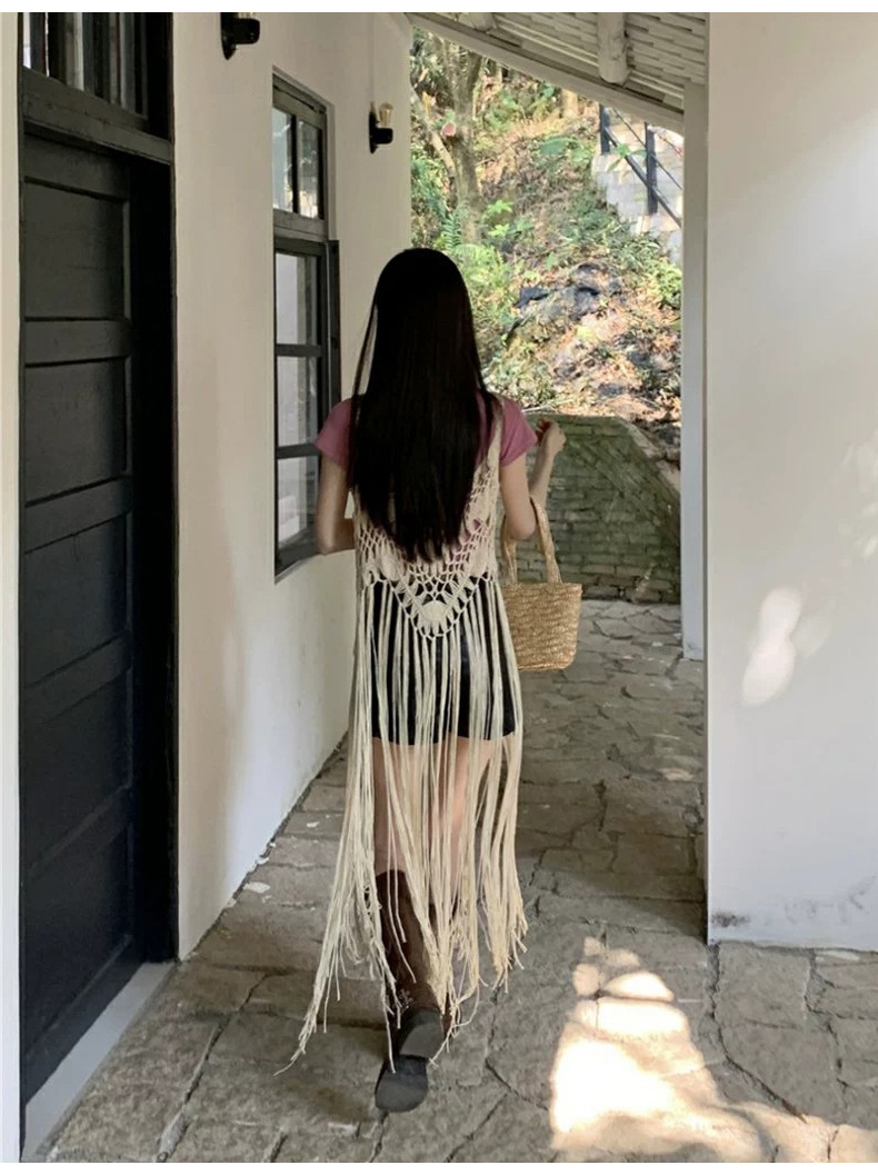 봄 2025 새로운 패션 디자인 센스 수제 크로 셰 티드 술 보헤미안 스타일 슬링 외부 셔츠 원피스 여성스토어 가기