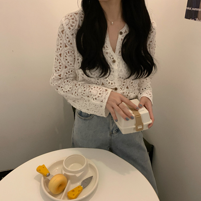 긴 소매 할로우 아웃 니트 카디건 여성 여름 외부 새 크로 셰 뜨개질 짧은 세련된 작은 셔츠 치마 에어컨 탑 착용