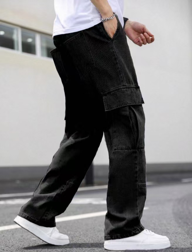 신상 남성용 사계절 블랙 스트레이트핏 멀티포켓 캐주얼 다용도 스플라이싱 워싱 가공 아메리칸 스타일 청바지스토어 가기
