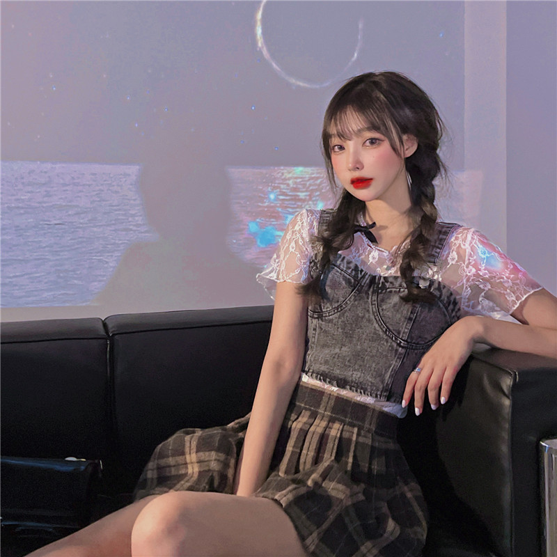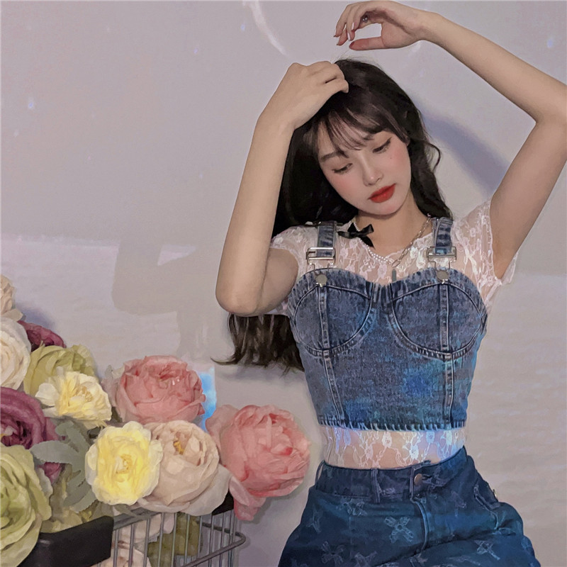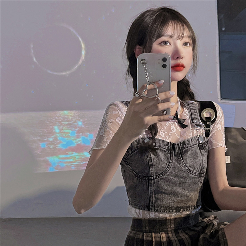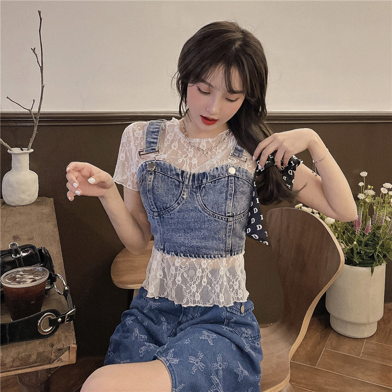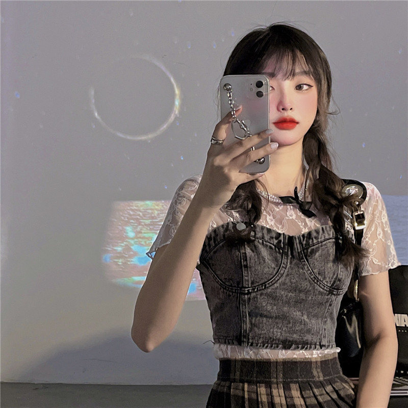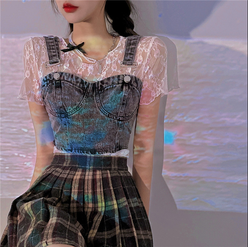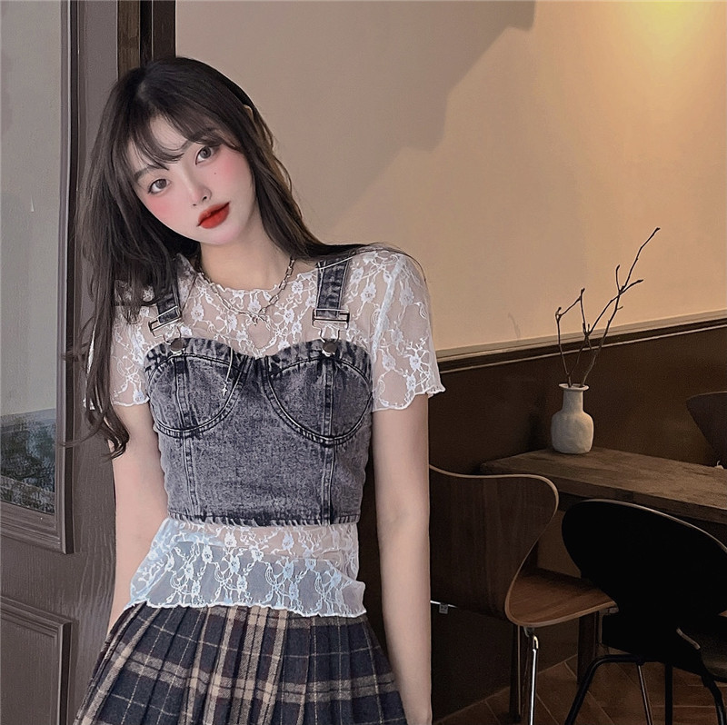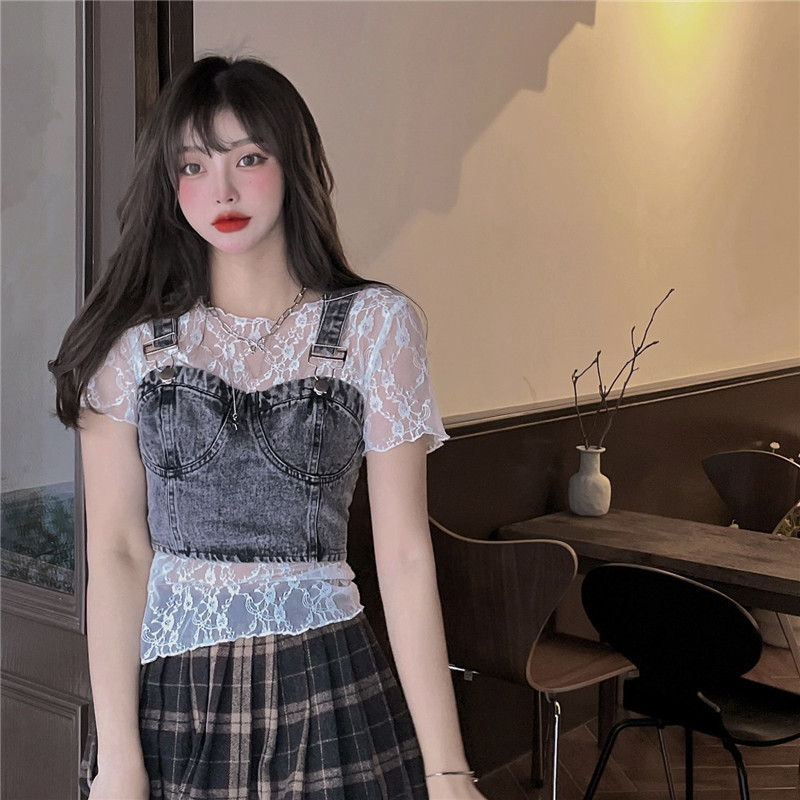 여성을위한 흰색 내부 짧은 상단 중공 스트레치 슬림 핏 얇은 반팔 레이스 셔츠스토어 가기