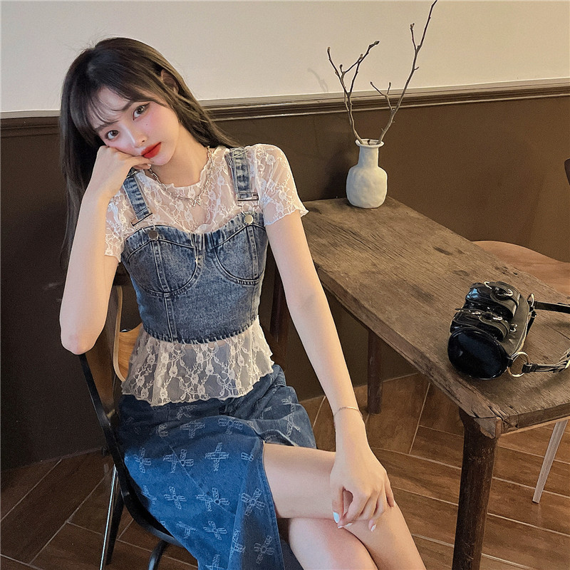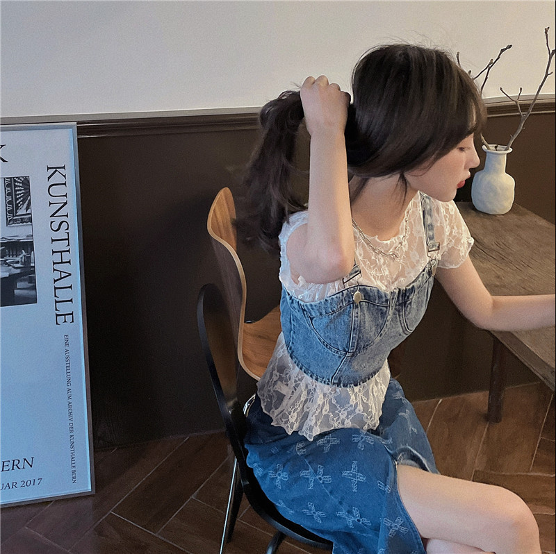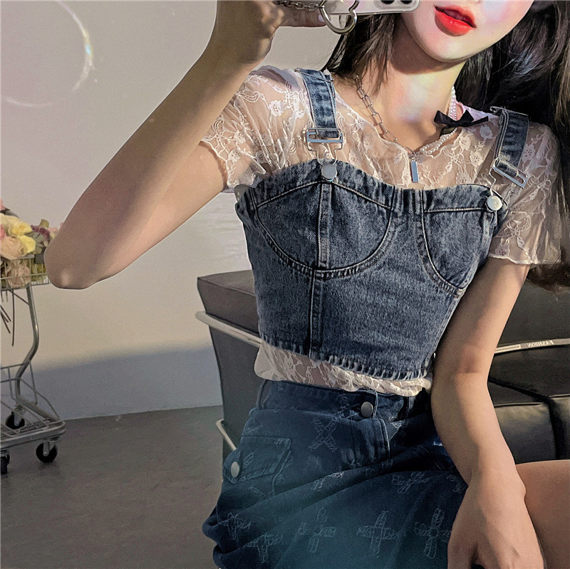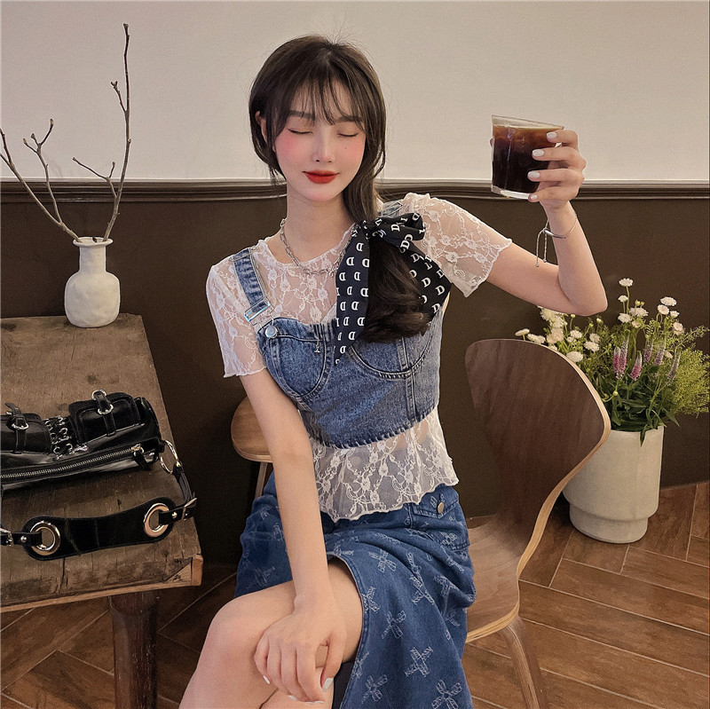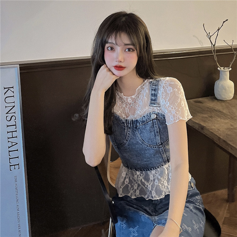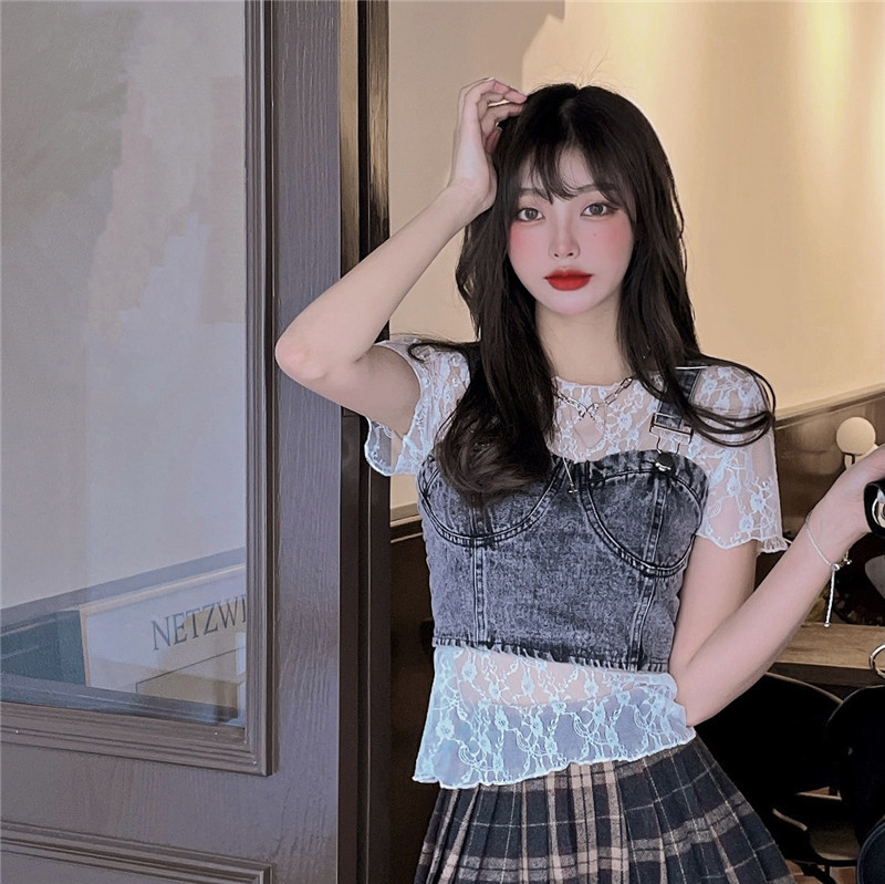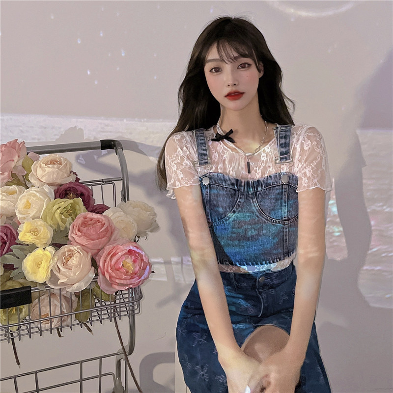 여성을위한 흰색 내부 짧은 상단 중공 스트레치 슬림 핏 얇은 반팔 레이스 셔츠