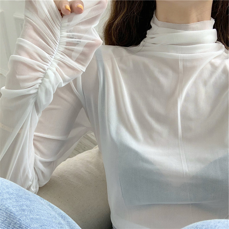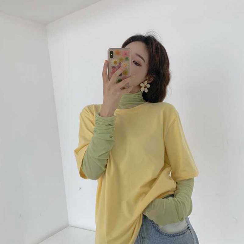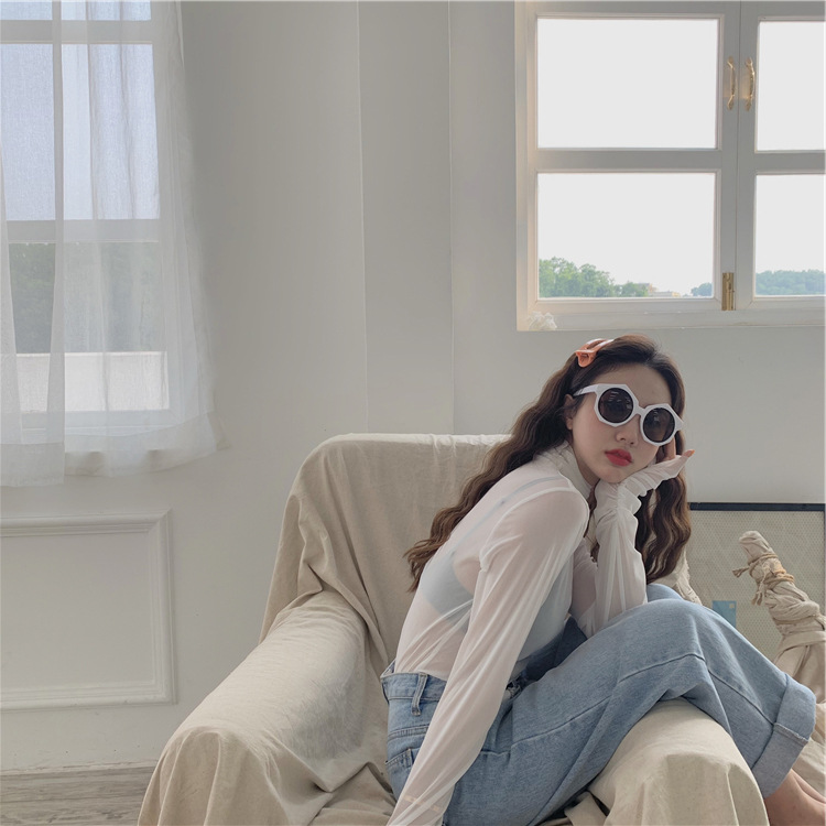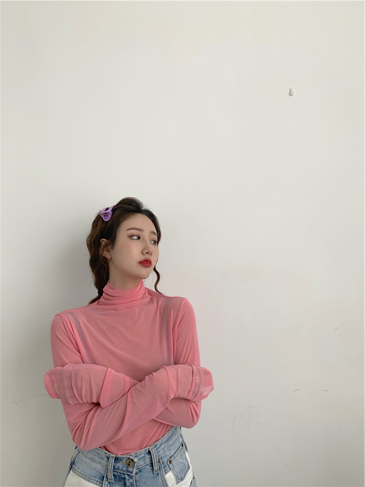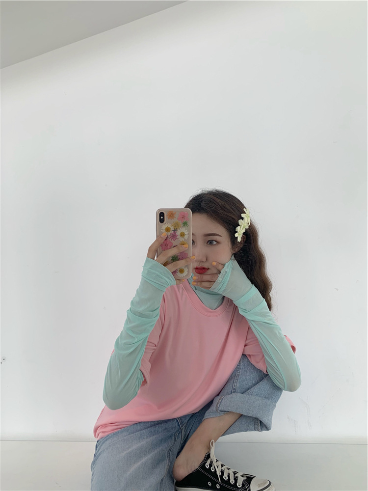 메쉬베이스 셔츠 여성용 얇은 여름 한국식 캔디 컬러 선 스크린 아이스 실크 긴팔 티셔츠 인사이드 탑