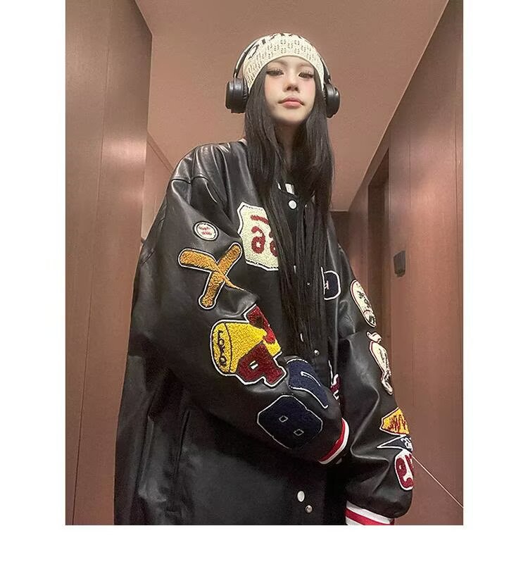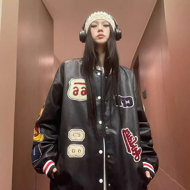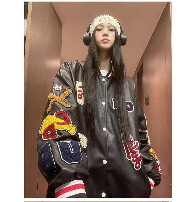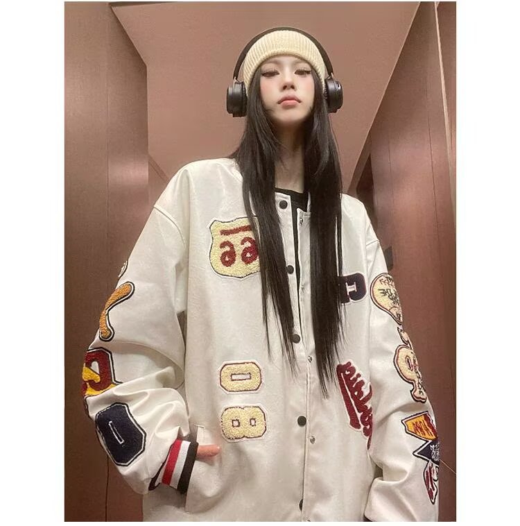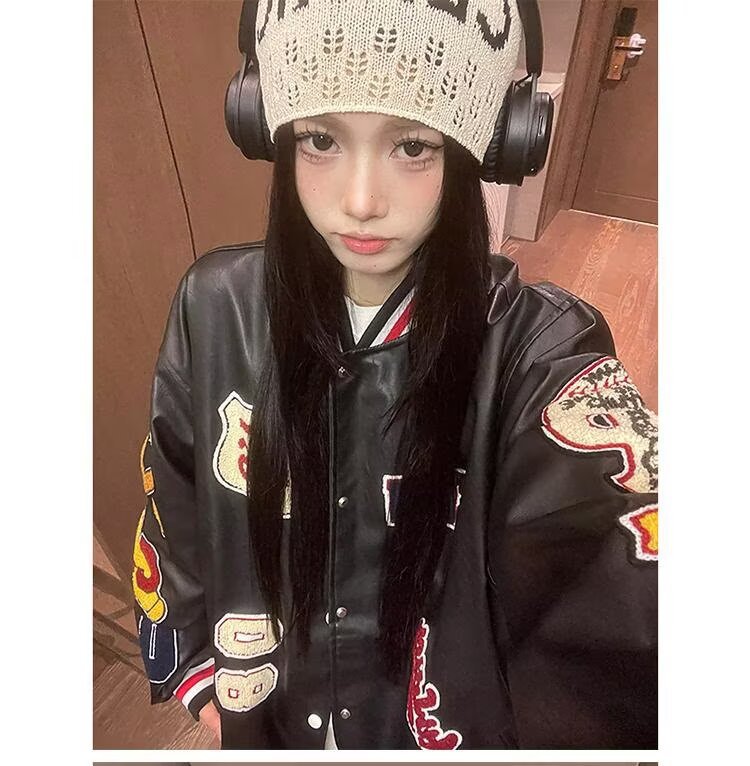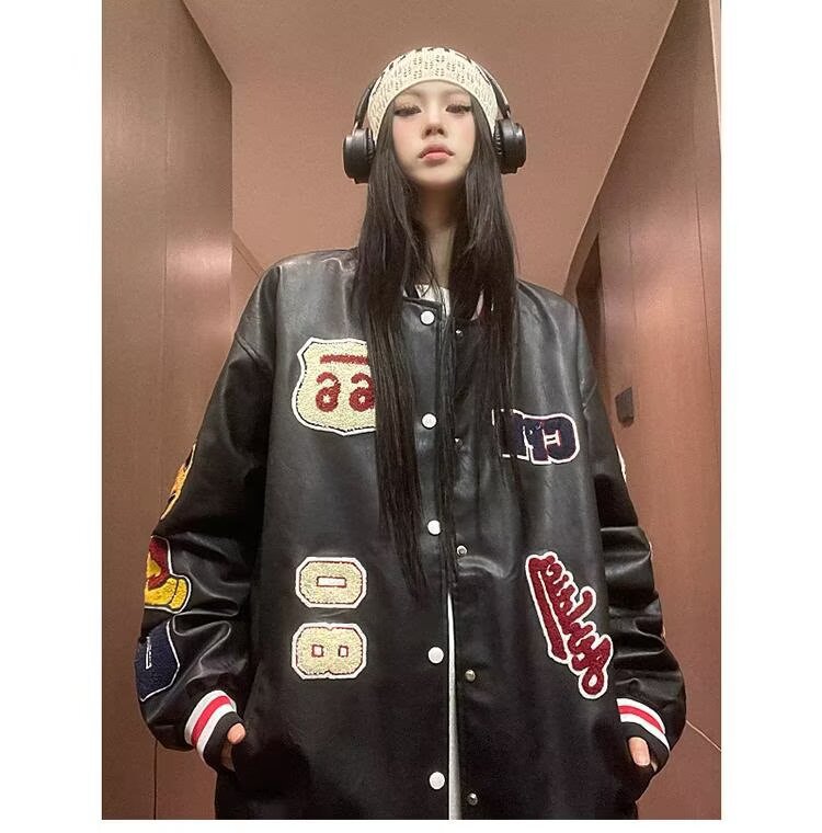 새로운 미국 스타일 중공업 자수 가죽 자켓 여성 캐주얼 짧은 재킷 야구 의류 가죽 짧은 재킷 느슨한 탑