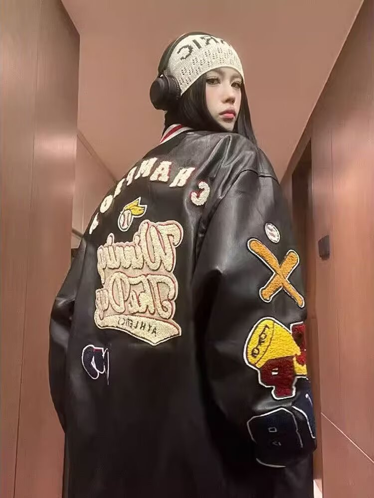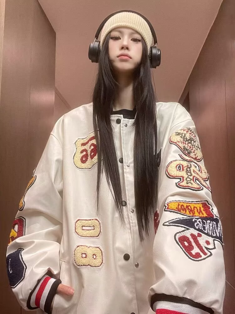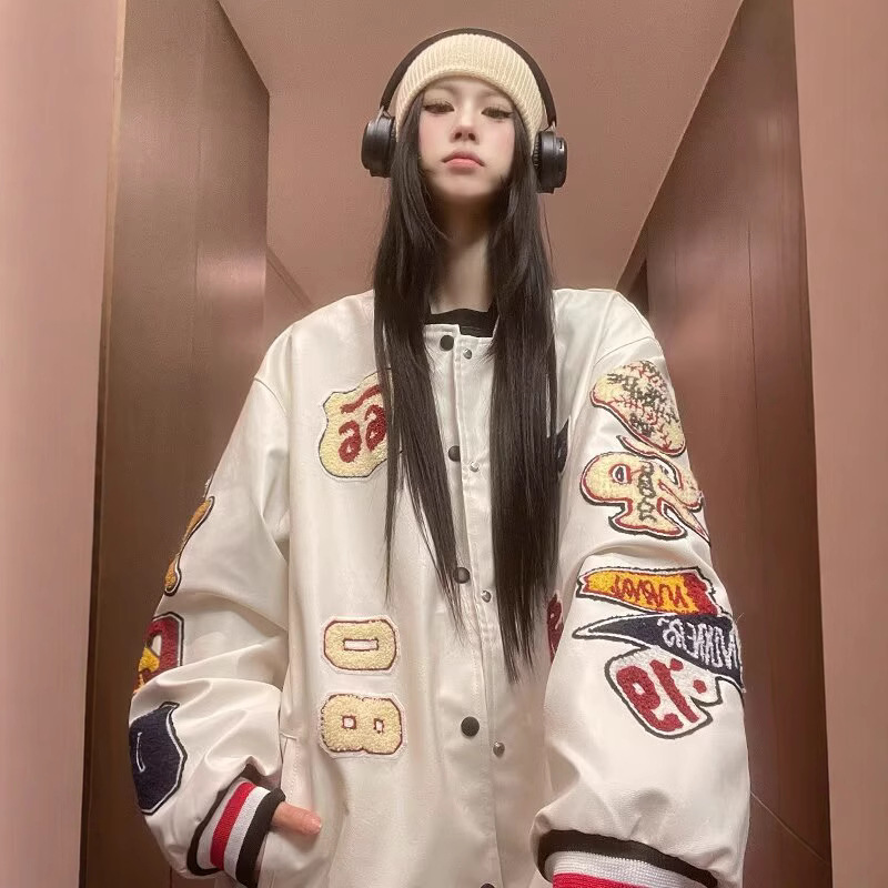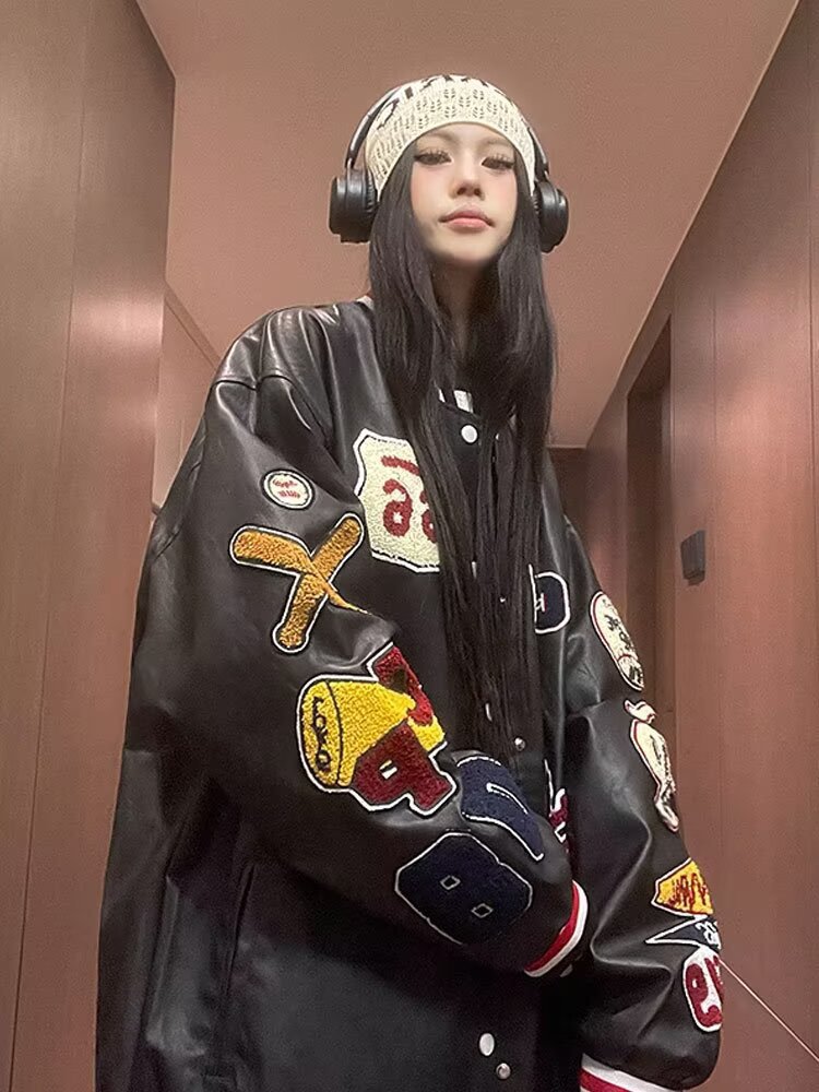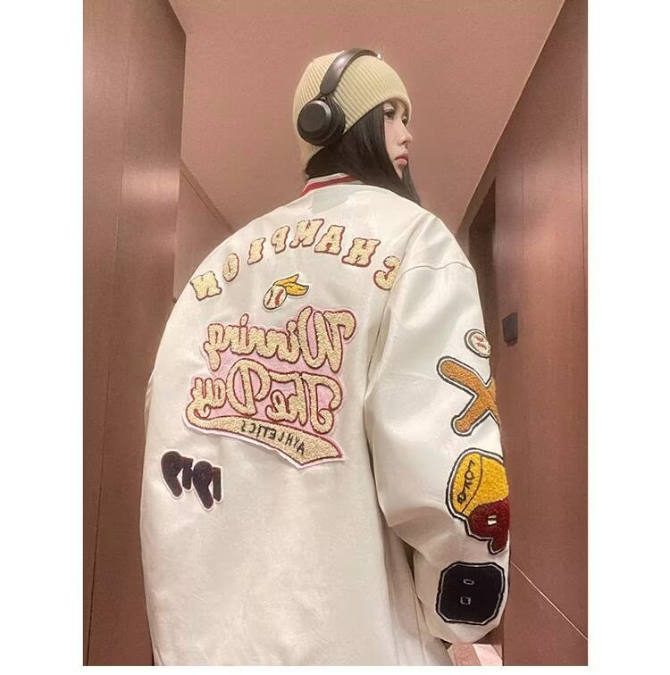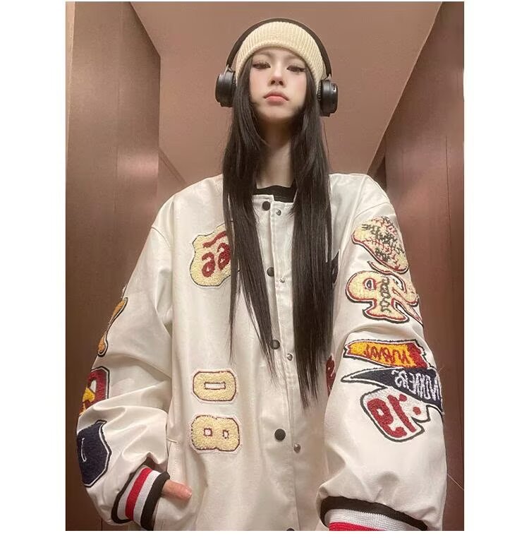 새로운 미국 스타일 중공업 자수 가죽 자켓 여성 캐주얼 짧은 재킷 야구 의류 가죽 짧은 재킷 느슨한 탑