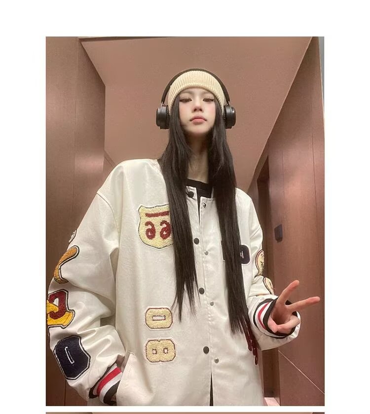 새로운 미국 스타일 중공업 자수 가죽 자켓 여성 캐주얼 짧은 재킷 야구 의류 가죽 짧은 재킷 느슨한 탑스토어 가기