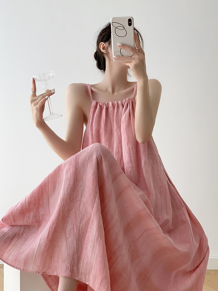 게으른 스타일 핑크 슬링 원피스 여성의 여름 새로운 세련된 느슨한 대형 스윙 원피스 주름 소매 어깨 스커트