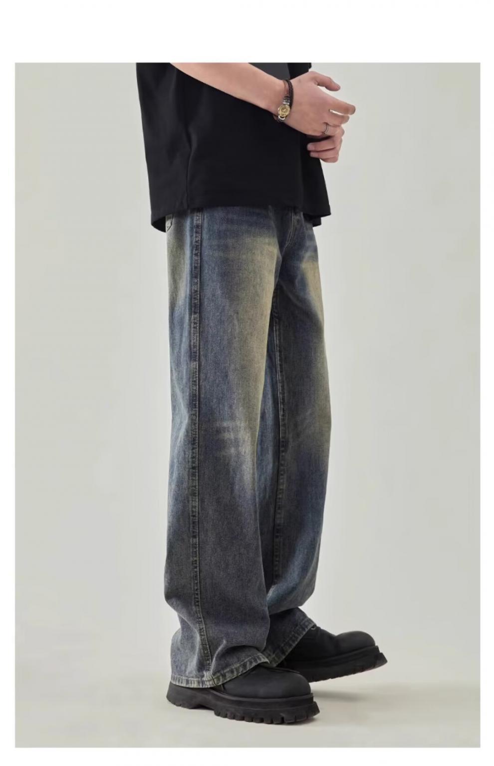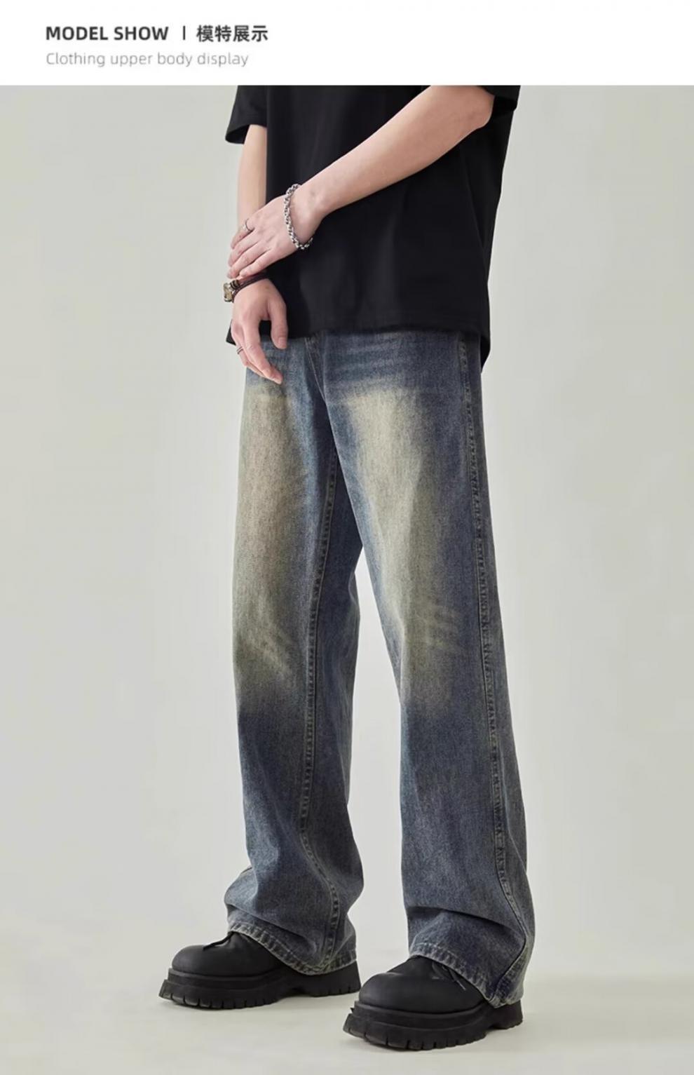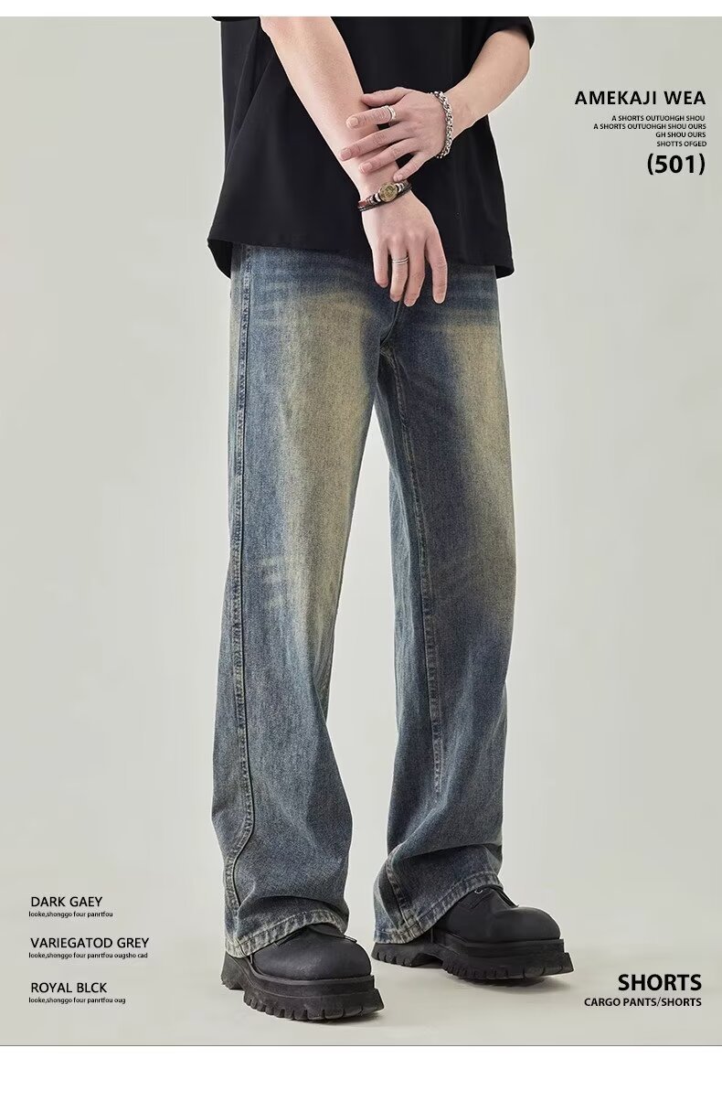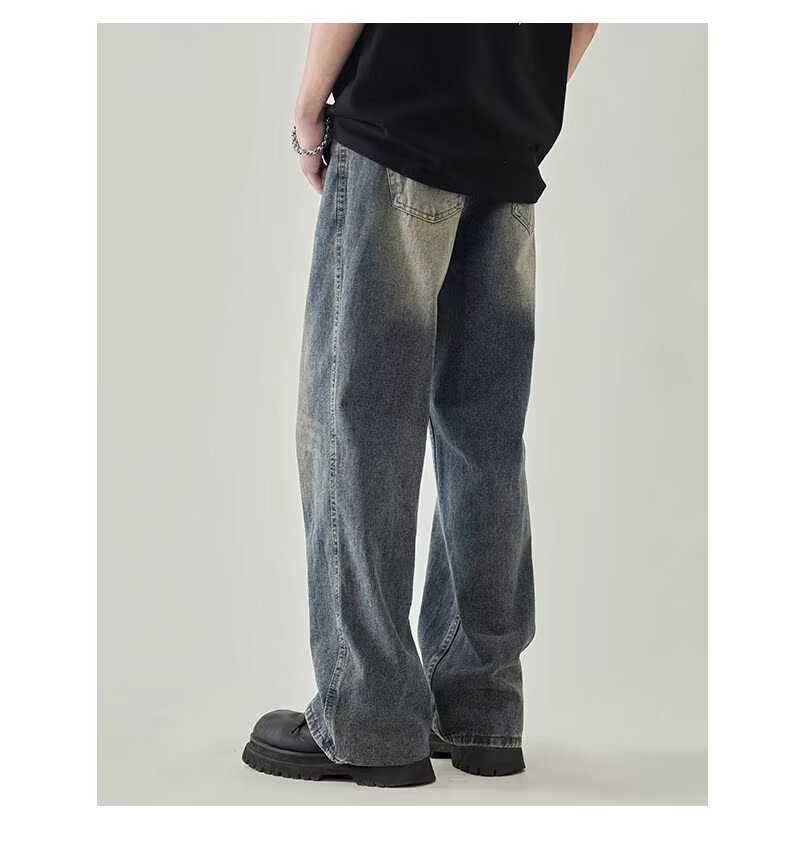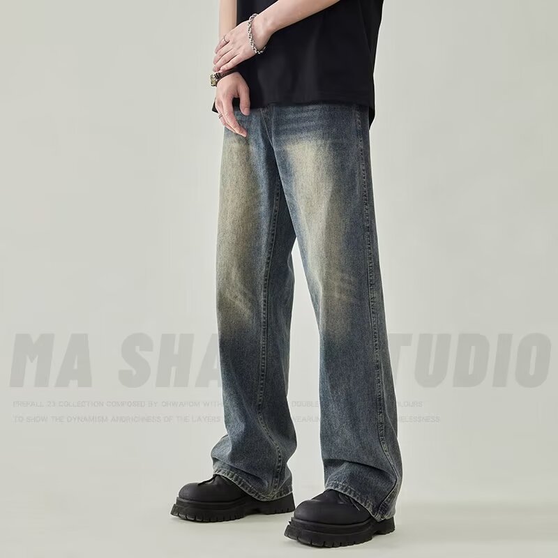 하이 스트리트 세탁 빈티지 블루 청바지 남성용 아메리칸 스타일 클린 핏 바지 유행 브랜드 슬리밍 스트레이트 바지스토어 가기