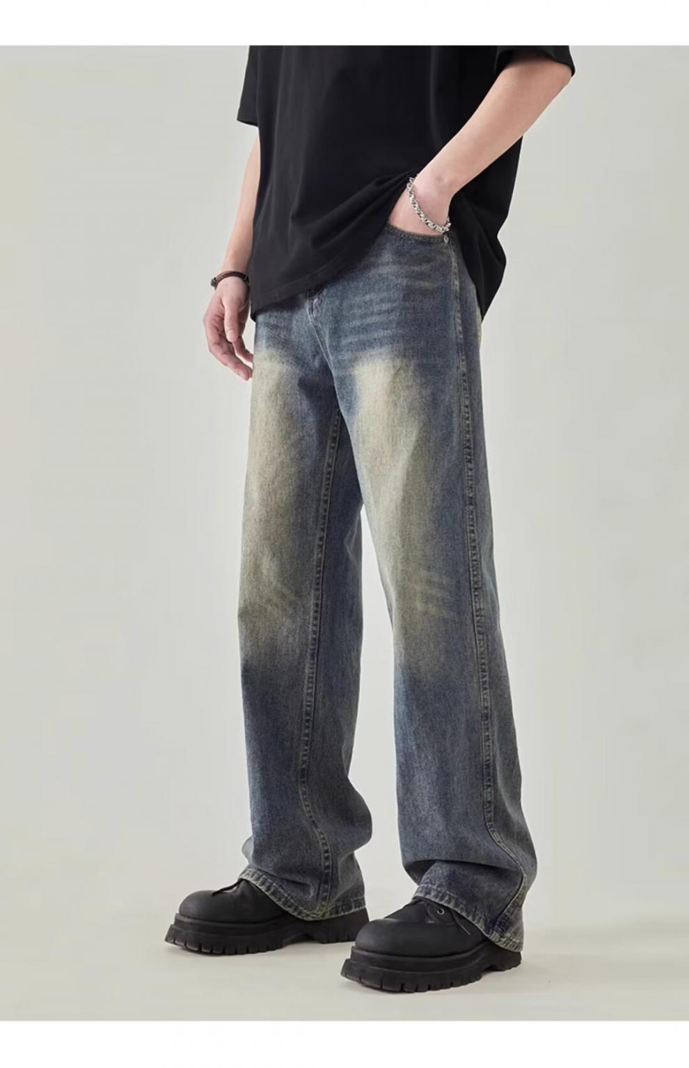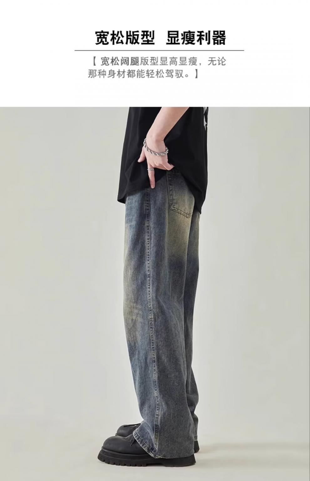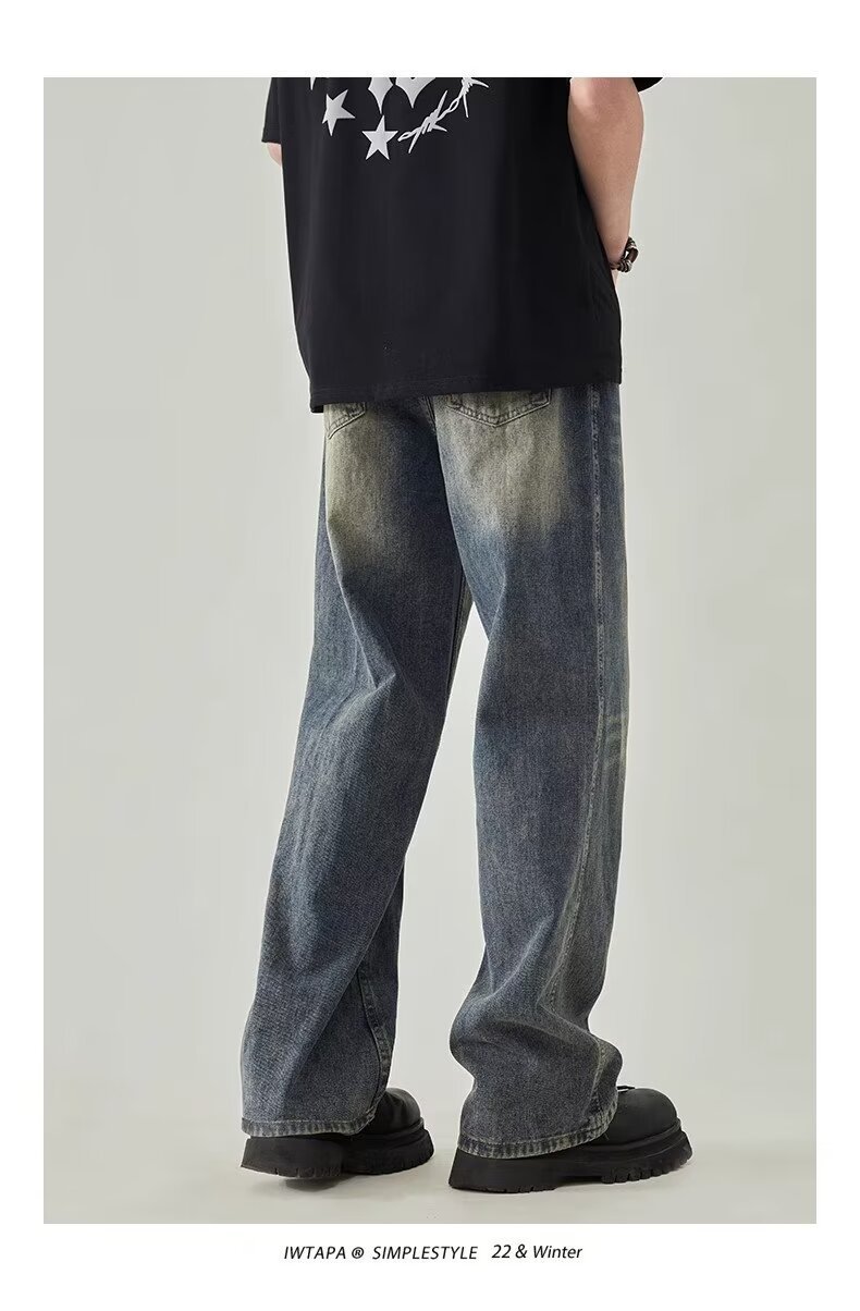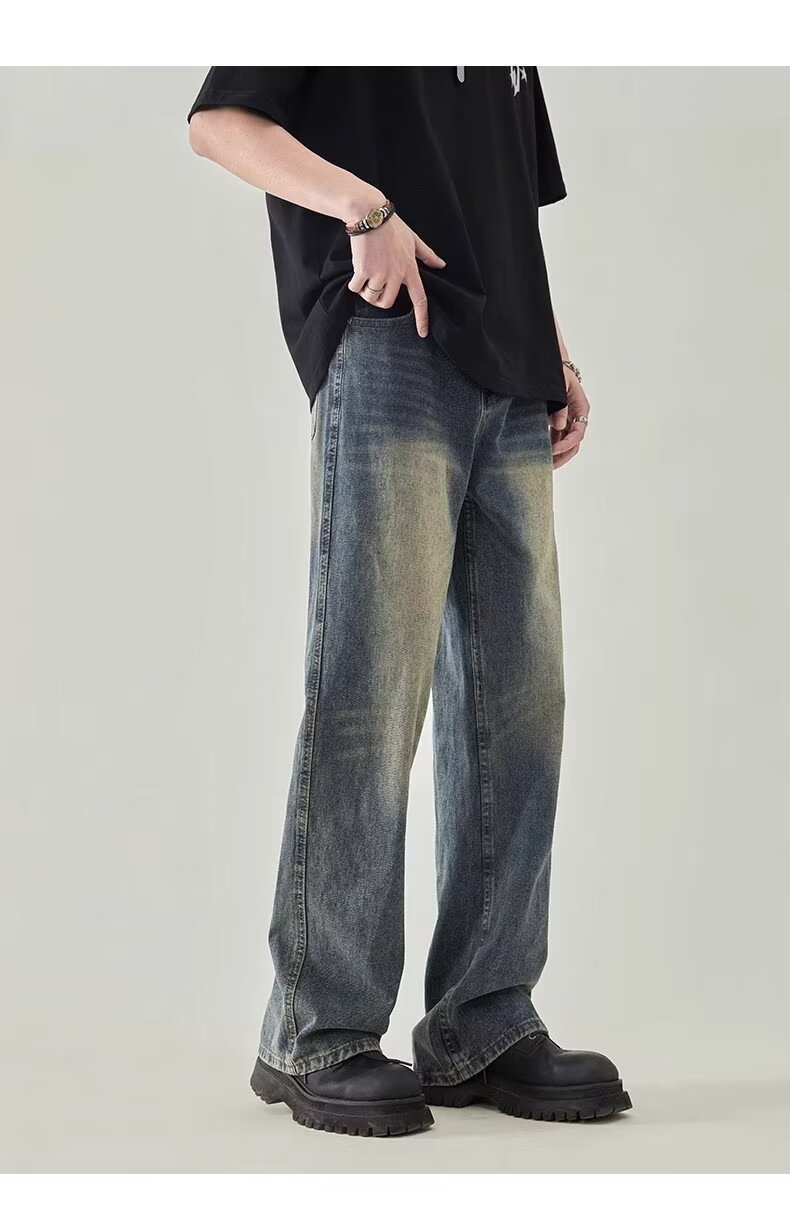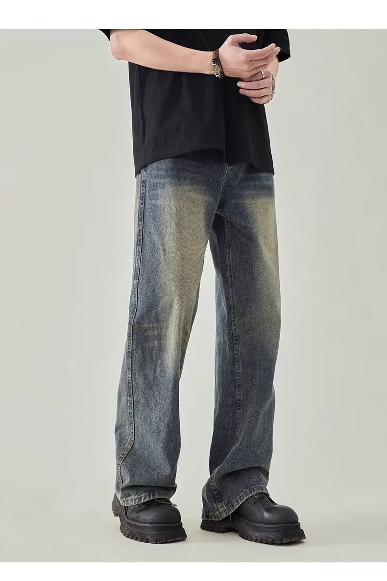 하이 스트리트 세탁 빈티지 블루 청바지 남성용 아메리칸 스타일 클린 핏 바지 유행 브랜드 슬리밍 스트레이트 바지스토어 가기