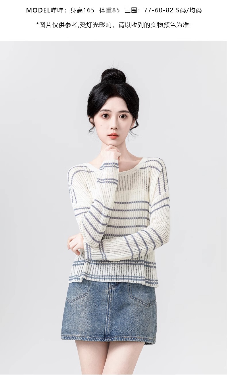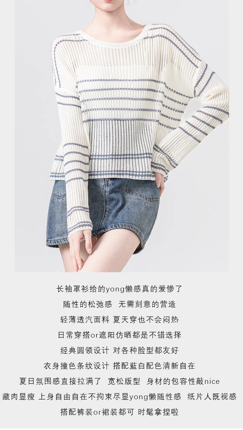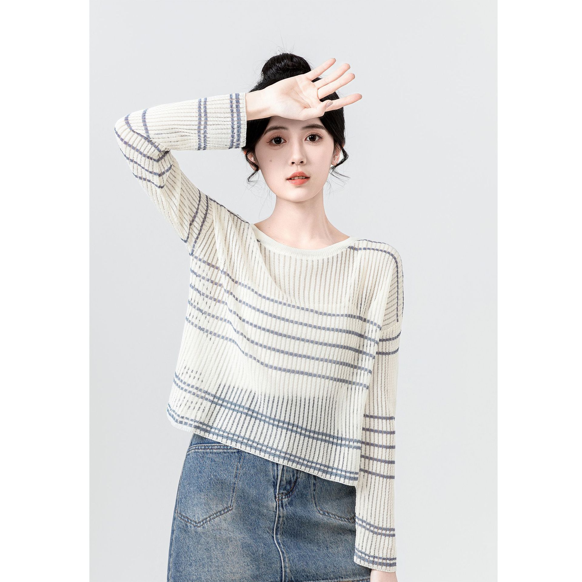 명암 줄무늬 얼음 실크 선 스크린 니트 블라우스 여성 봄 2025 새로운 내부 카미 솔 할로우 쇼트 탑스토어 가기