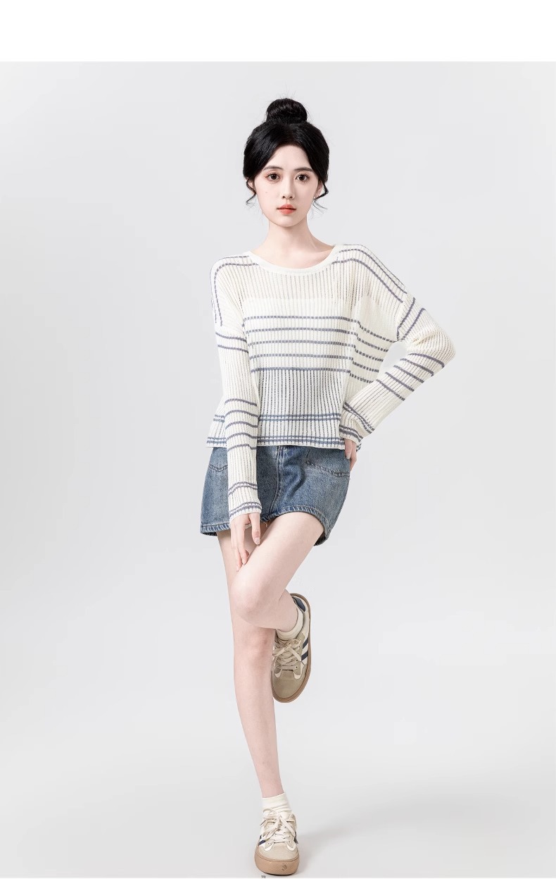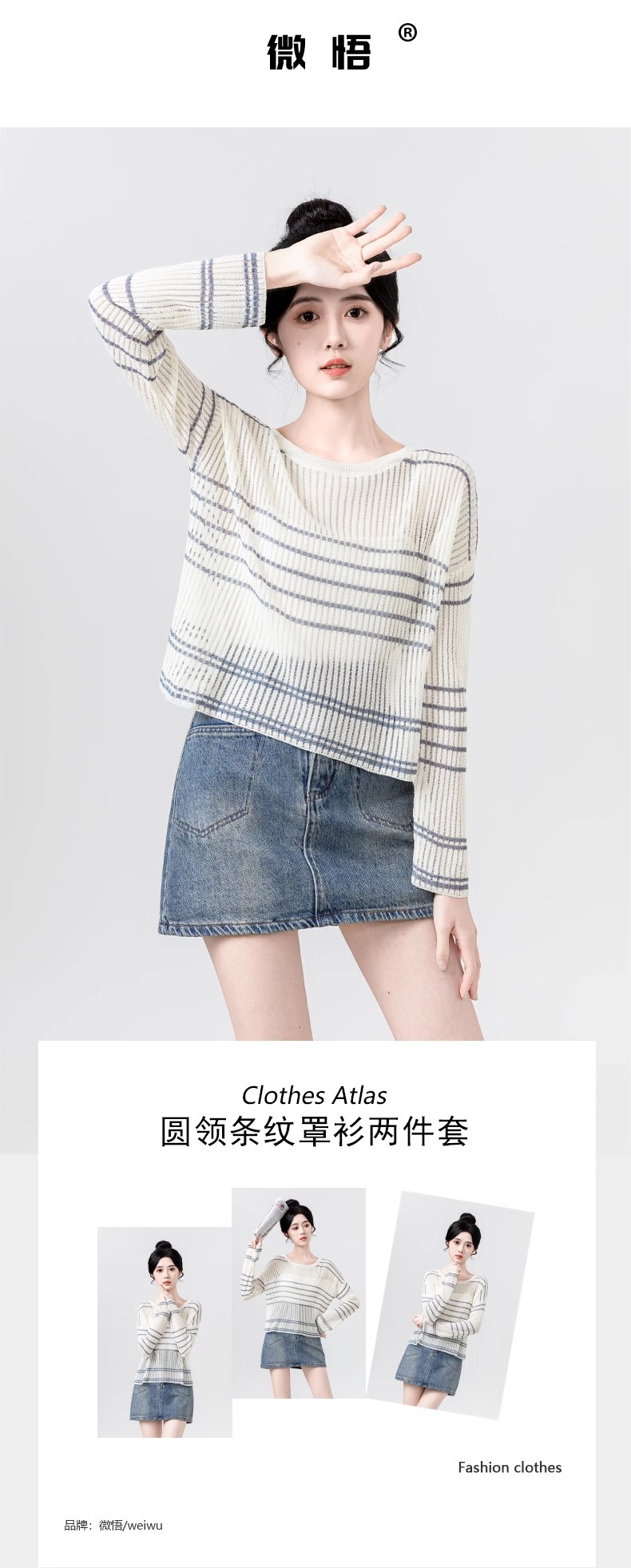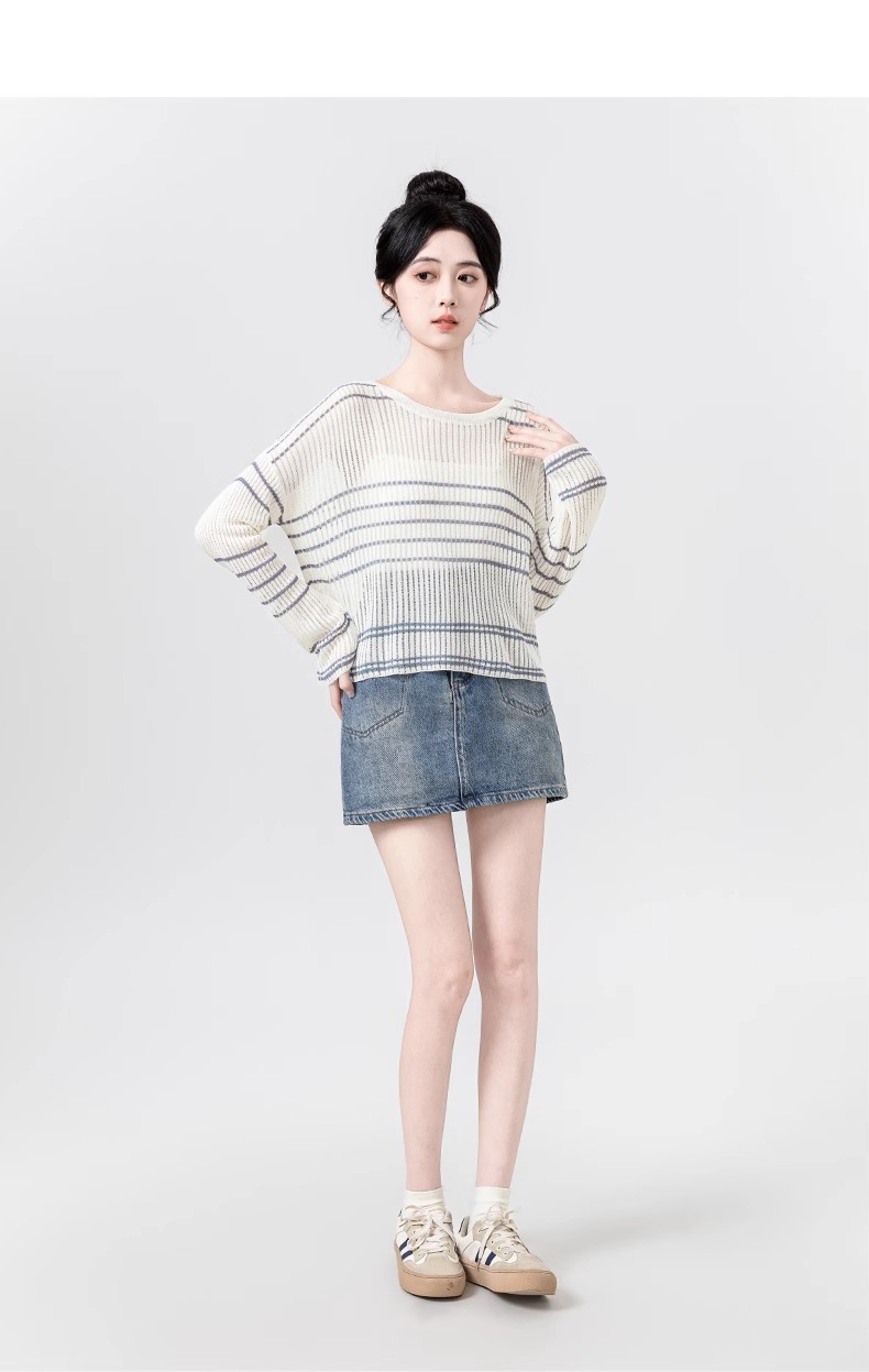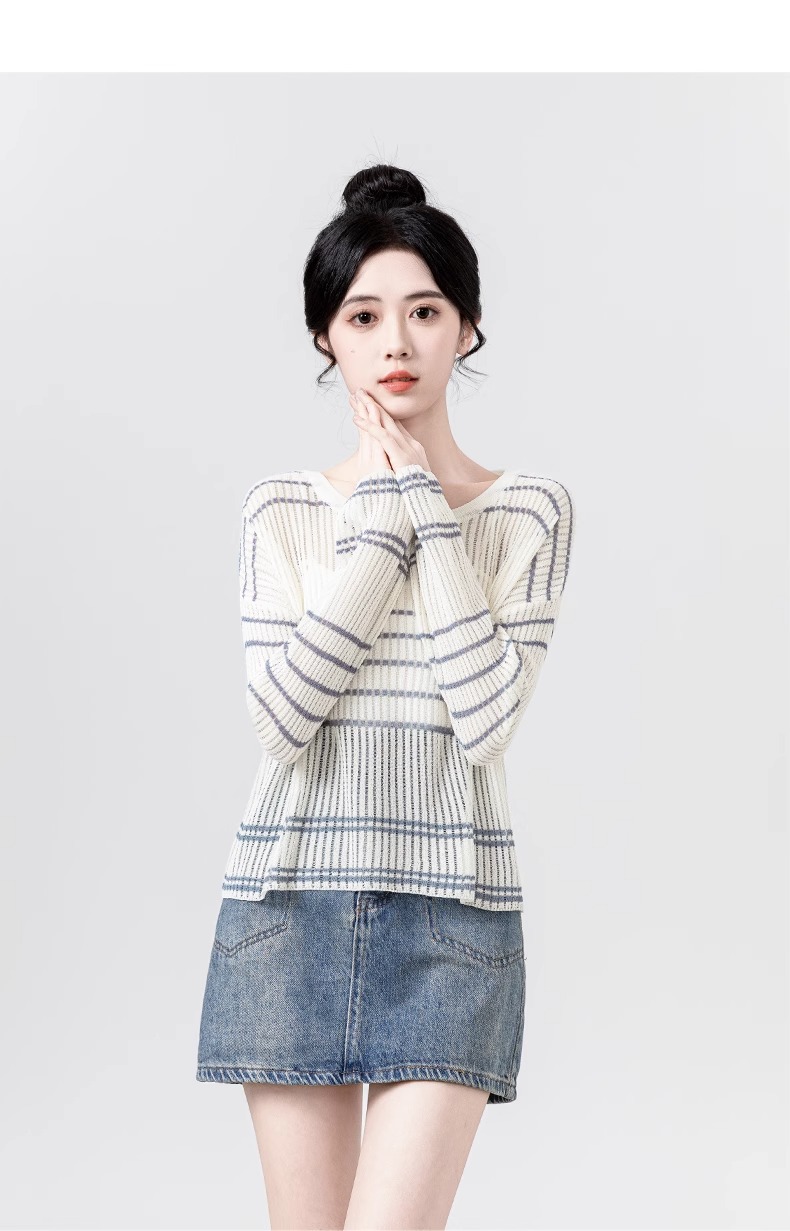 명암 줄무늬 얼음 실크 선 스크린 니트 블라우스 여성 봄 2025 새로운 내부 카미 솔 할로우 쇼트 탑스토어 가기