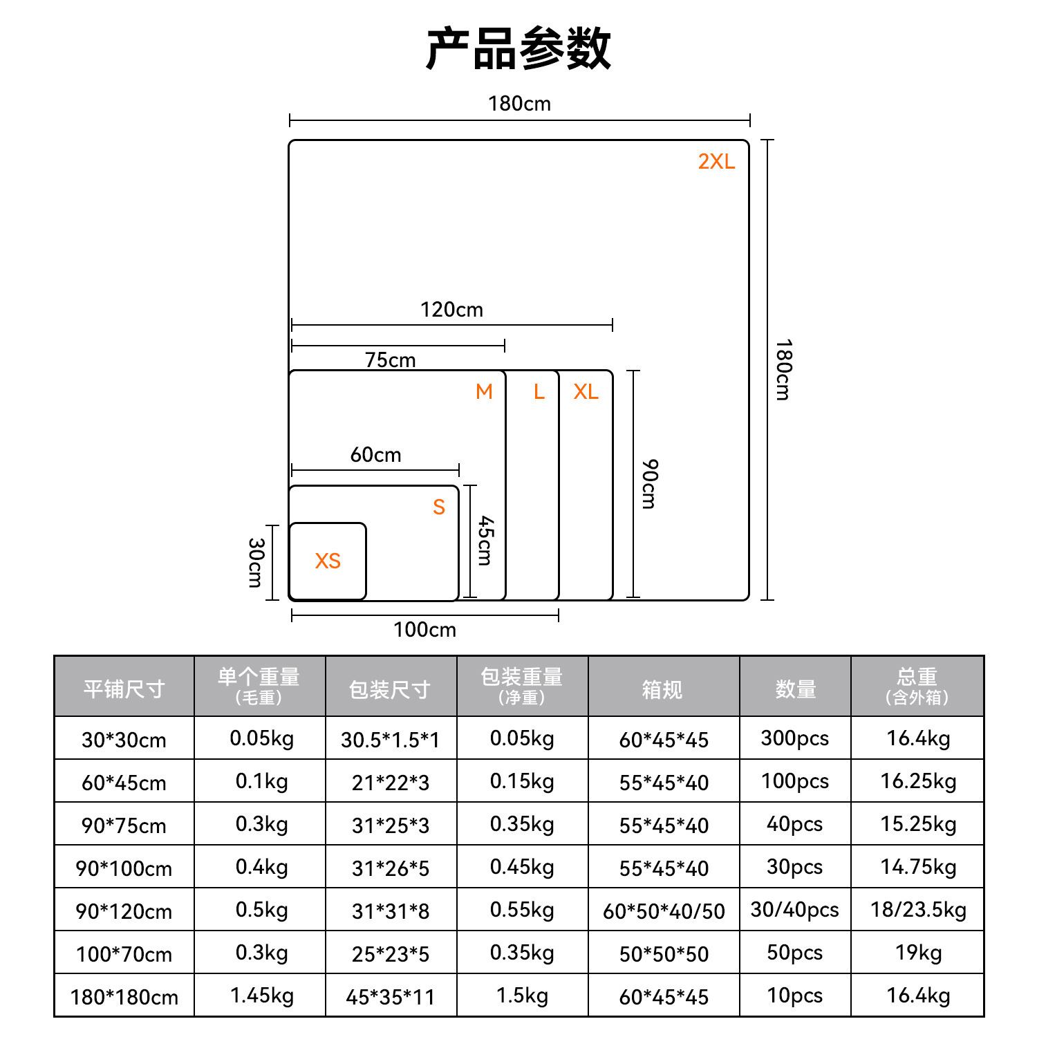2XL:180*180: 45 x 35 x 11 cm 1.5kgs 箱规 60*58*33cm 10PCS 一箱
