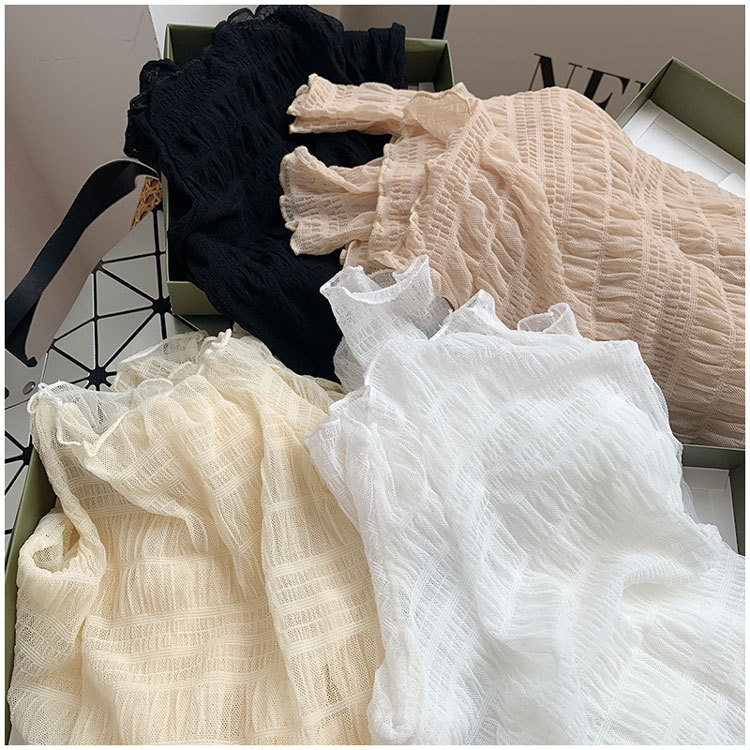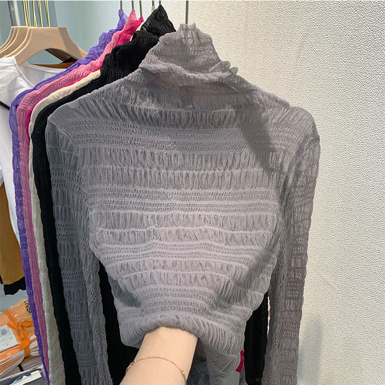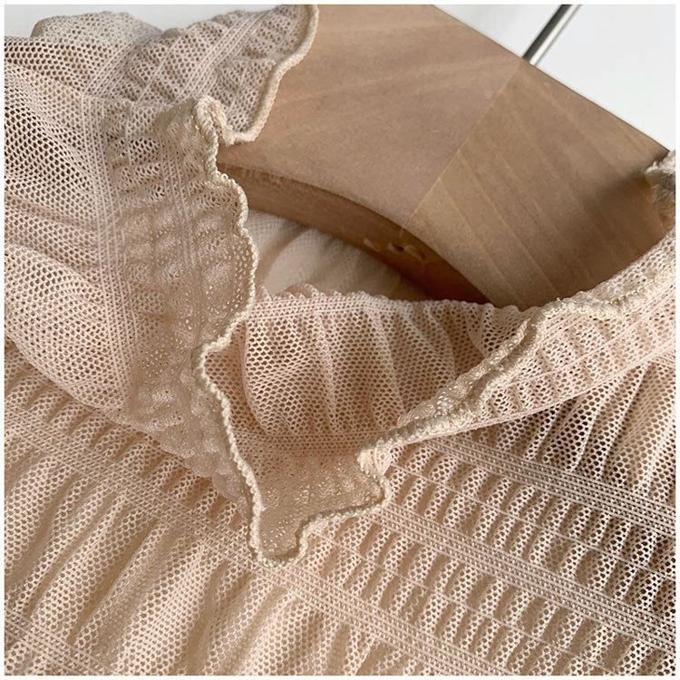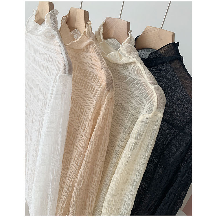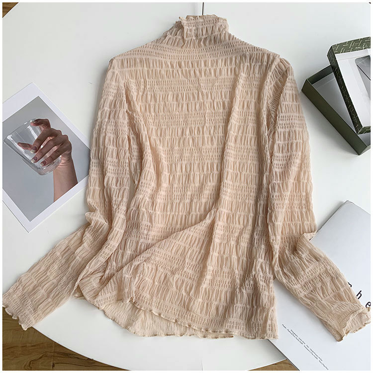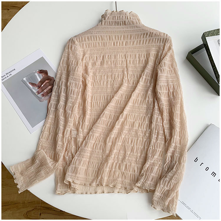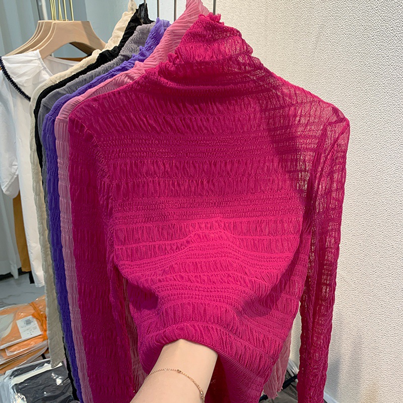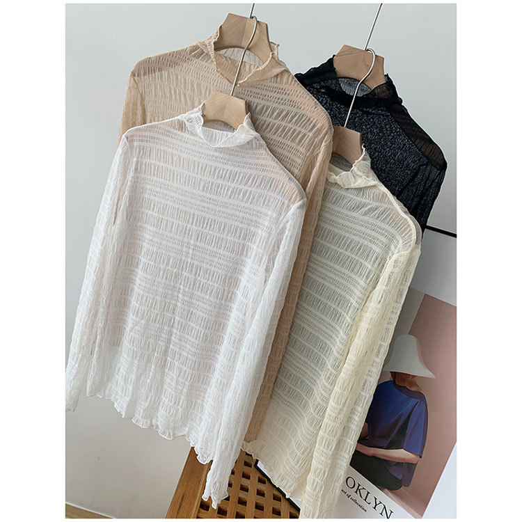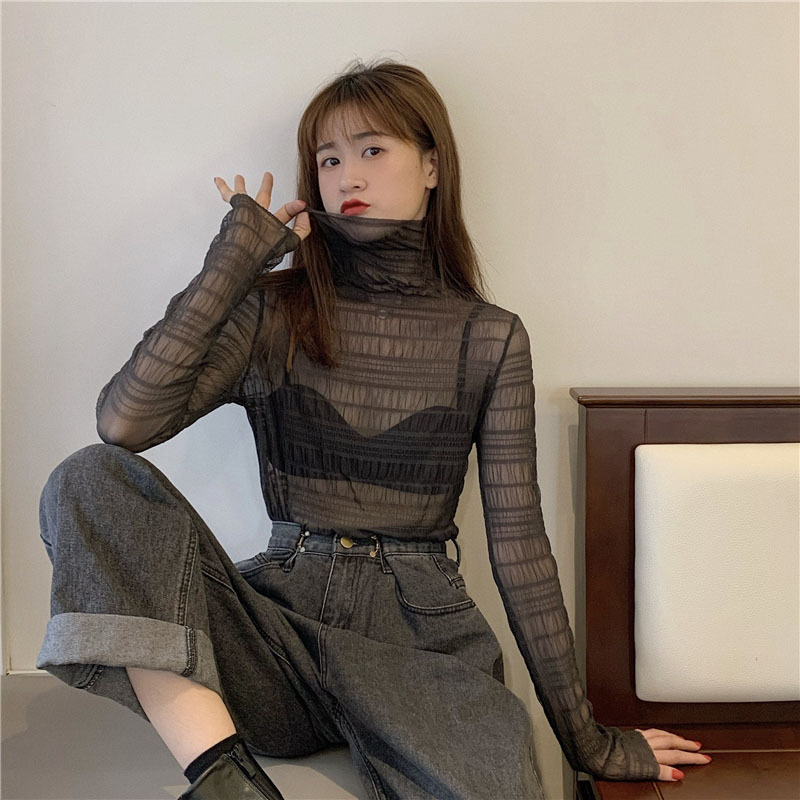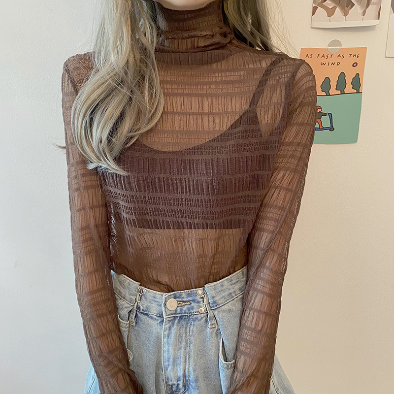 공기 감각 바닥! 아름답고 요정! 여성용 얇은 스트레치 하이 넥 시스루 레이스 메쉬 셔츠 탑