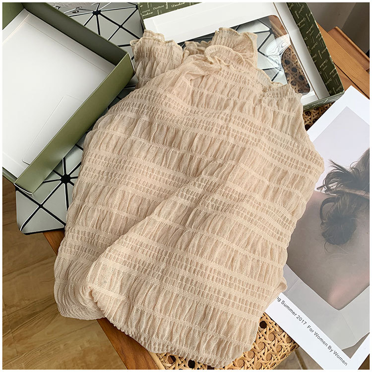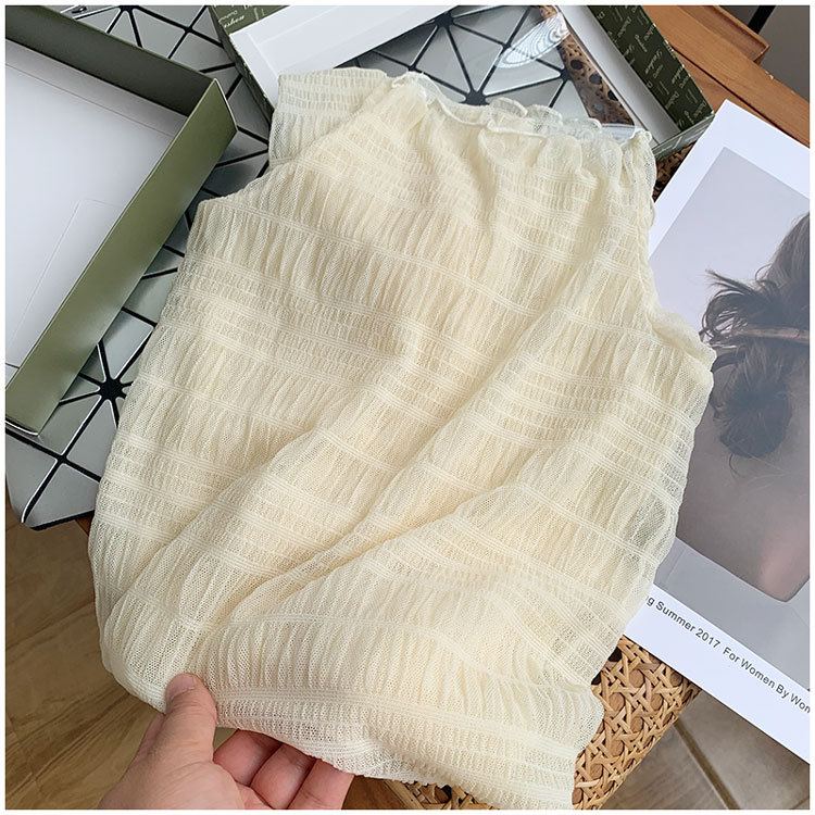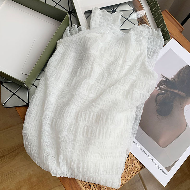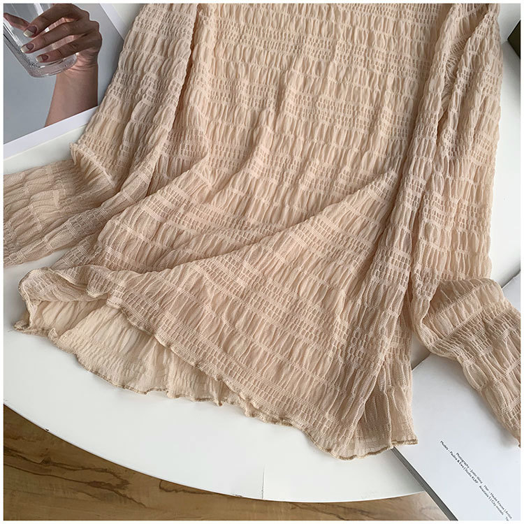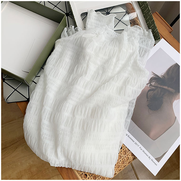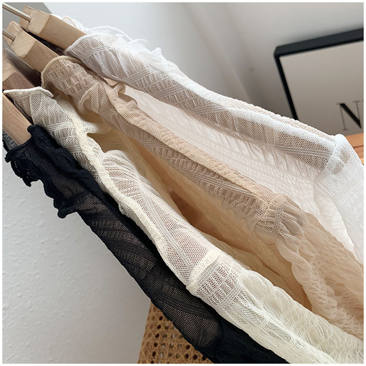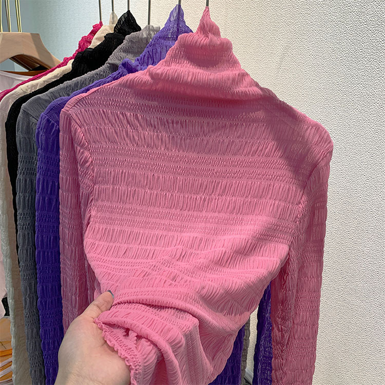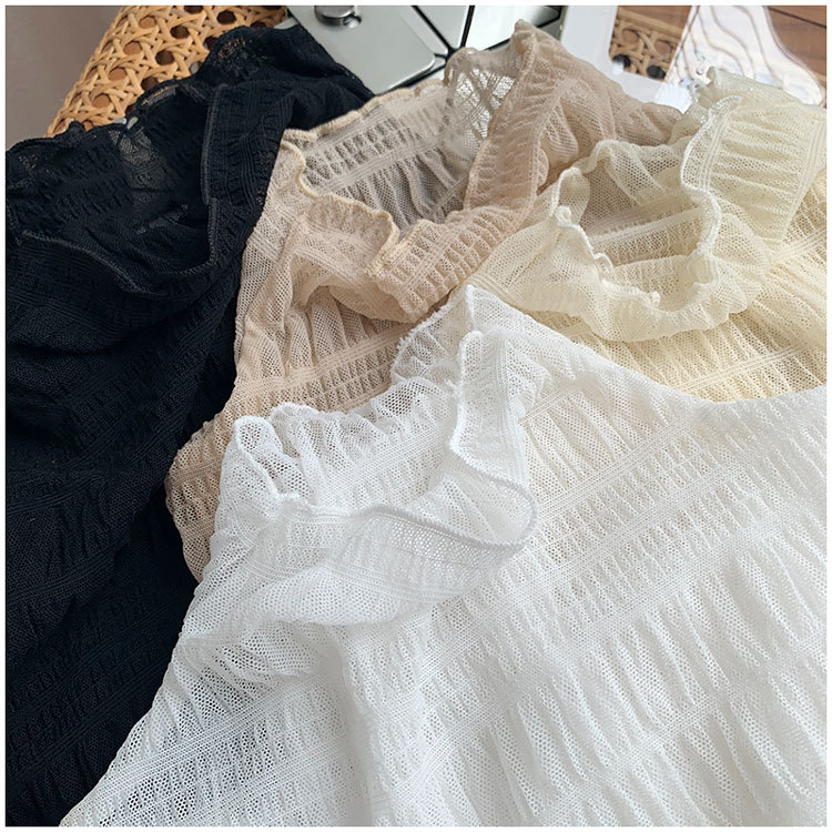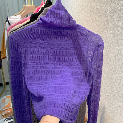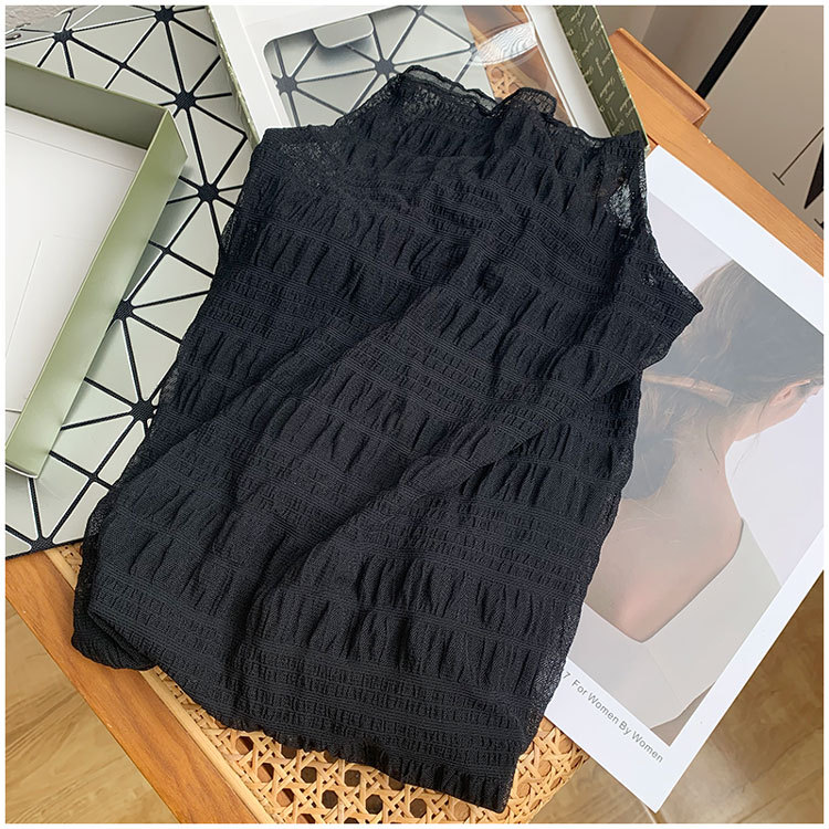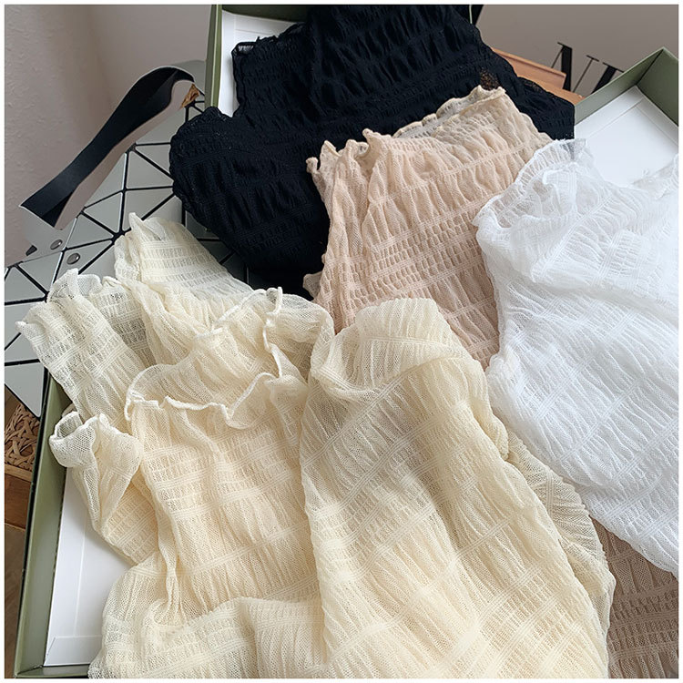 공기 감각 바닥! 아름답고 요정! 여성용 얇은 스트레치 하이 넥 시스루 레이스 메쉬 셔츠 탑