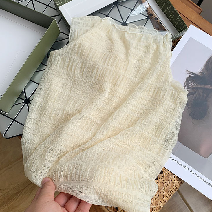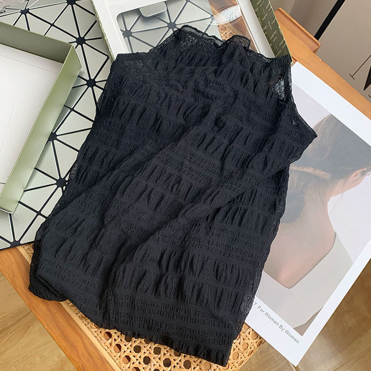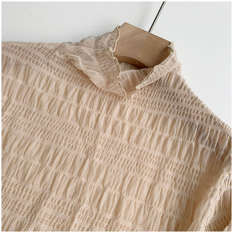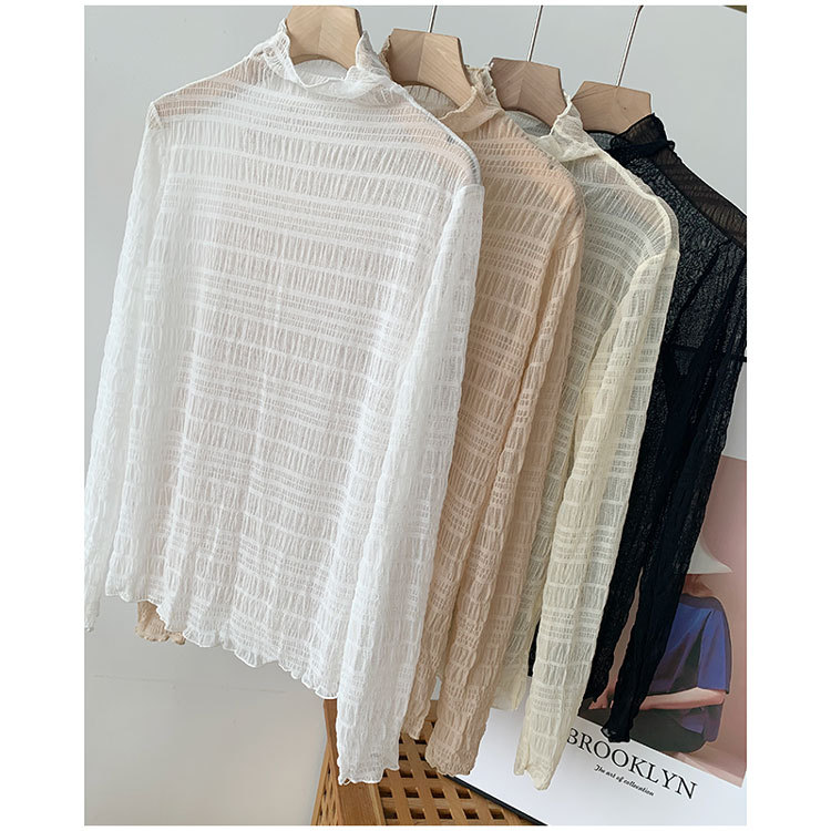 공기 감각 바닥! 아름답고 요정! 여성용 얇은 스트레치 하이 넥 시스루 레이스 메쉬 셔츠 탑스토어 가기