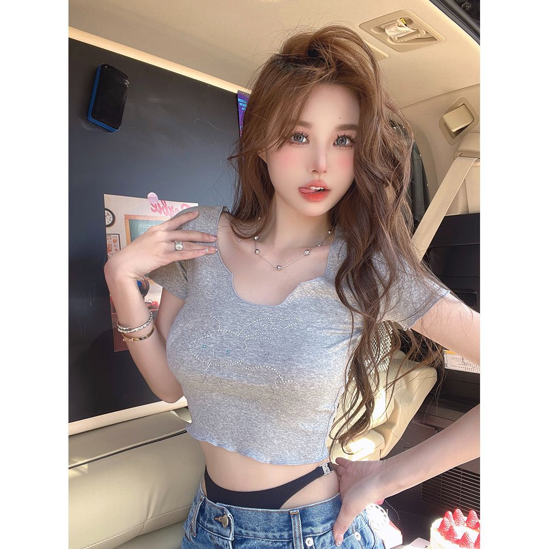 작은 우아한 핫 걸 스타일 가슴 드러내는 V 넥 반팔 티셔츠 여성용 여름 섹시한 올 매치 배꼽 노출 숄더 탑스토어 가기