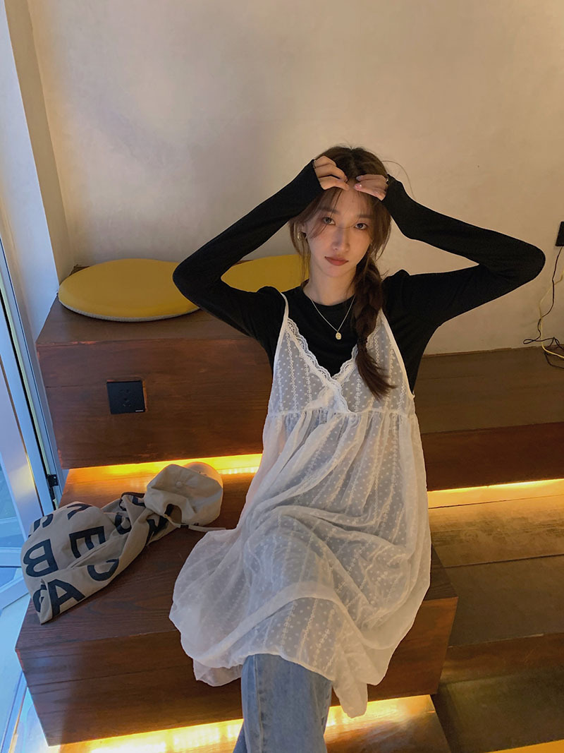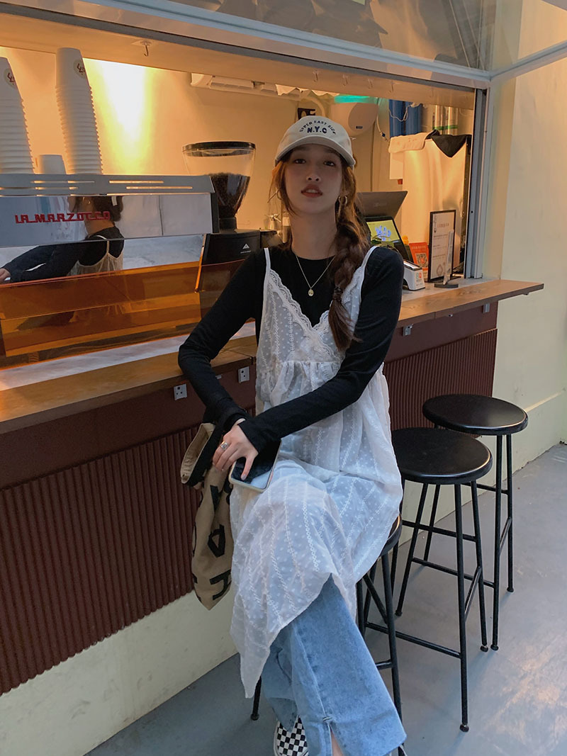 슈퍼 페어리 레이스 슬링 원피스 여성용 2025 새로운 얇은 우아한 화이트 V 넥 중간 길이 A 자형 스커트