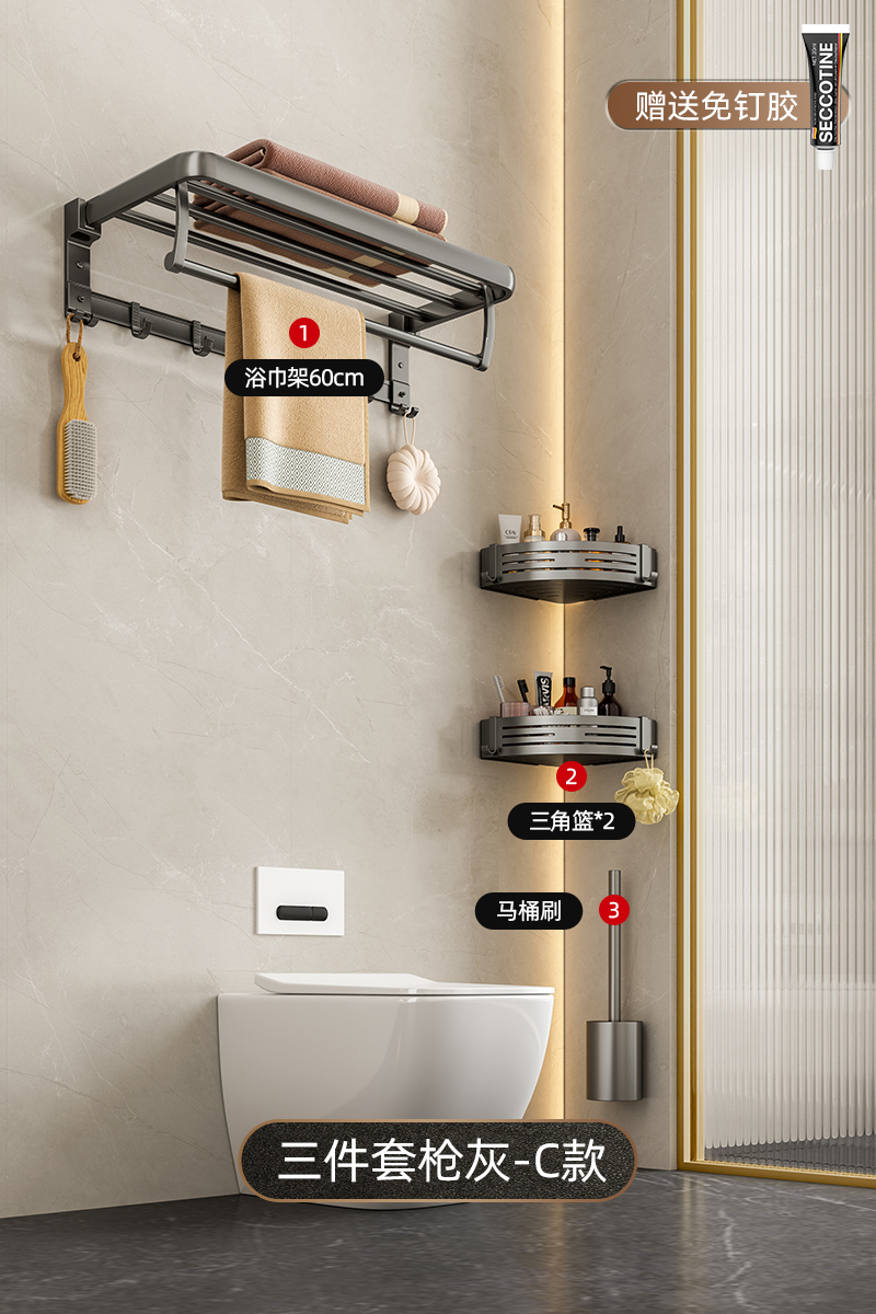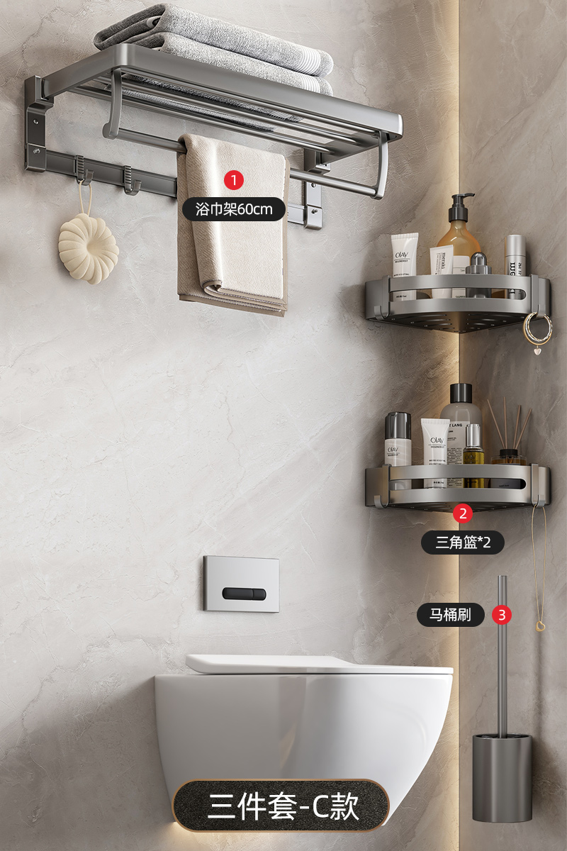 • [업그레이드된 두꺼워진 모델 - 3종세트C] 수건걸이 + 2단삼각바구니 + 변기솔