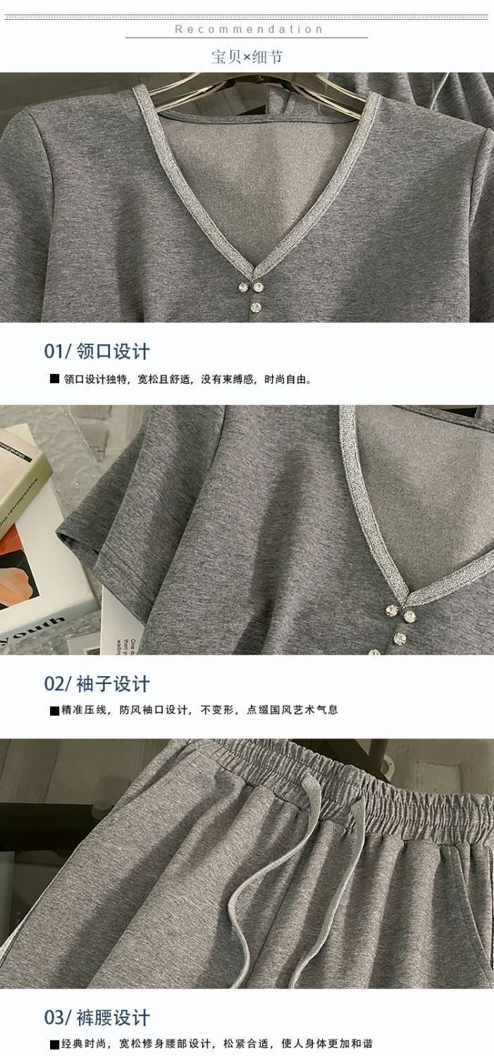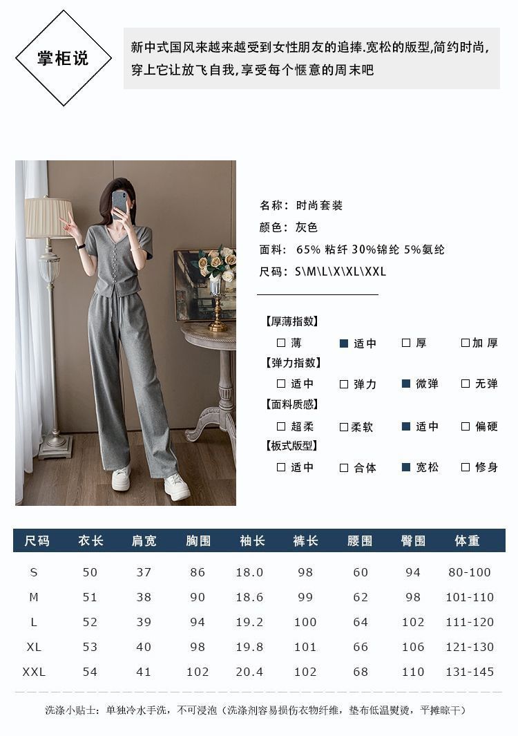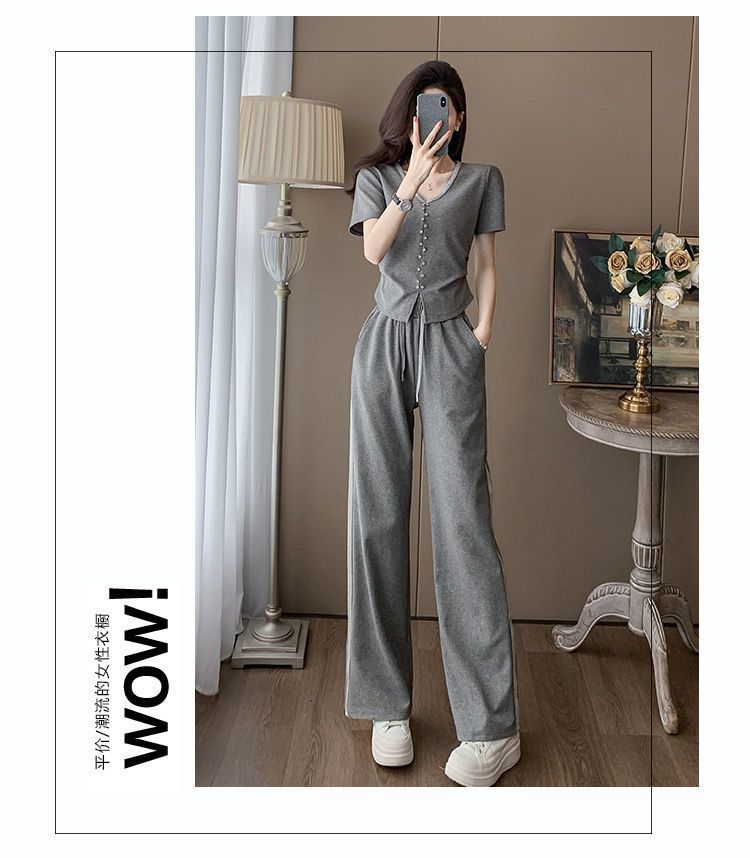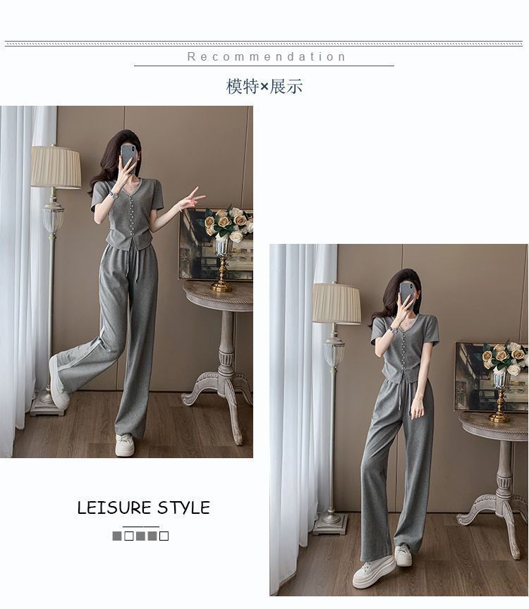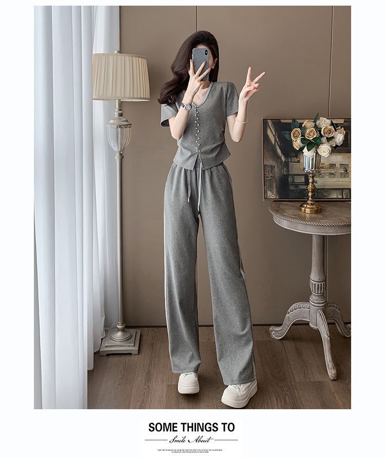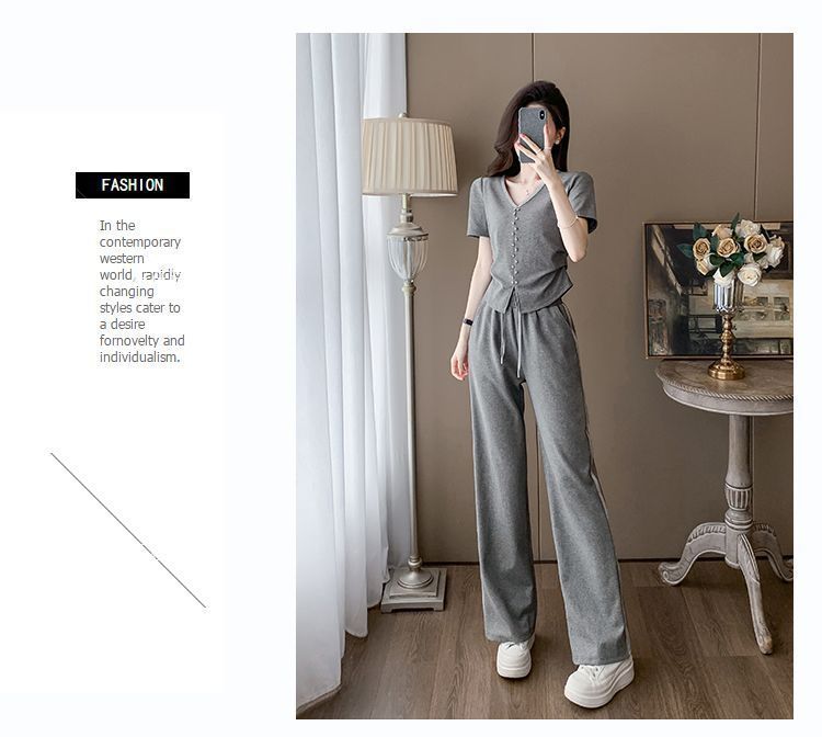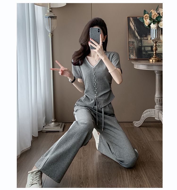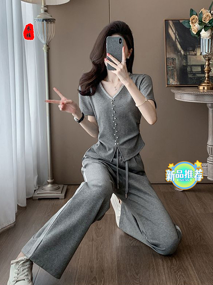 스포츠 세트 여성의 새로운 중국 캐주얼 2025 패션 웨스턴 스타일 새로운 여름 트렌디 한 반팔 와이드 레그 바지 투피스 세트스토어 가기