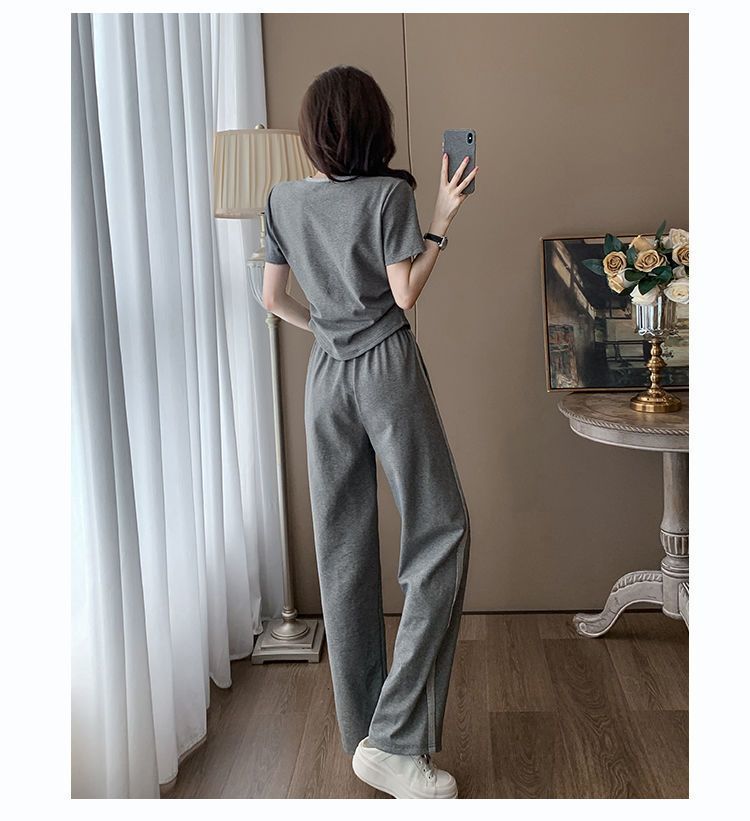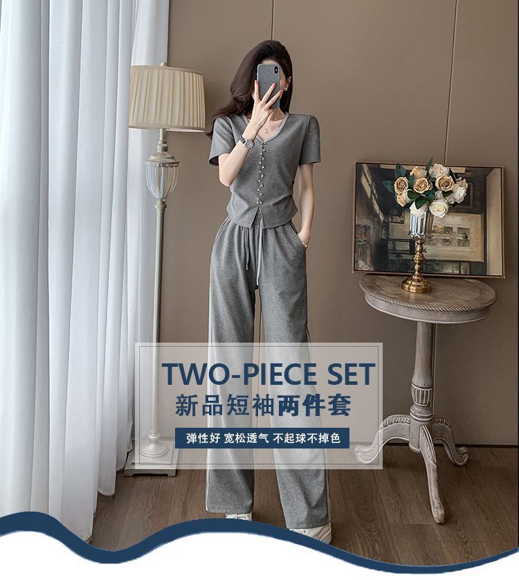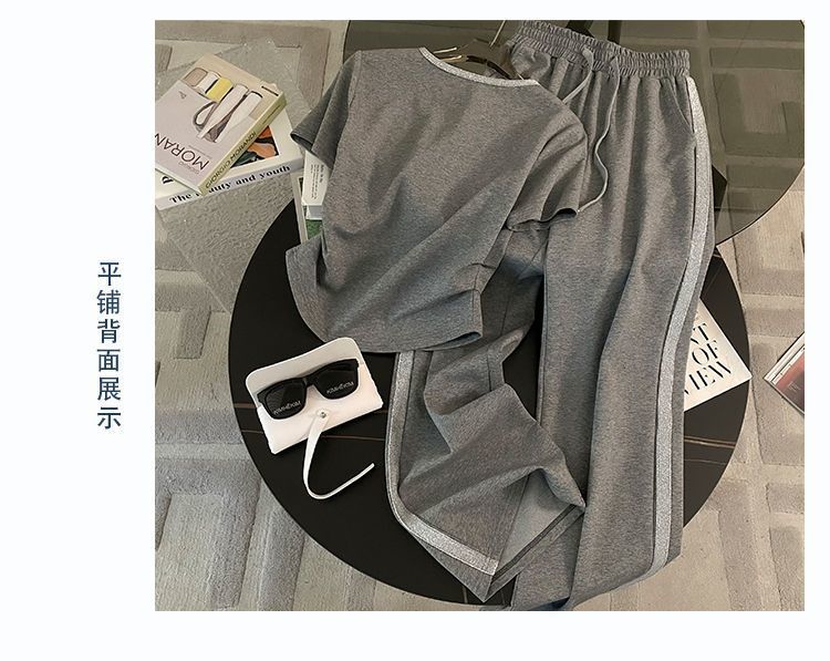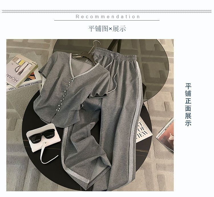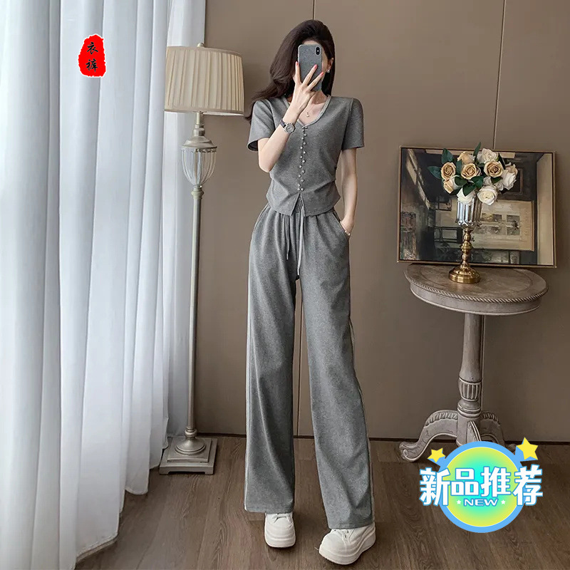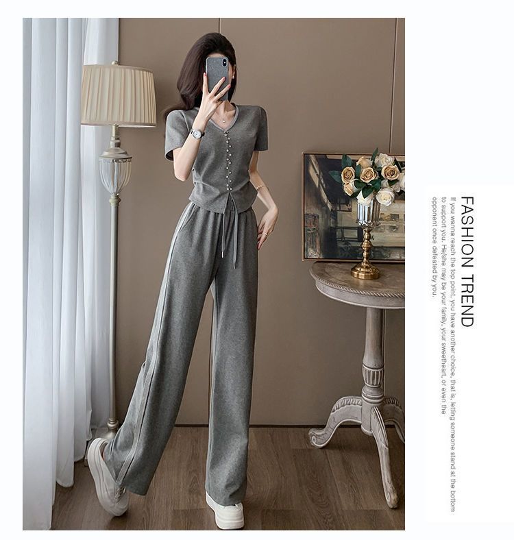 스포츠 세트 여성의 새로운 중국 캐주얼 2025 패션 웨스턴 스타일 새로운 여름 트렌디 한 반팔 와이드 레그 바지 투피스 세트