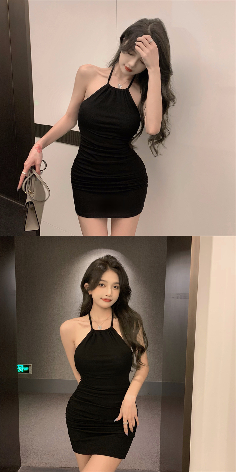 미국 스타일의 뜨거운 소녀 교수형 목 스트랩 원피스 여성의 여름, 섹시한 백리스 탄성 타이트 힙합 스커트