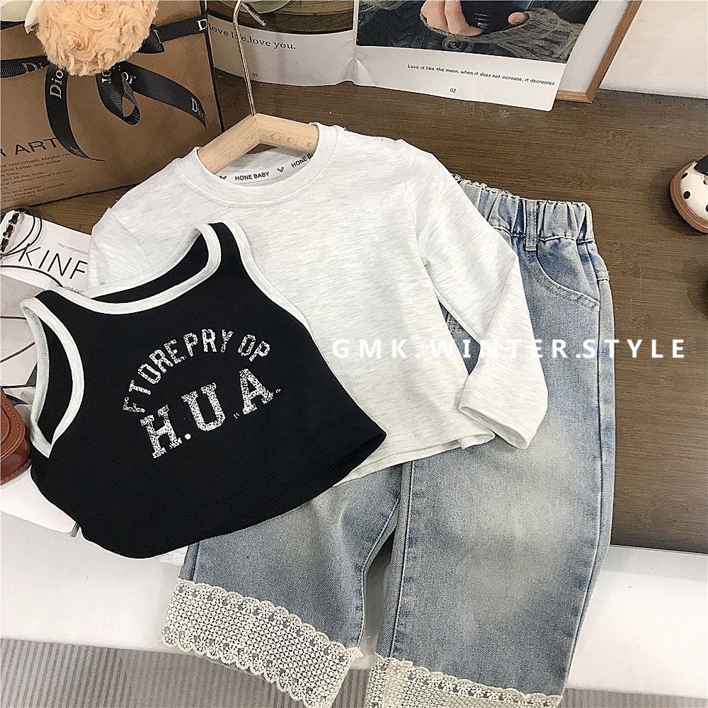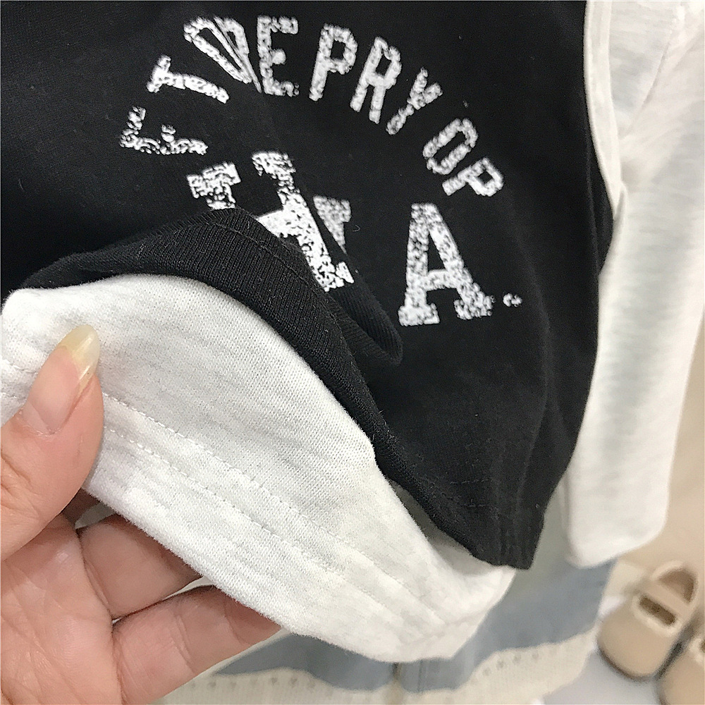 봄 가을 한국 소녀 긴 소매 티셔츠 베이스 셔츠 스태킹 조끼 짧은 어린이 아기 청바지 대외 무역스토어 가기