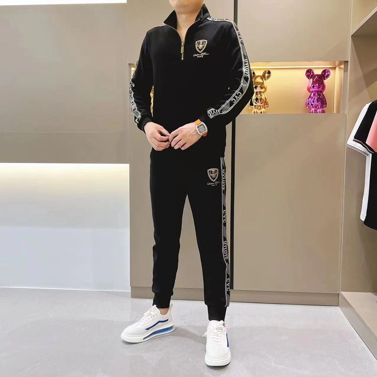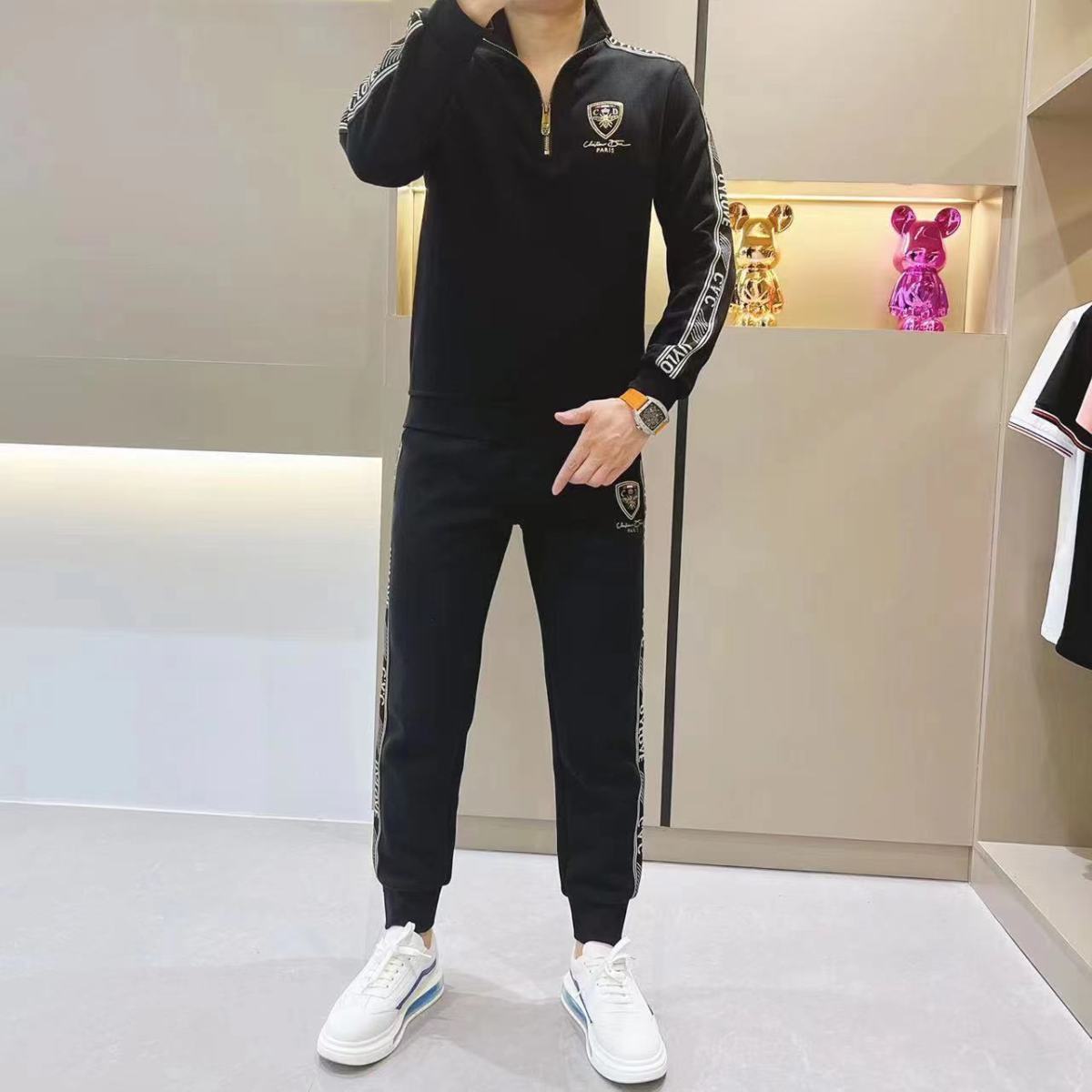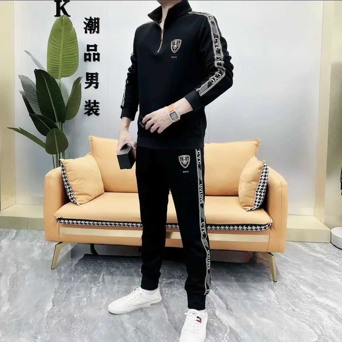 새로운 남자 대비 캐주얼 스포츠 세트 남자 유럽 역 스트레치 블랙 스탠드 칼라 투피스 남자 재킷 바지스토어 가기