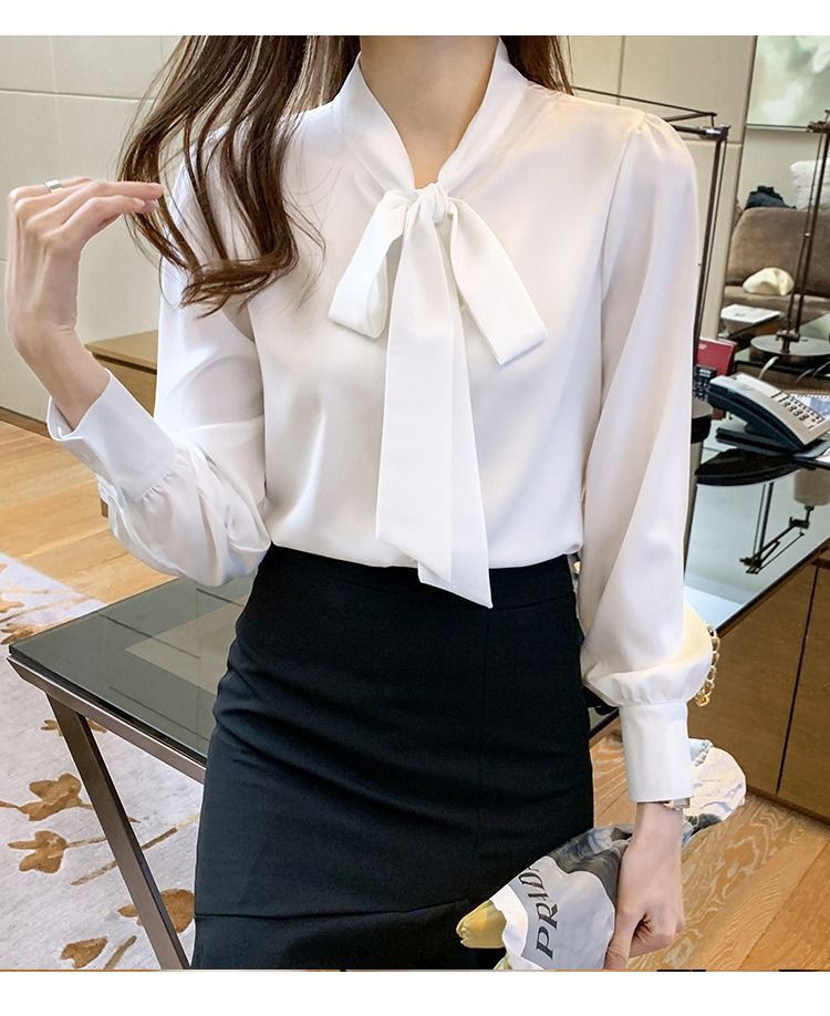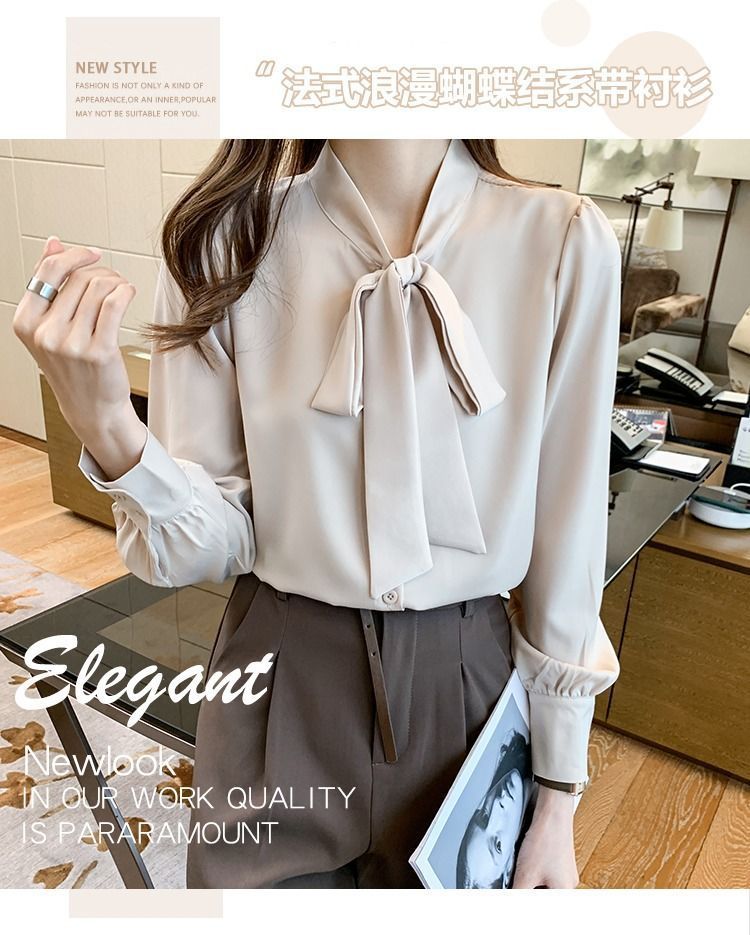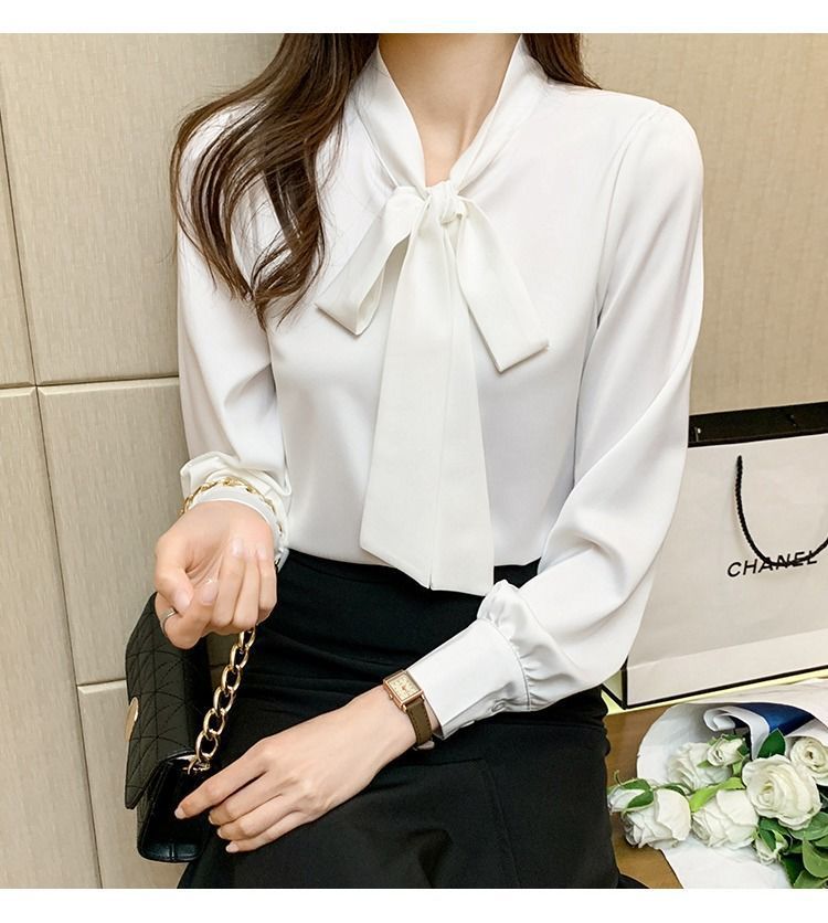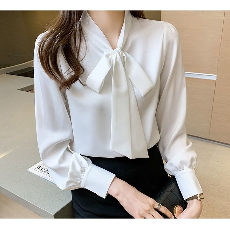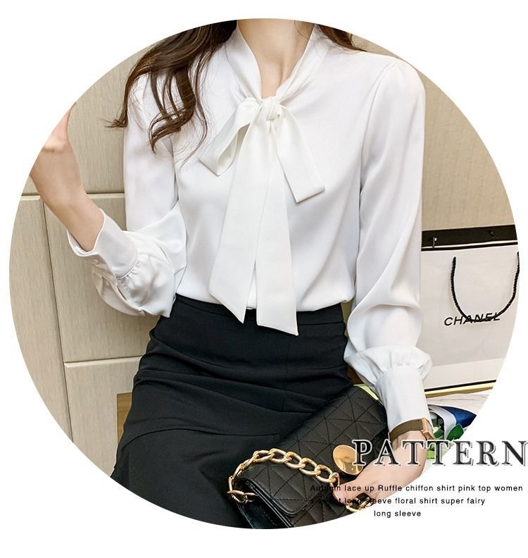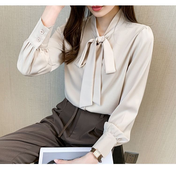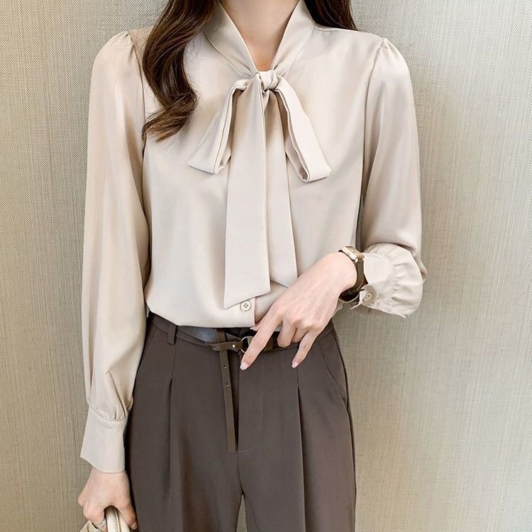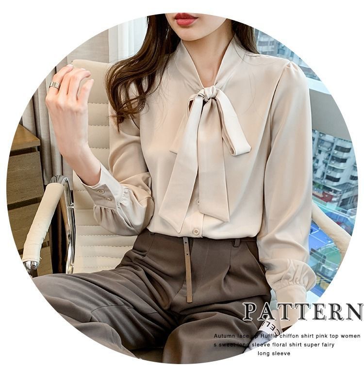 봄과 가을의 새로운 활 레이스 업 쉬폰 셔츠 여성용 긴팔 느슨한 일회용 우아한 솔리드 컬러 올 매치 탑스토어 가기