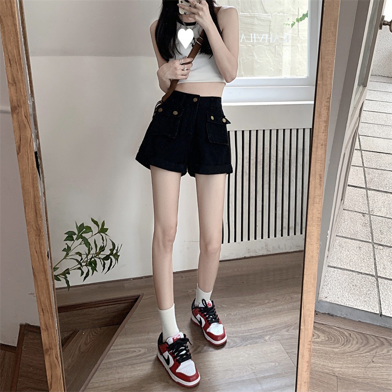 빈티지 툴링 데님 반바지 여성 2023 년 여름 새로운 높은 허리 슬리밍 작은 느슨한 검은 캐주얼 바지