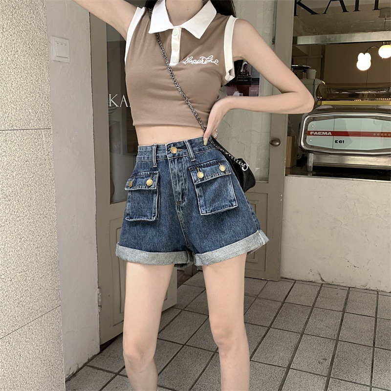 빈티지 툴링 데님 반바지 여성 2023 년 여름 새로운 높은 허리 슬리밍 작은 느슨한 검은 캐주얼 바지스토어 가기