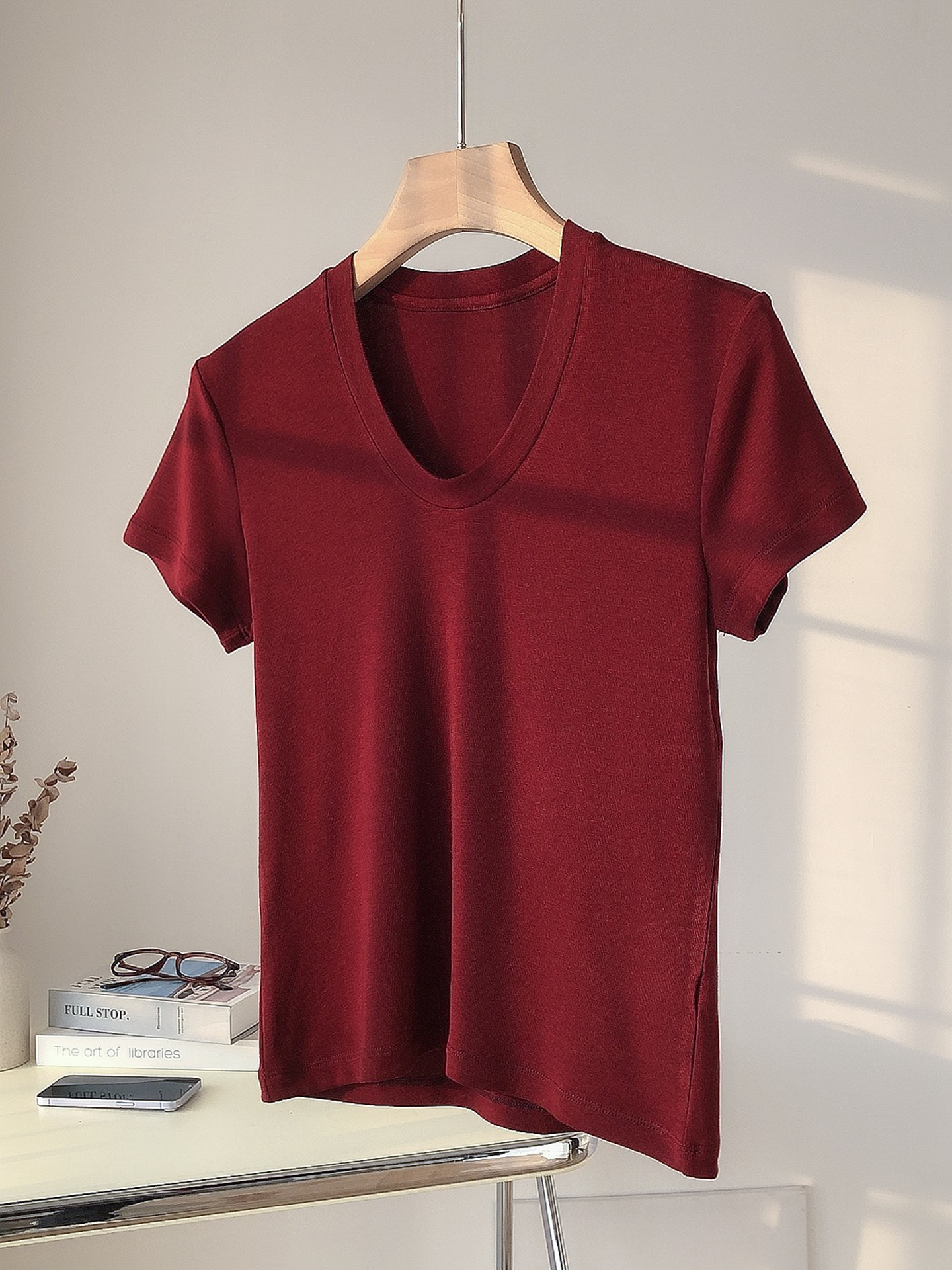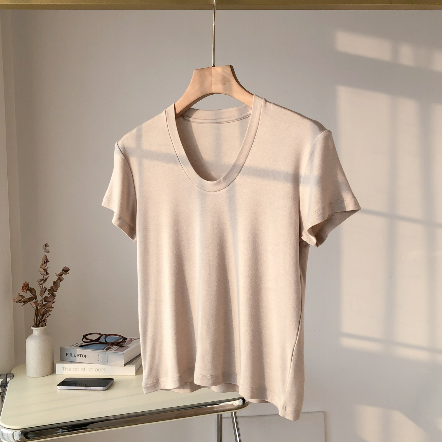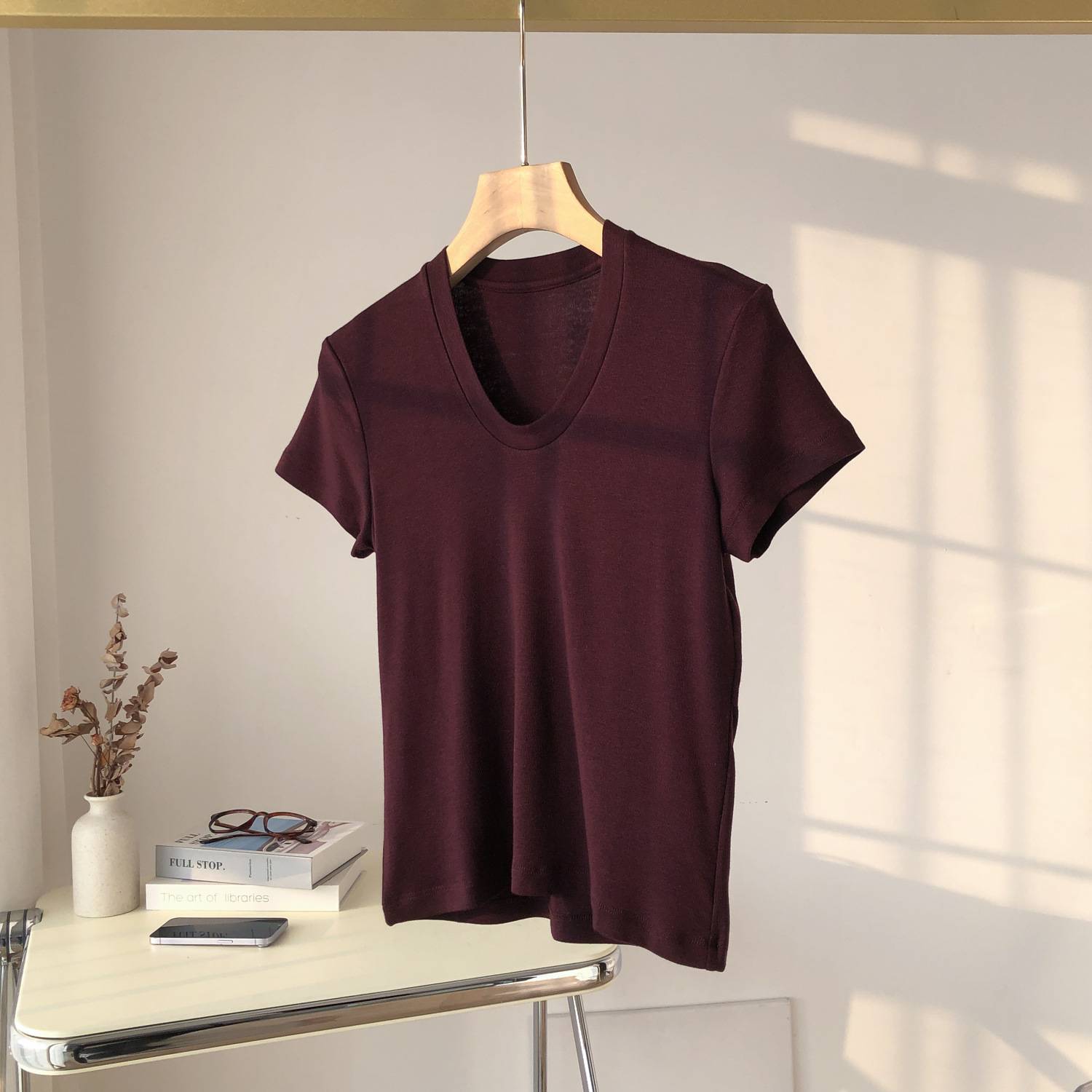 파워 팩토리 백조 목 쇼백 얇은 U-넥 반팔 여성용 탄성 슬림-피트 보토밍 여름 텐셀 아세테이트 울 티셔츠스토어 가기