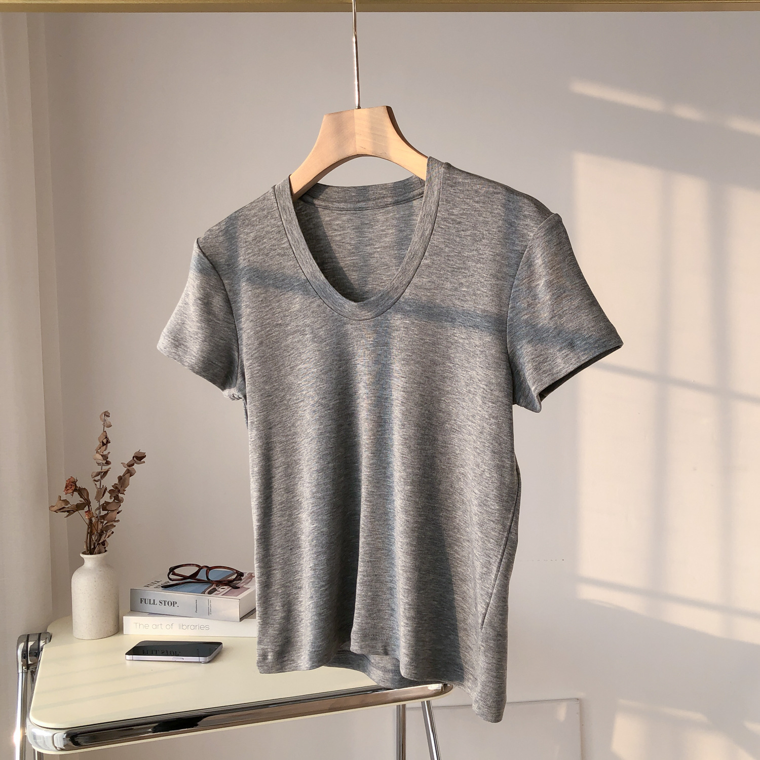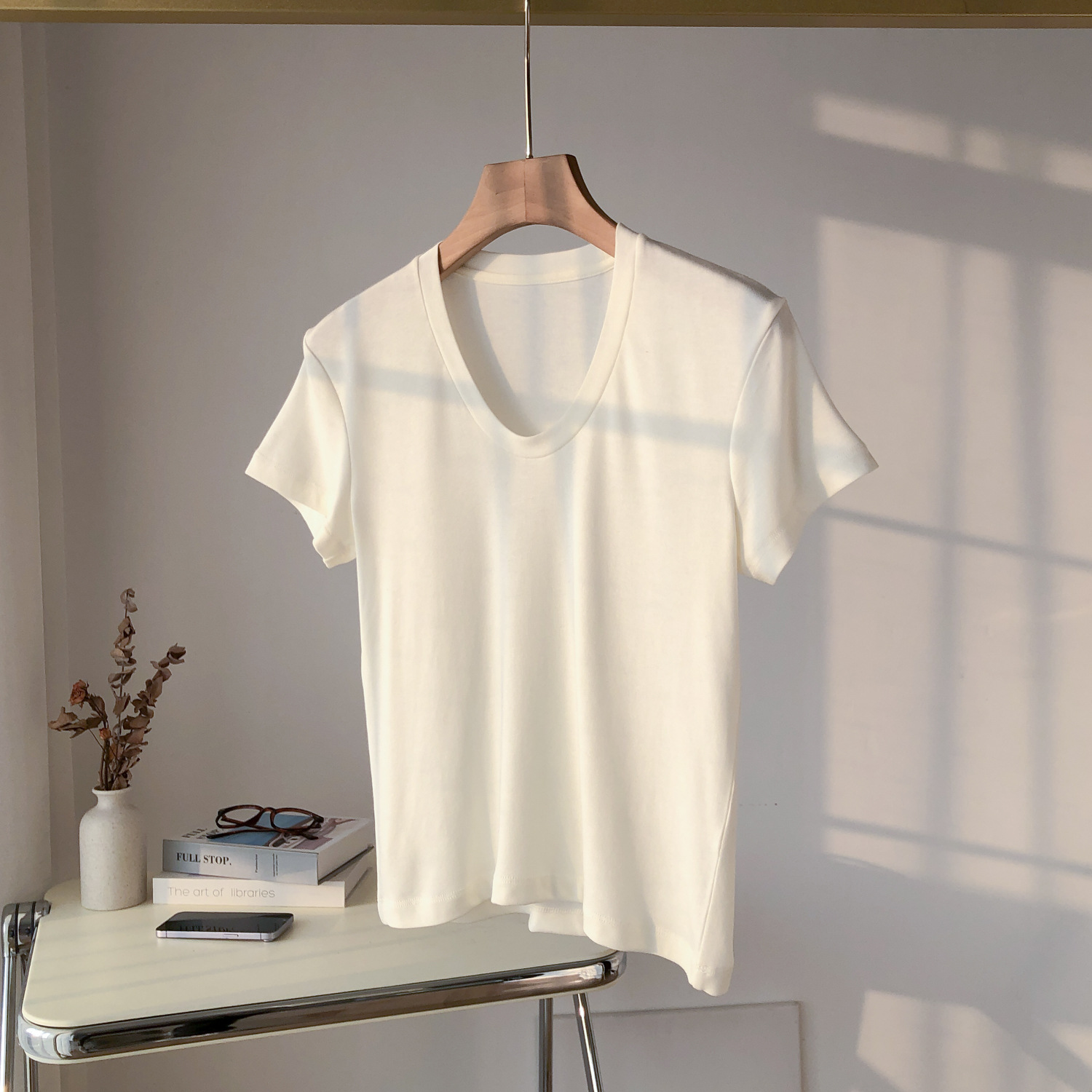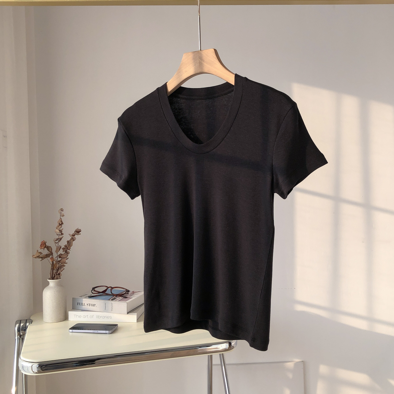 파워 팩토리 백조 목 쇼백 얇은 U-넥 반팔 여성용 탄성 슬림-피트 보토밍 여름 텐셀 아세테이트 울 티셔츠스토어 가기