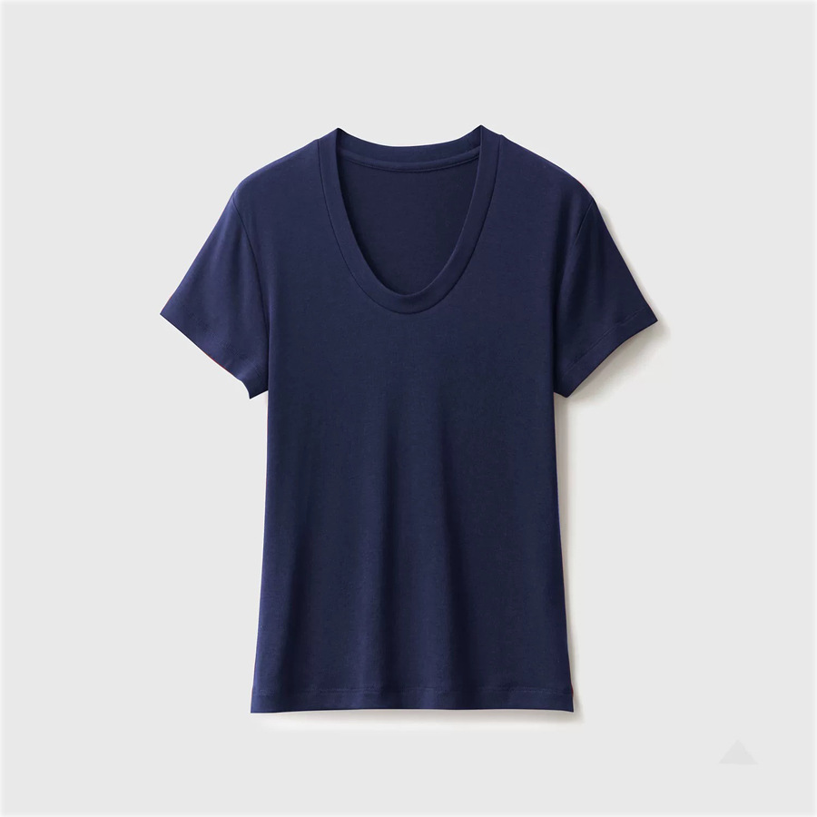 파워 팩토리 백조 목 쇼백 얇은 U-넥 반팔 여성용 탄성 슬림-피트 보토밍 여름 텐셀 아세테이트 울 티셔츠