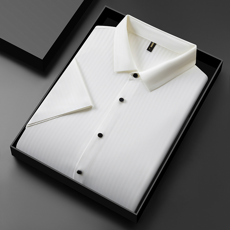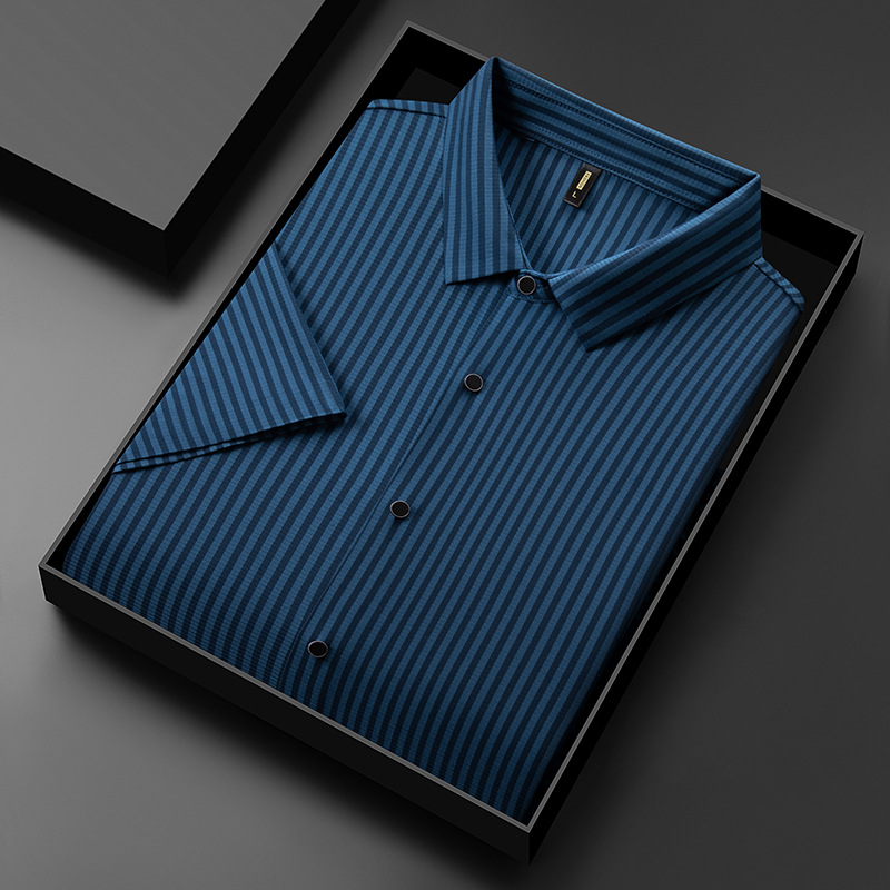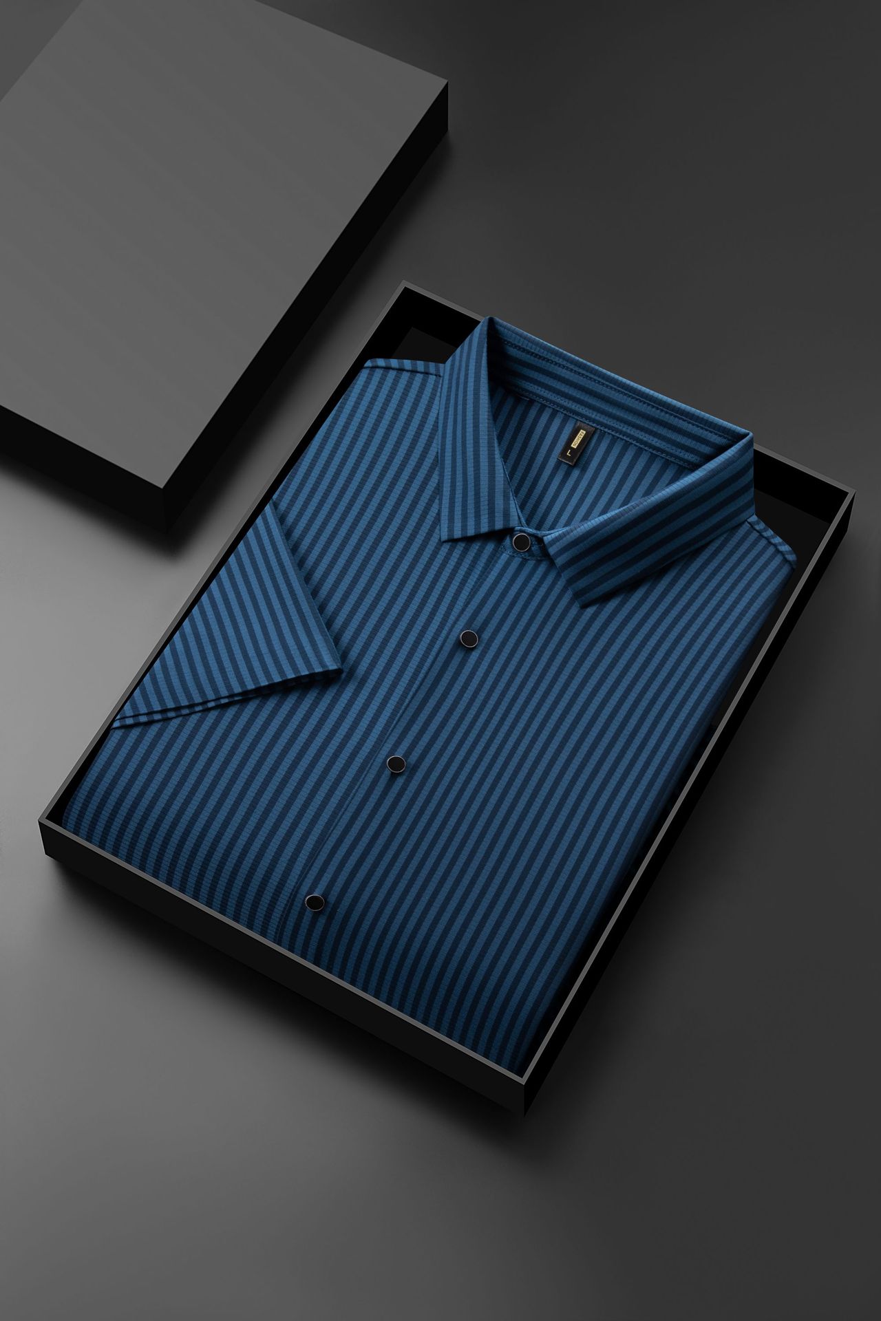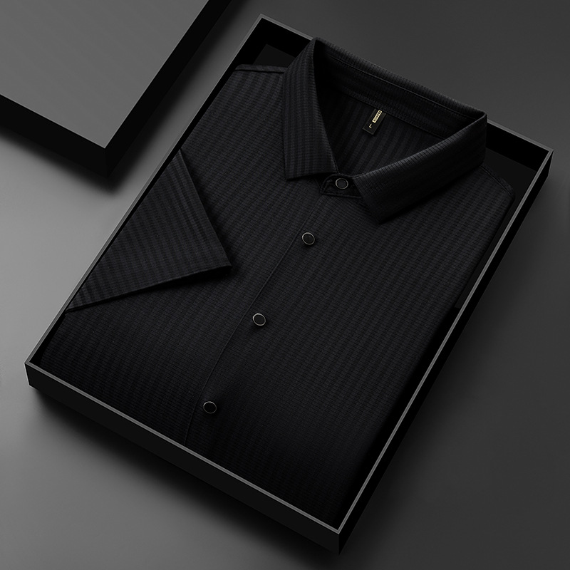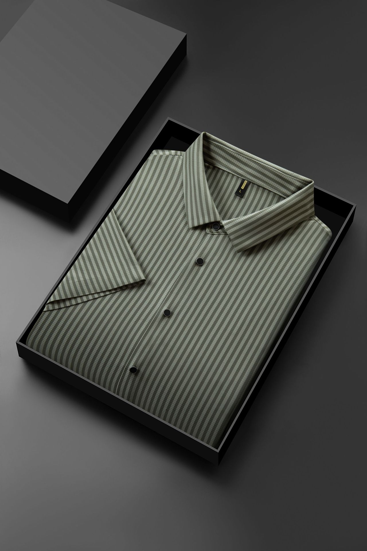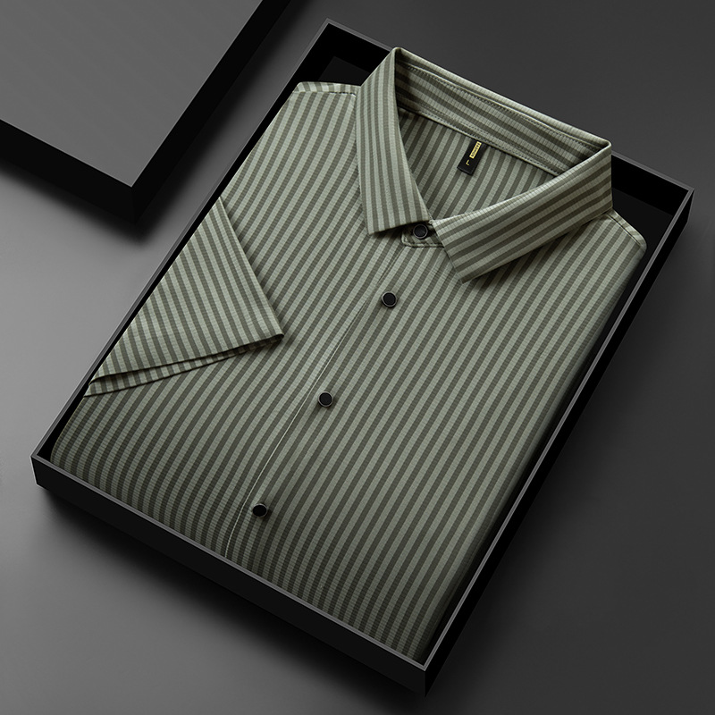 아이스 실크 탄성 얇은 반팔 셔츠 남자의 여름 새로운 사업 캐주얼 얇은 줄무늬 인쇄 남성 셔츠