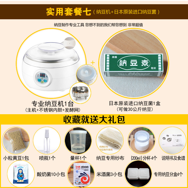 套餐7:纳豆机+1盒日本原装进口纳豆菌+大礼包(10小包酸奶菌+3包米酒曲+1包纳豆小粒黄豆+1拌菌量杯+1喷瓶+1纳豆纱布)+4个玻璃酸奶分杯(200ml/个)+4个纳豆盒
