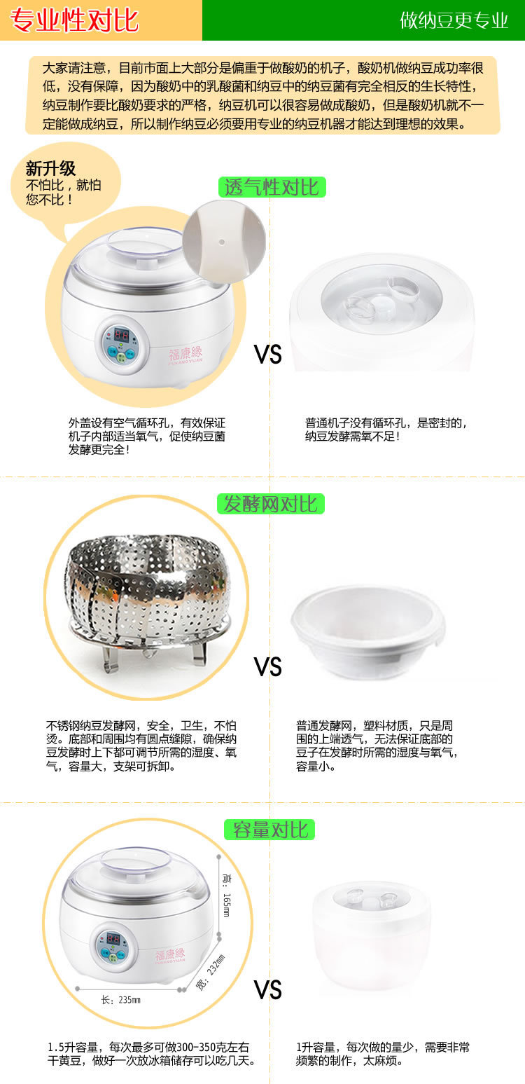 制作纳豆一定要选择专业的纳豆机,有些顾客就是喜欢看稍微有点名气的牌子,但是他根本不知道是真假,暂且不论是否是,他们对纳豆发酵能懂得几分,准确的说他们的思维只是认为销售小电器,那样您纳豆制作过程中遇到制作问题,能否帮您解决,能否教您做出高品质纳豆,这是核心的问题!我们不和别人拼价格,一分钱一分货,我们拼的是产品和服务,您如果对制作纳豆的品质比较重视,那选我们的肯定没错的!