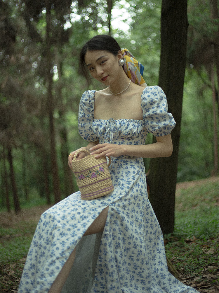 순수한 긴 원피스 키 큰 사이드 슬릿 원피스 스퀘어 칼라 홀리데이 웨어 2025 프랑스 꽃 원피스스토어 가기