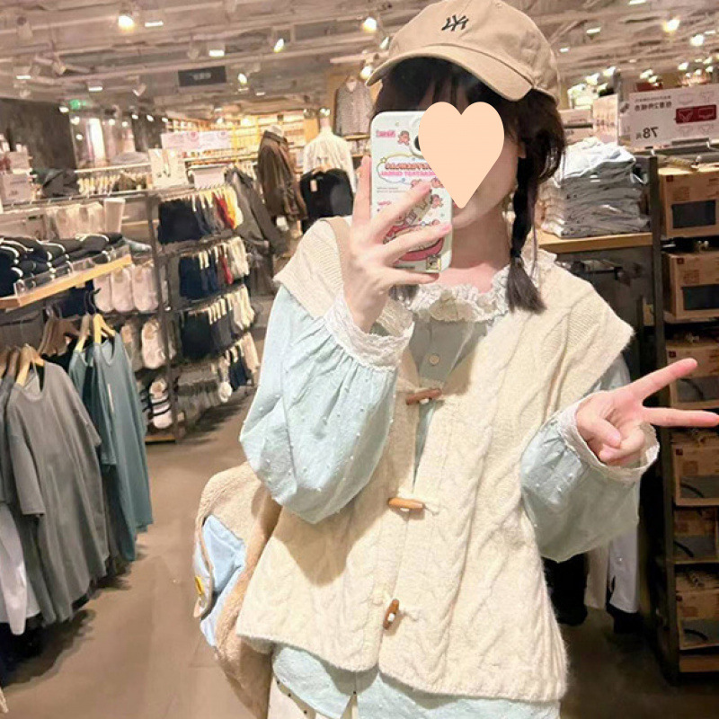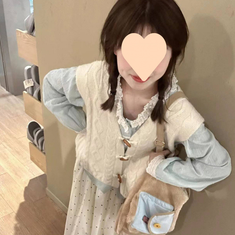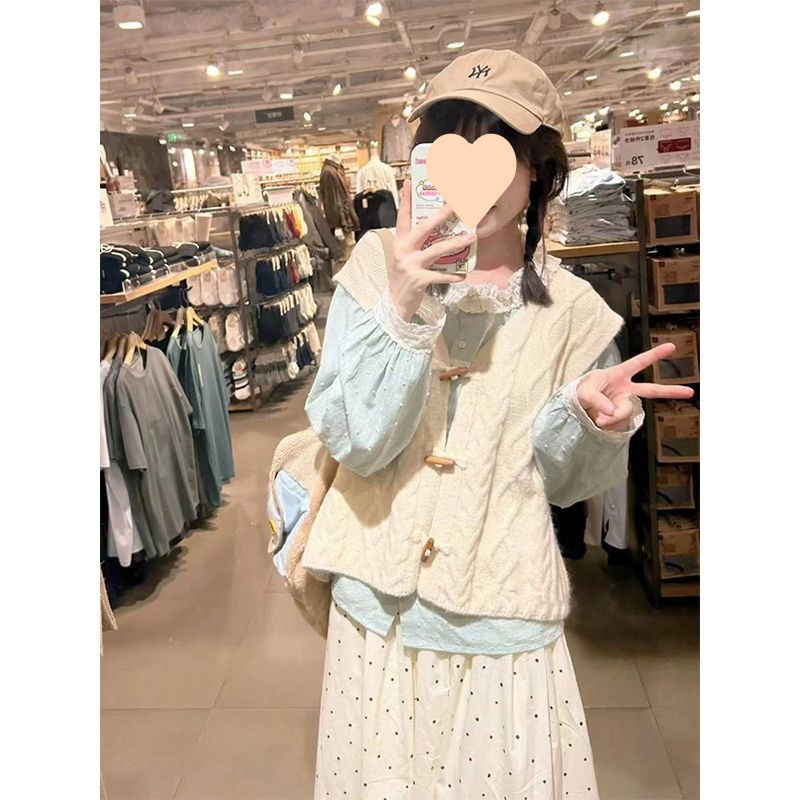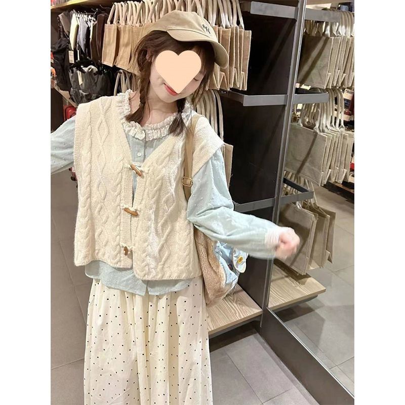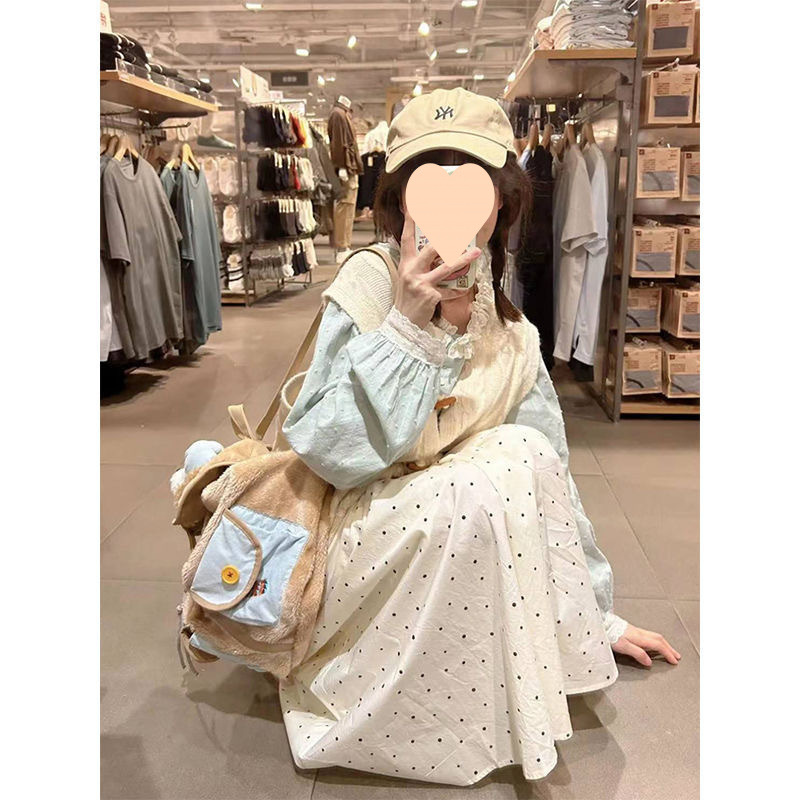목가적 인 스타일 신선하고 귀여운 트위스트 니트 조끼 조끼 폴로 도트 스커트 셔츠 여성 학생 세트스토어 가기