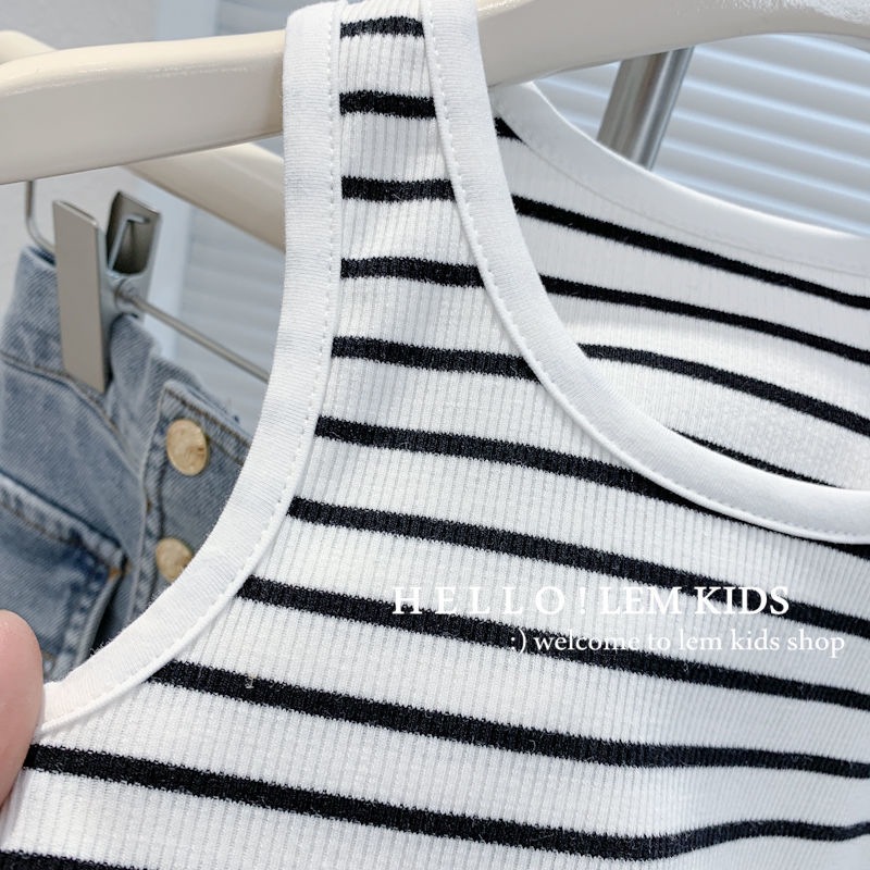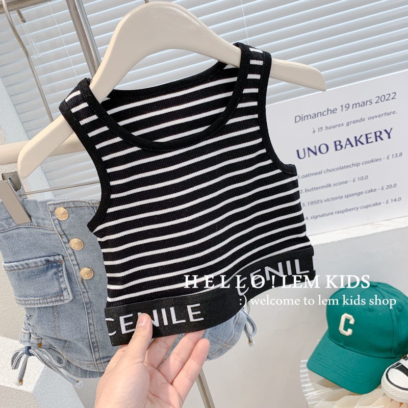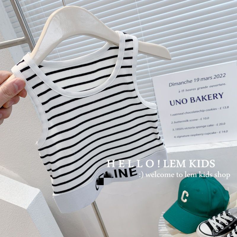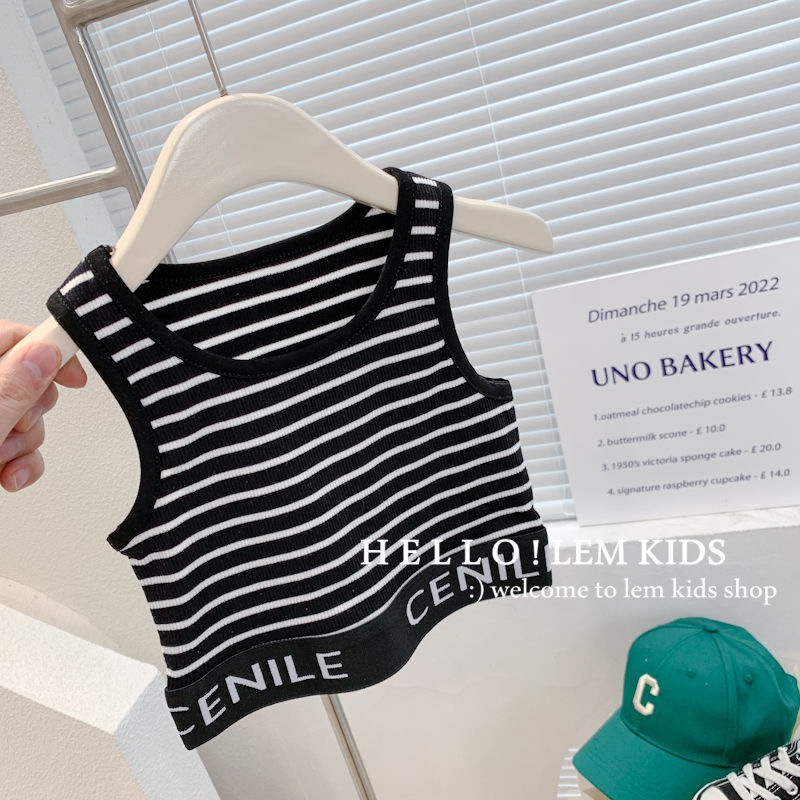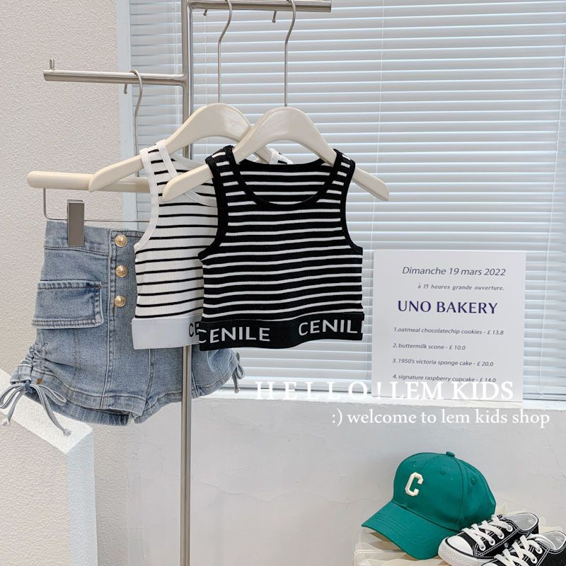 여자 여름 조끼 아기의 서양식 어린이 맞춤형 유행 브랜드 유행 사이버 축하 편지 자수 줄무늬 민소매 티셔츠스토어 가기