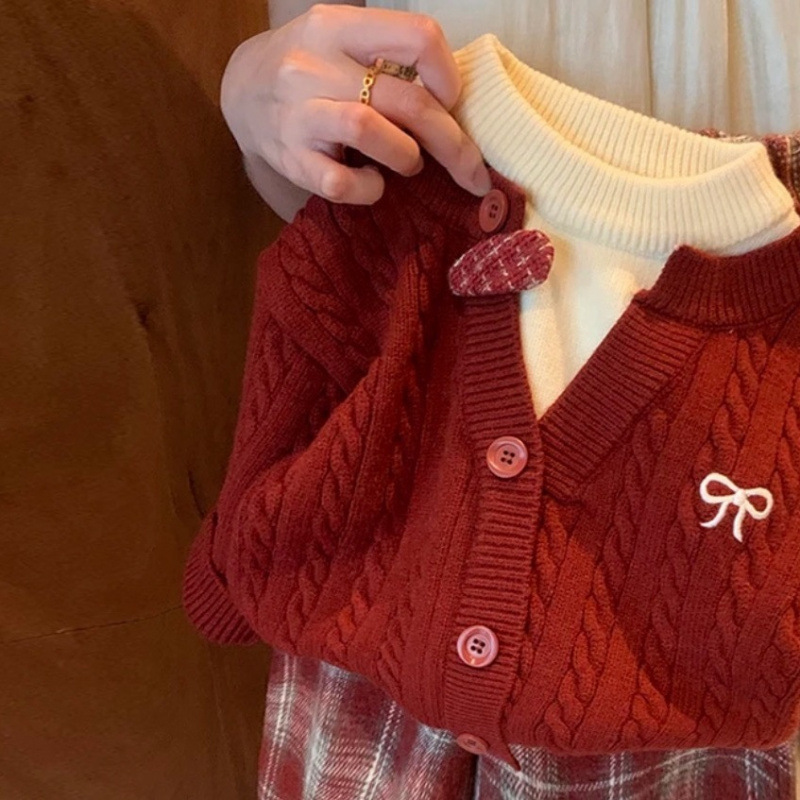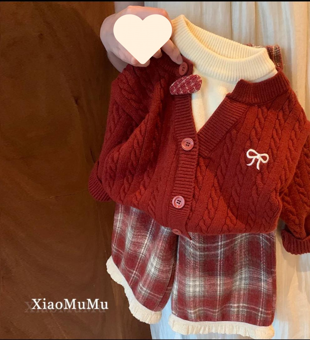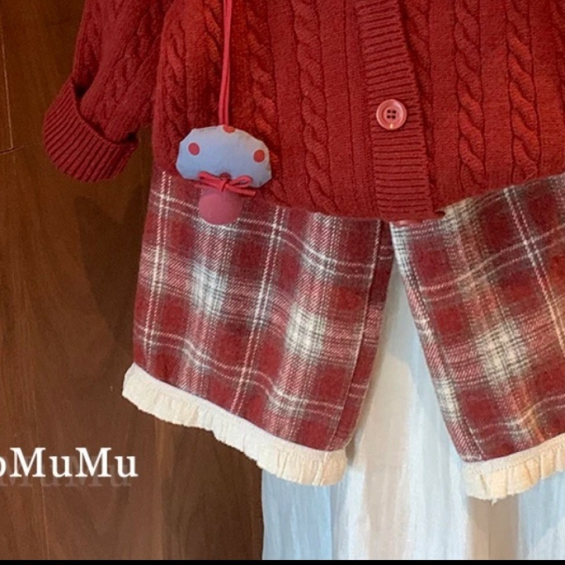 • 빨간색 페이크 투피스 스웨터 + 빨간색 체크 무늬 벨벳 바지