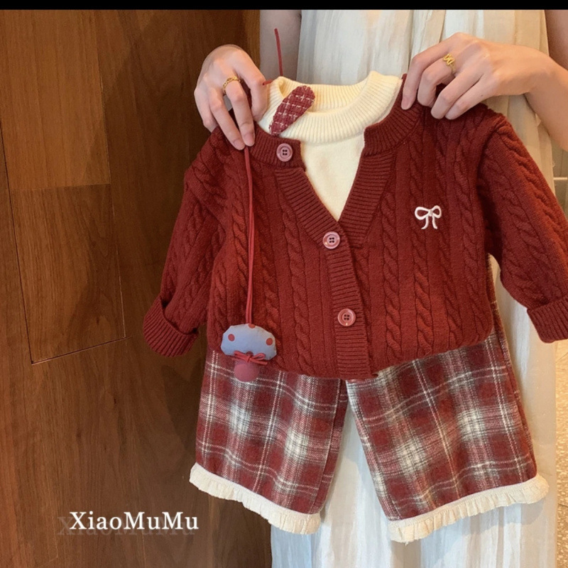 소녀의 가을/겨울 세트 2024 새로운 아기 소녀의 서양식 스웨터 격자 무늬 바지 어린이 투피스 겨울 패션