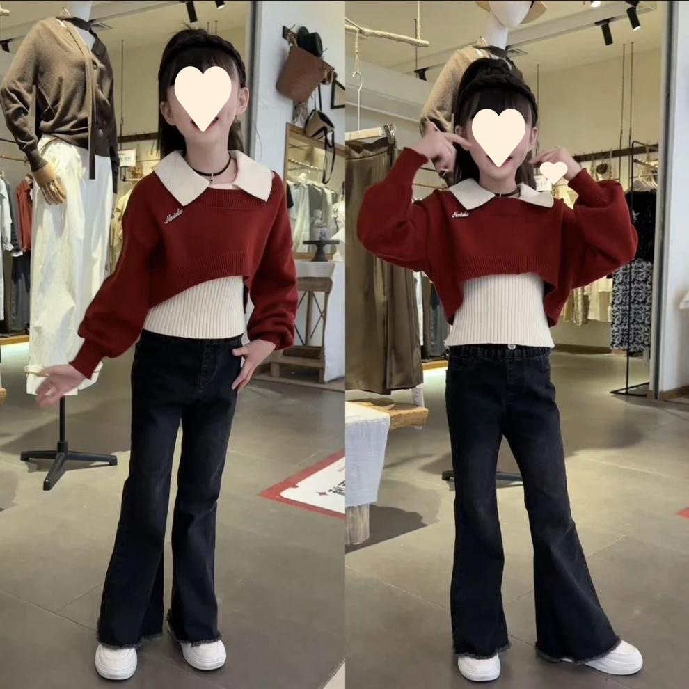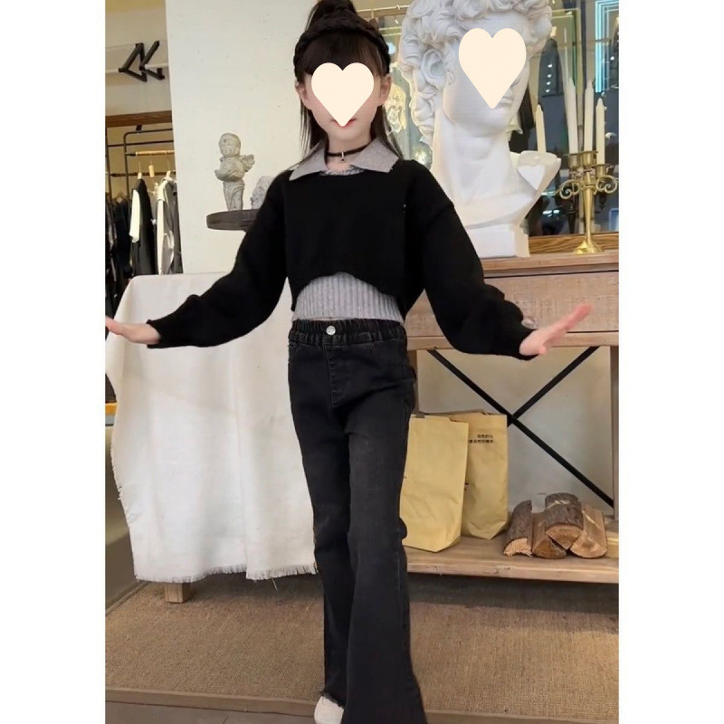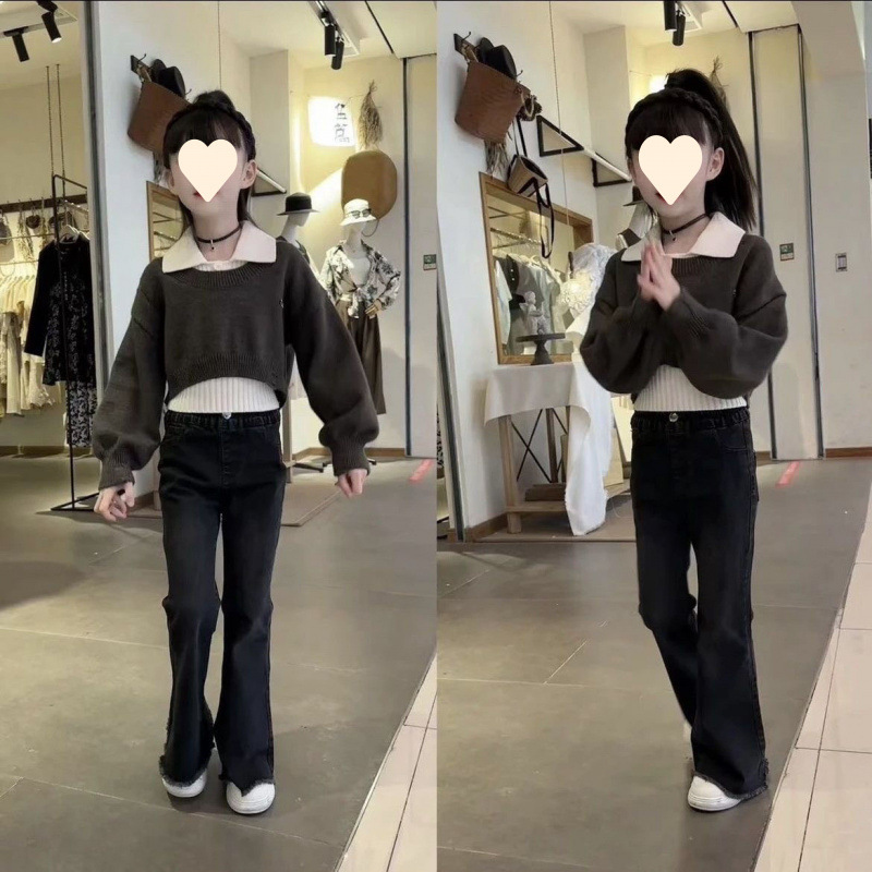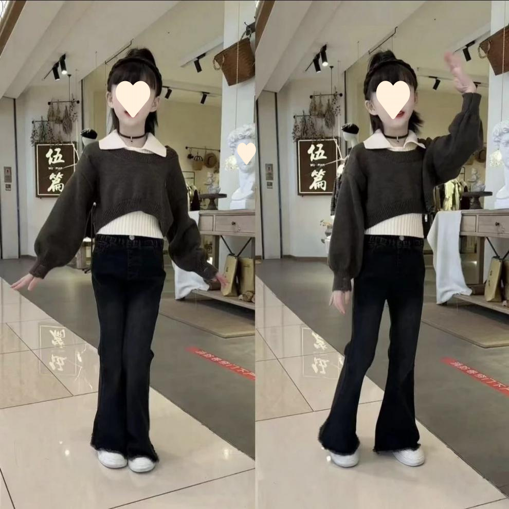 2025 새로운 소녀들의 봄과 가을 한국 스타일 유행 셔츠 칼라 스웨터 2 피스 데님 플라 바지 세트 중 · 대형 어린이스토어 가기