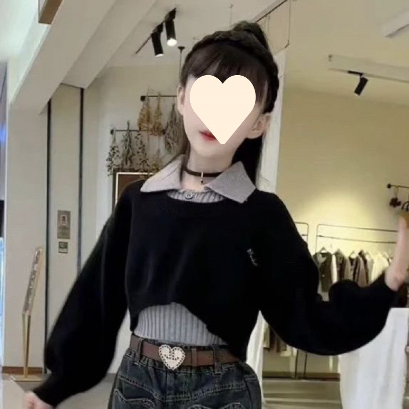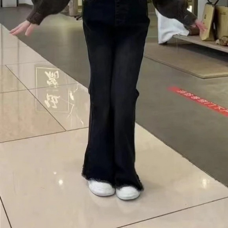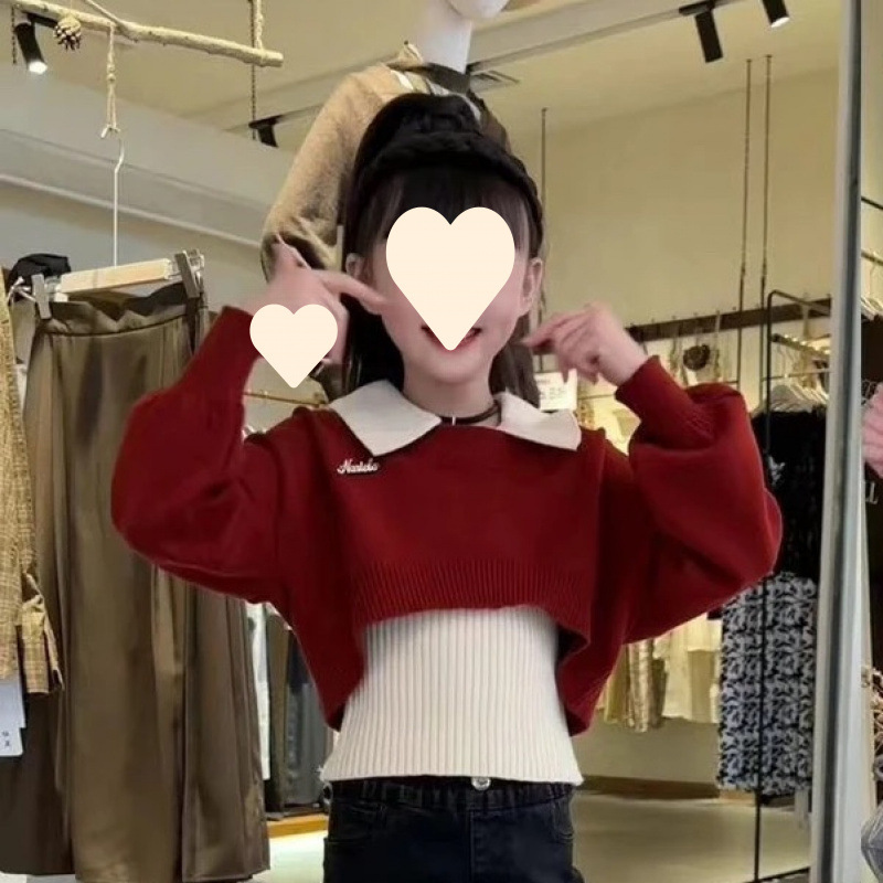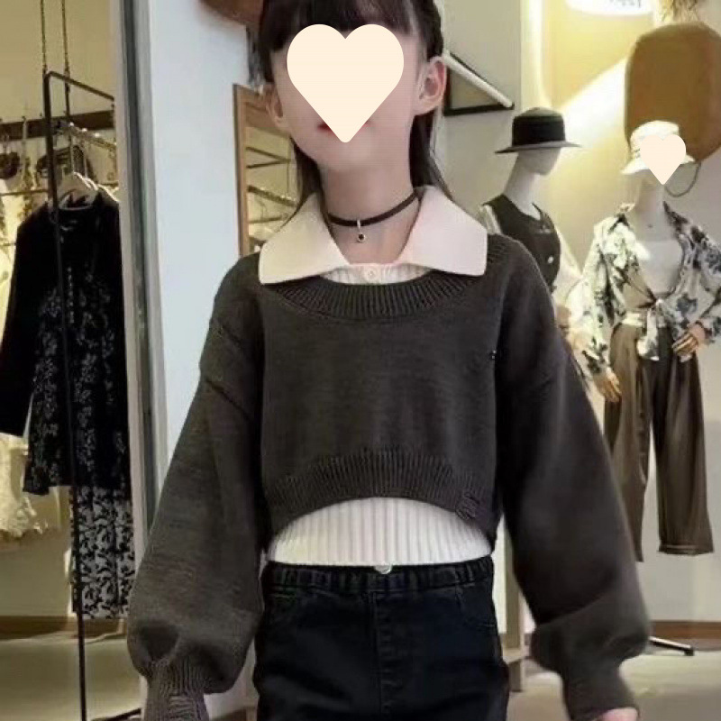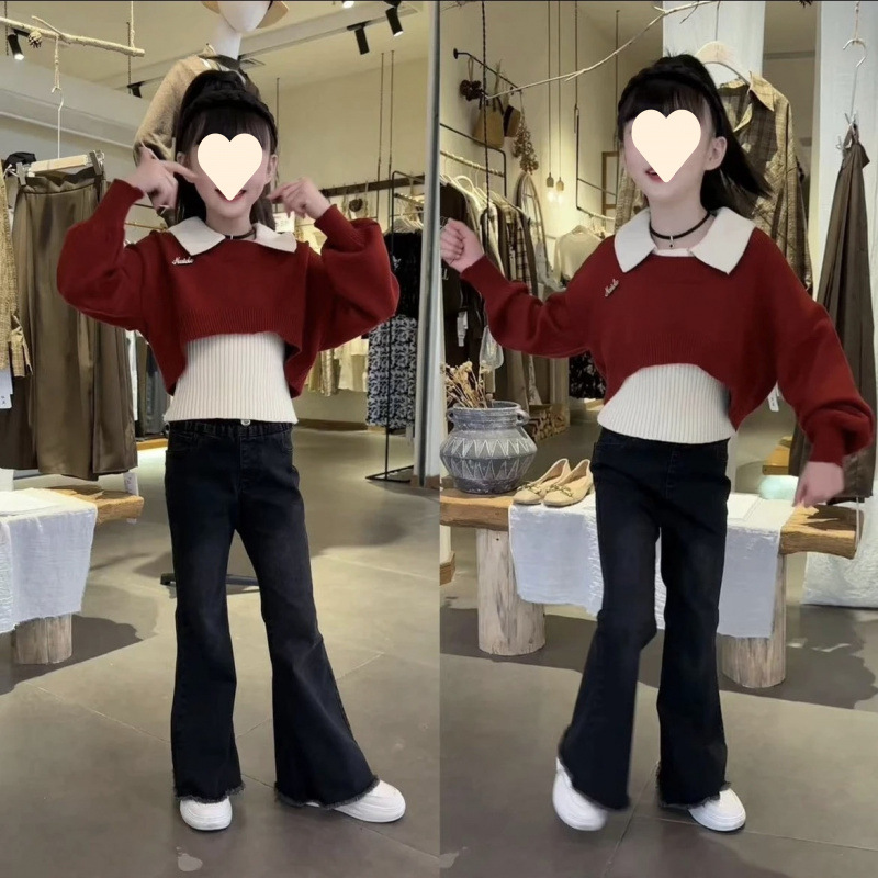 2025 새로운 소녀들의 봄과 가을 한국 스타일 유행 셔츠 칼라 스웨터 2 피스 데님 플라 바지 세트 중 · 대형 어린이스토어 가기