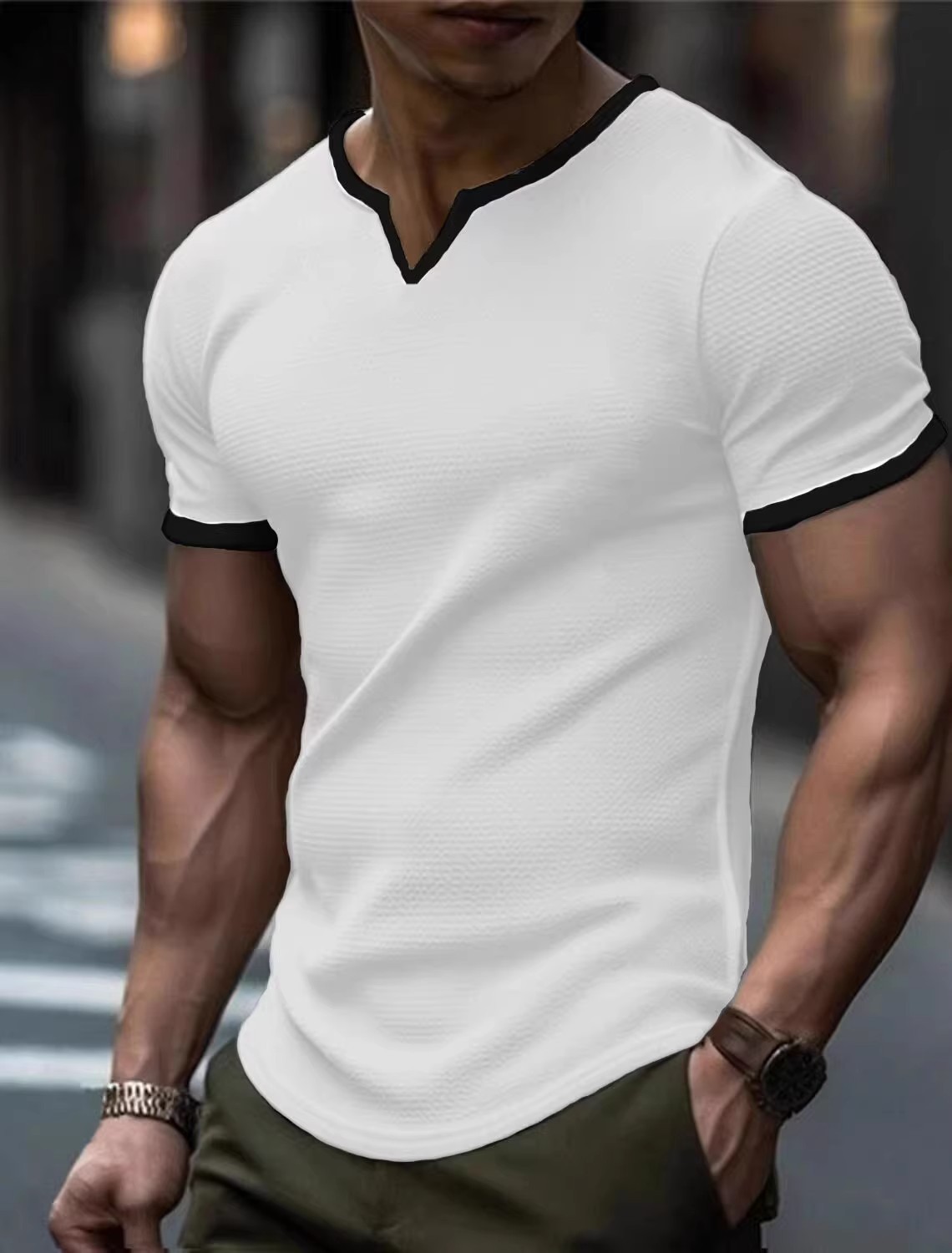 Threaded Sports V-Neck 반팔 남성용 질감 단색 줄무늬 슬림 핏 탄성 퀵 드라이 러닝 피트니스 티셔츠 베이스 셔츠