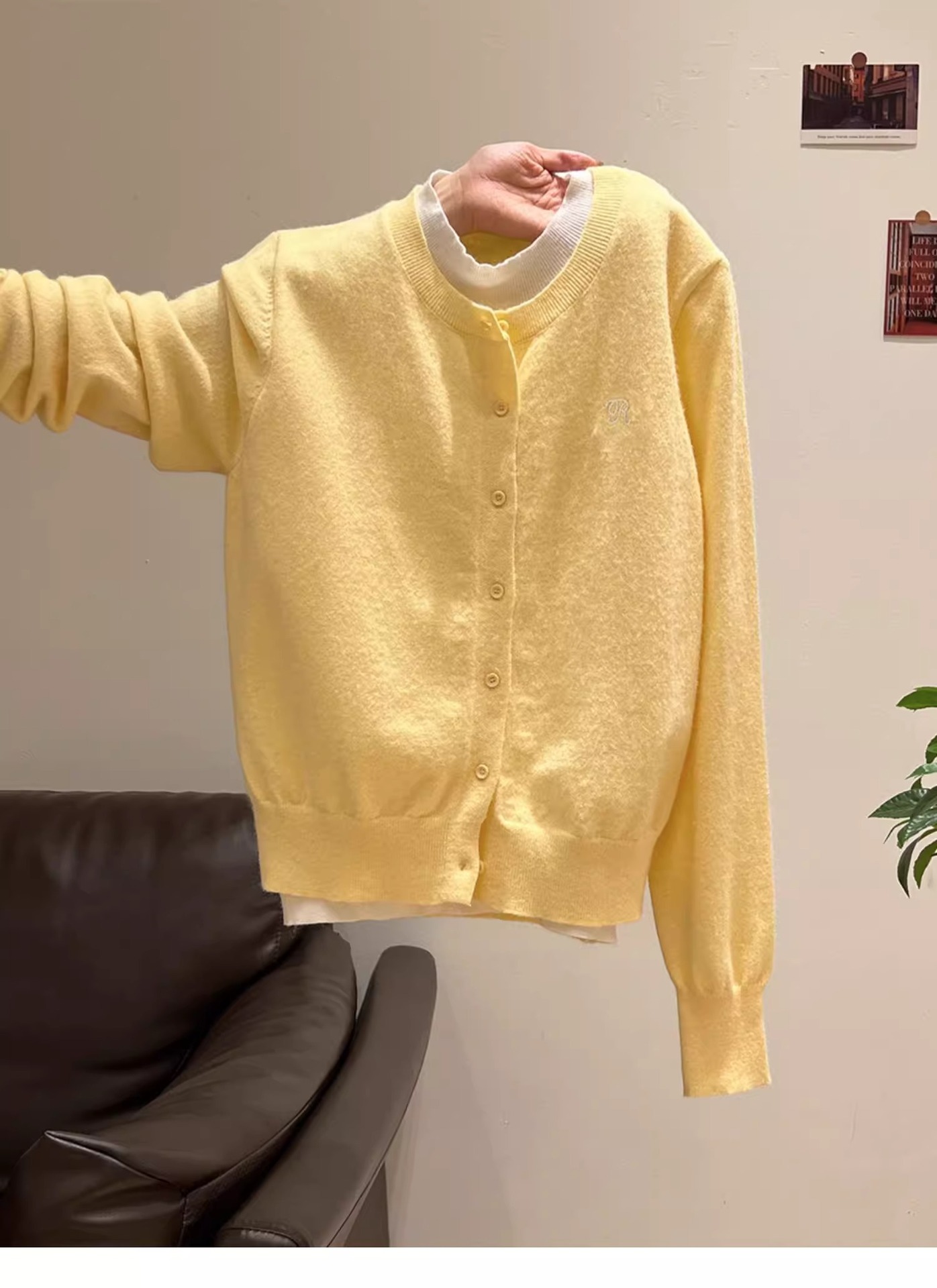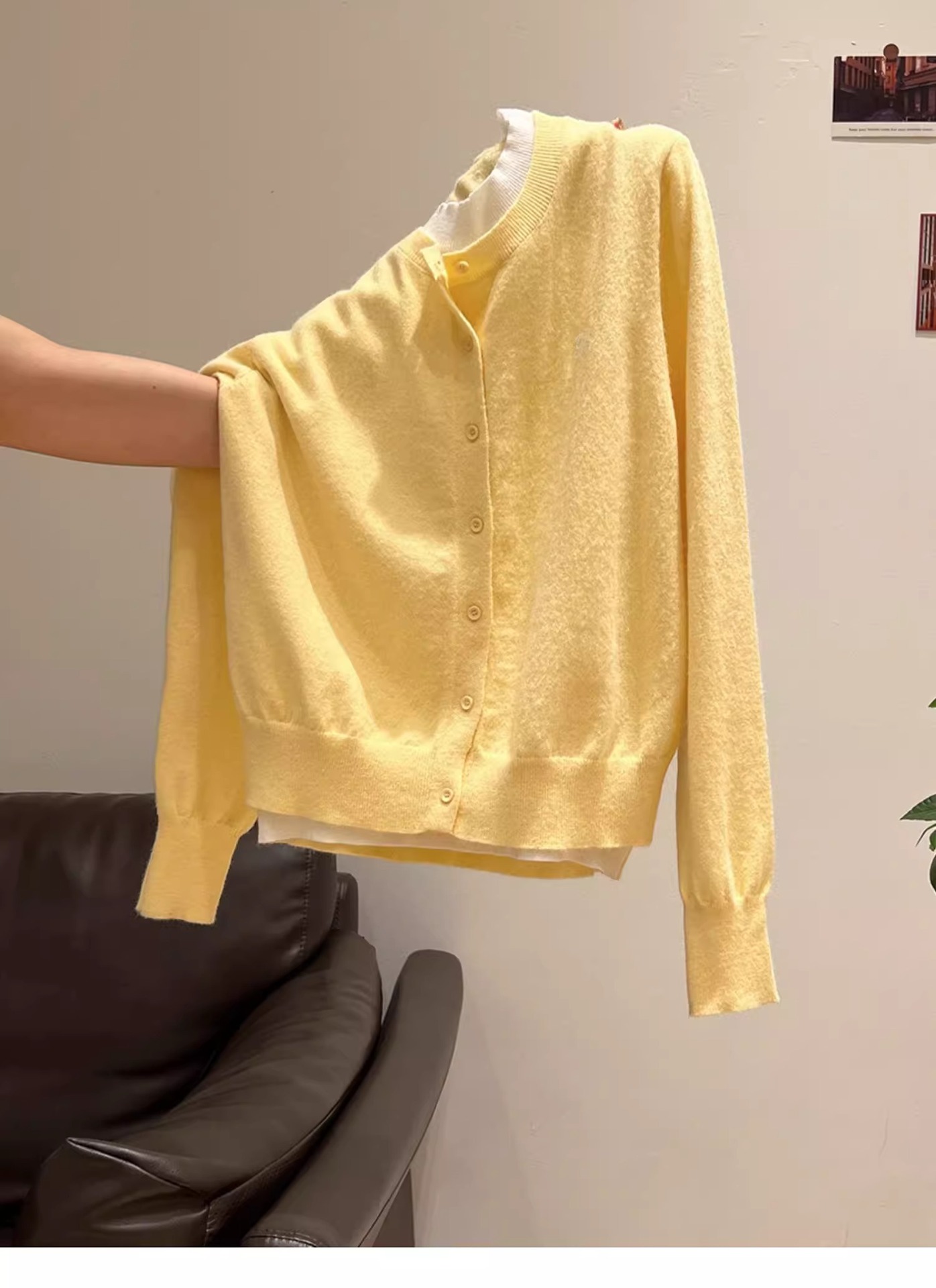 우유 노란색 니트웨어 여성의 봄 얇은 외부 2025 새로운 봄과 가을 스웨터 카디건 코트 가짜 투피스 탑스토어 가기