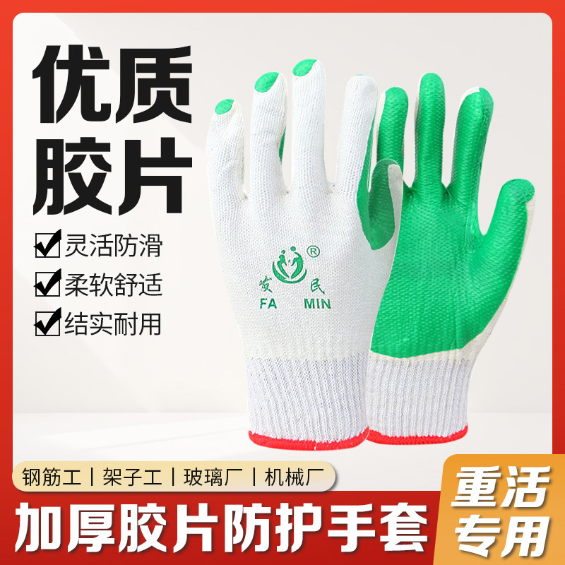 Famin 녹색 접착제 흰색 원사 소프트 필름 도매 내마모성 미끄럼 방지 현장 취급 기계 유지 보수 노동 보호 장갑스토어 가기