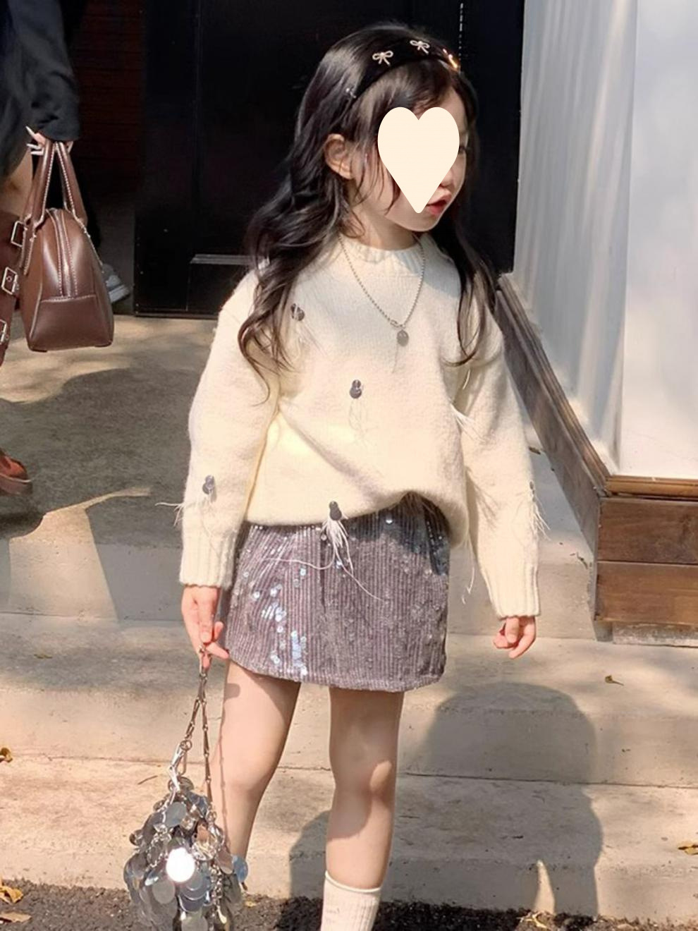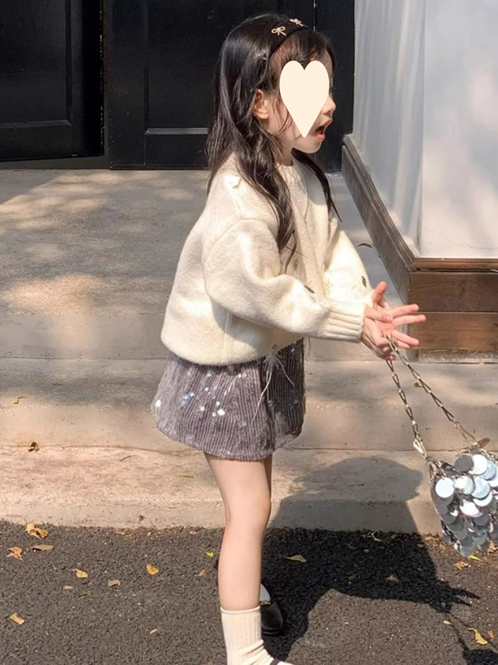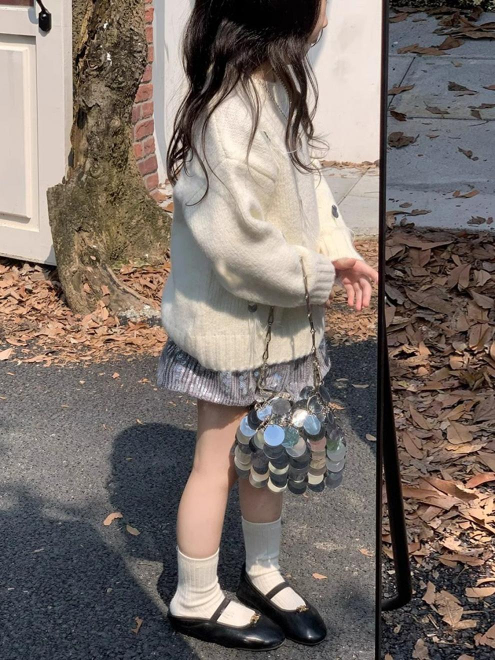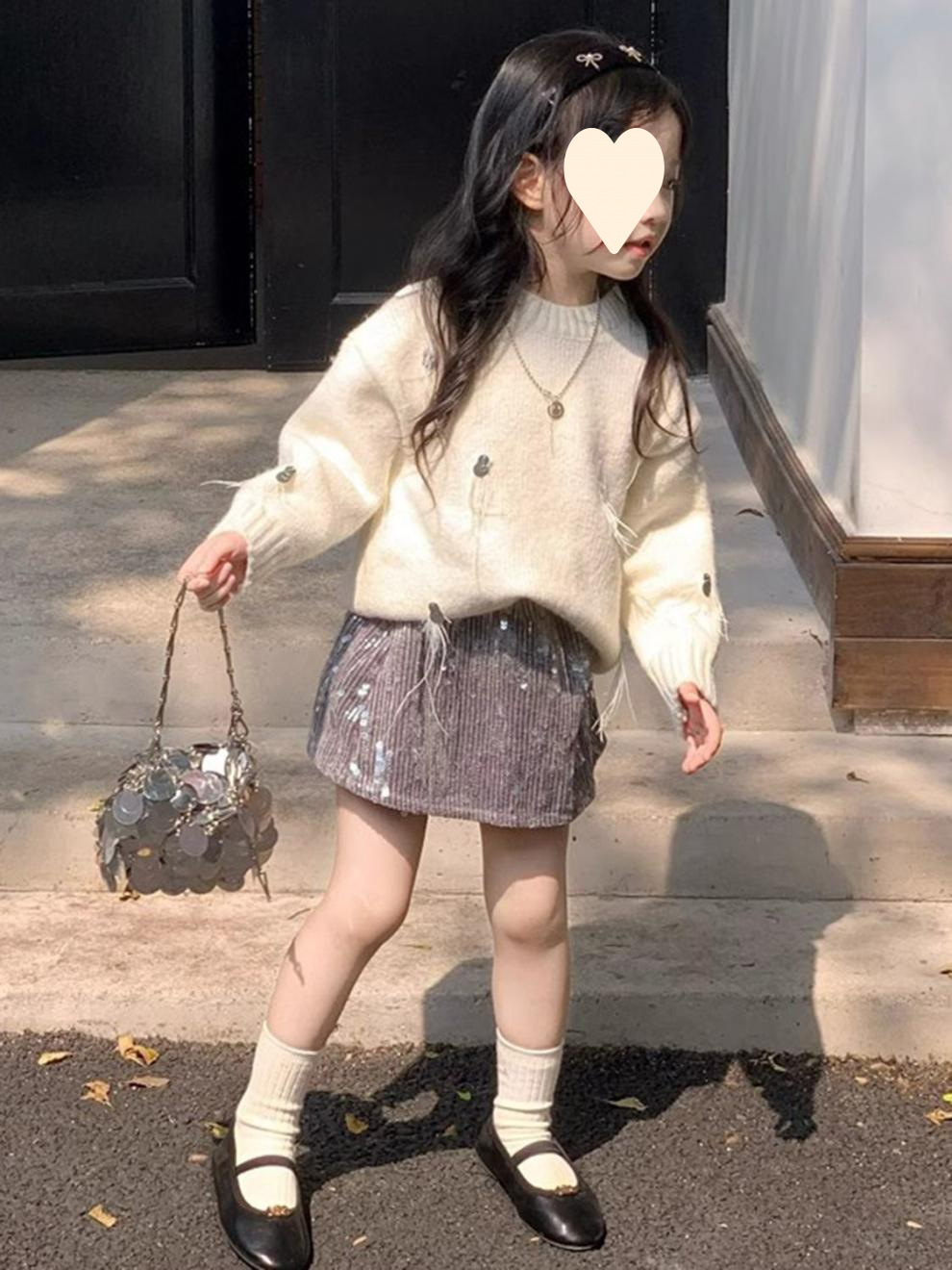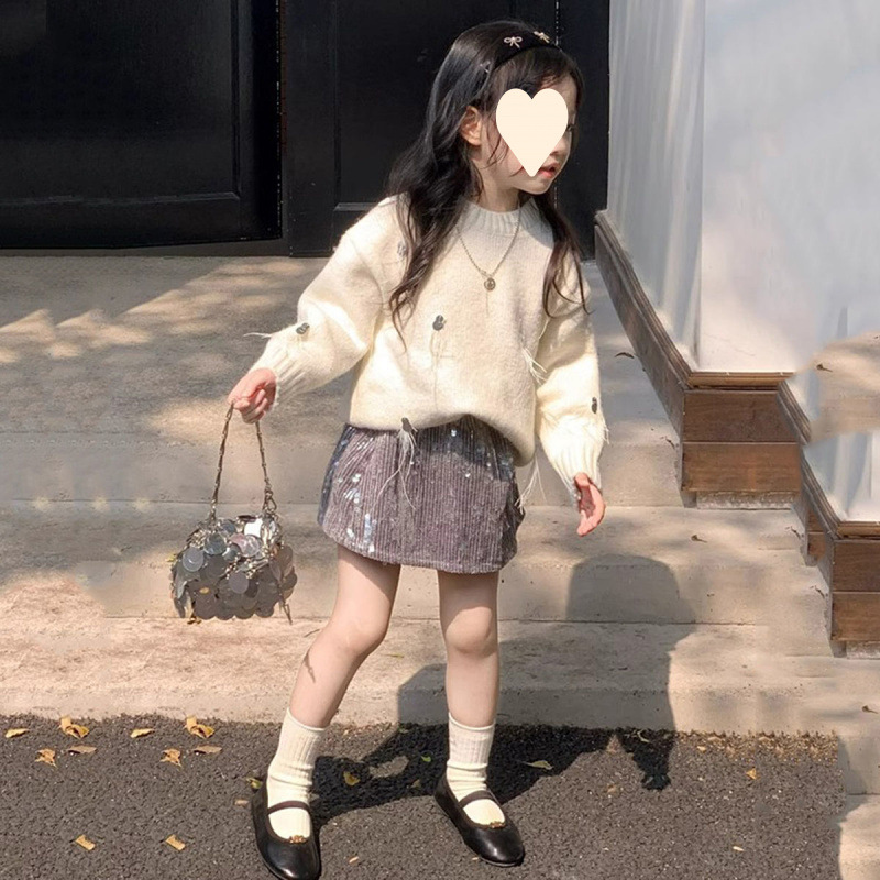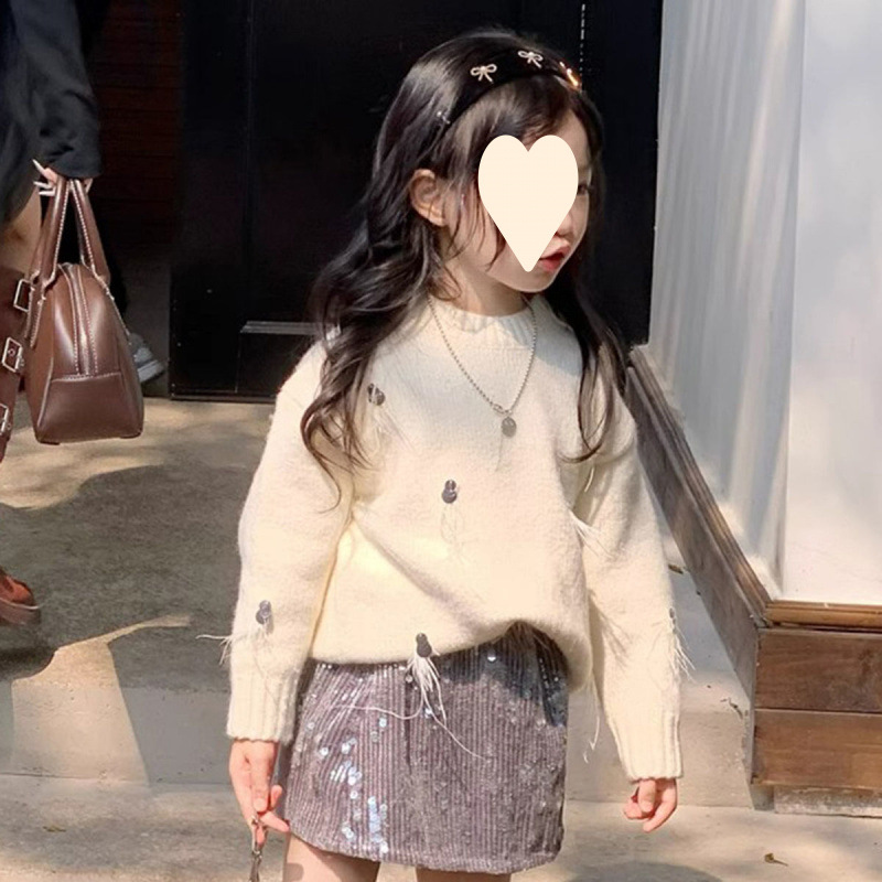 한국 아동복 2025 봄 새 쌀 화이트 프린지 스팽글 스웨터 소녀 패션 스팽글 스커트 투피스 세트스토어 가기