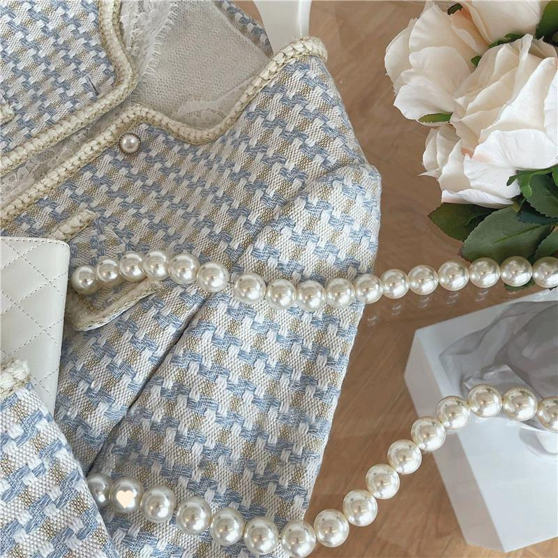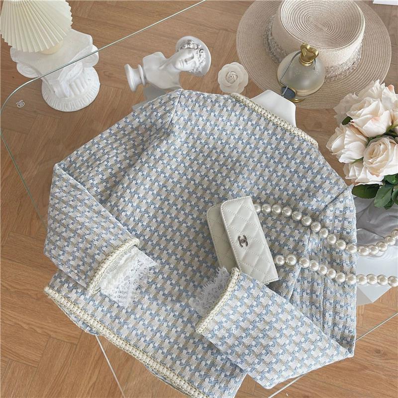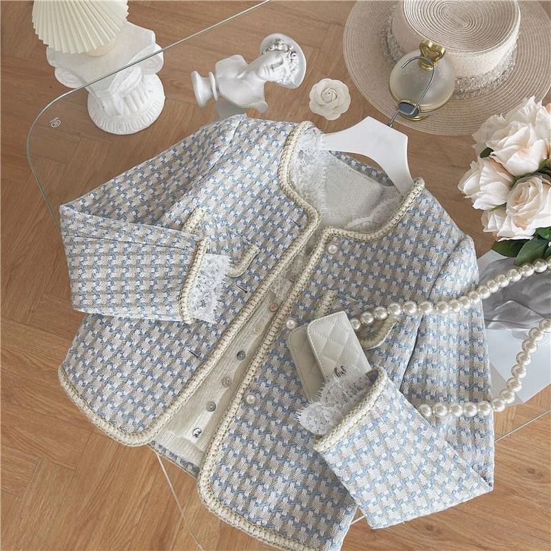 한국 스타일 서양식 2024 소녀 샤넬 스타일 재킷 화이트 셔츠 데님 플라 바지 3 조각 세트 봄과 가을 새 세트스토어 가기